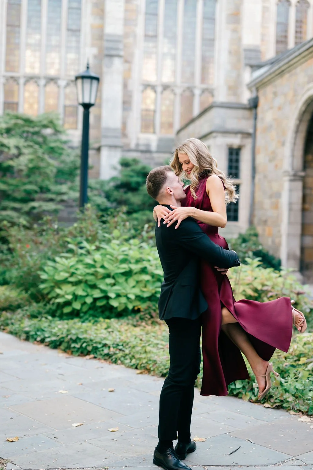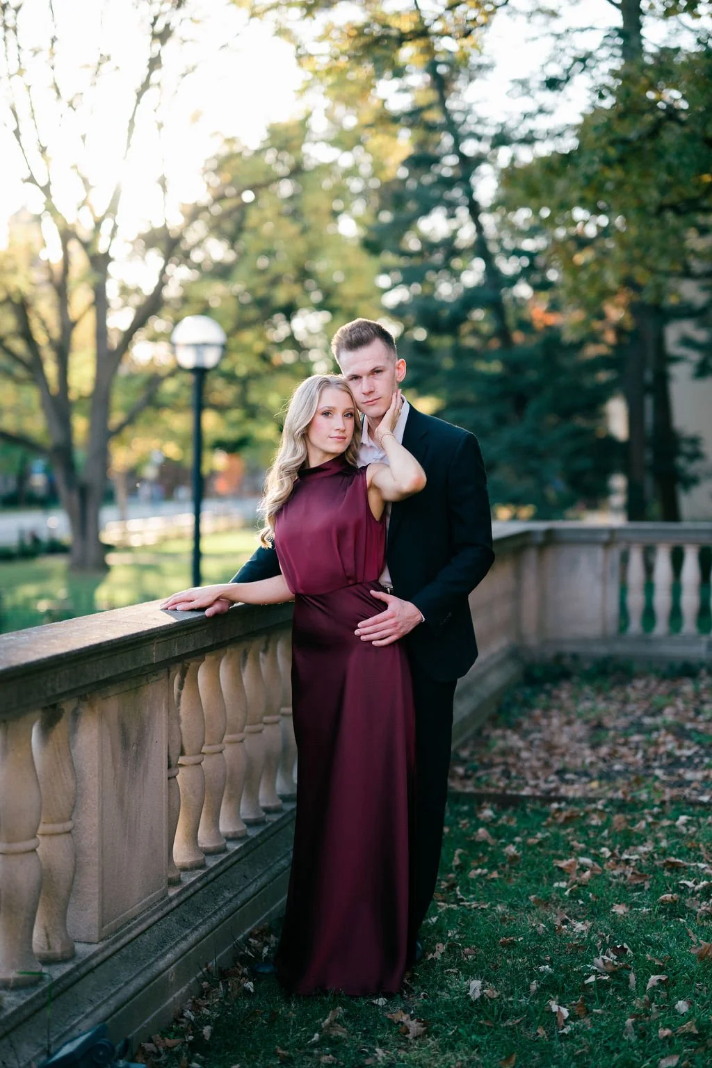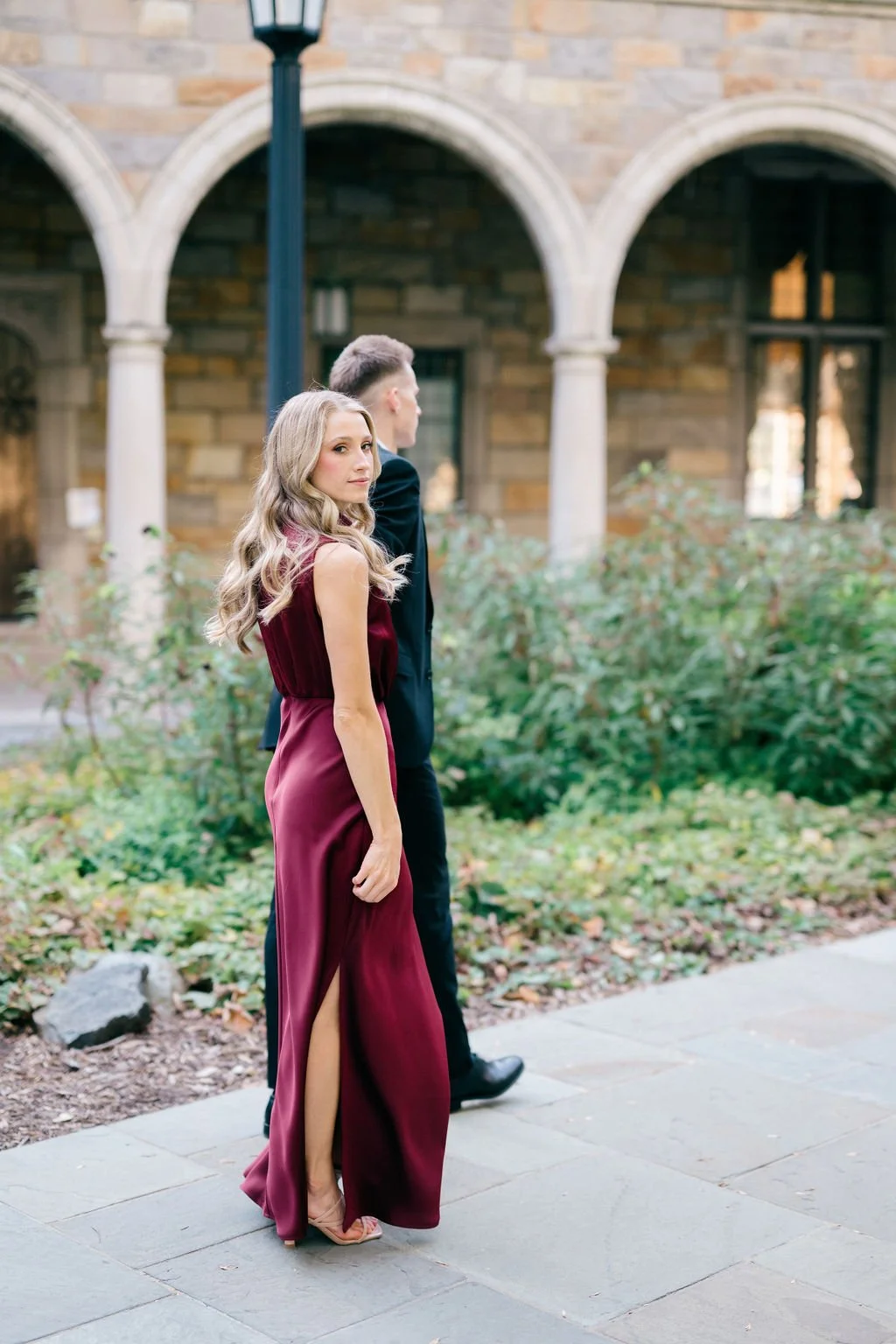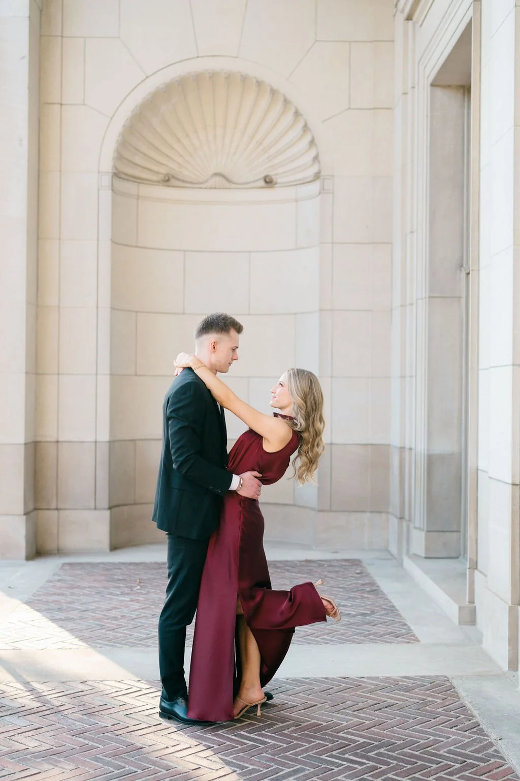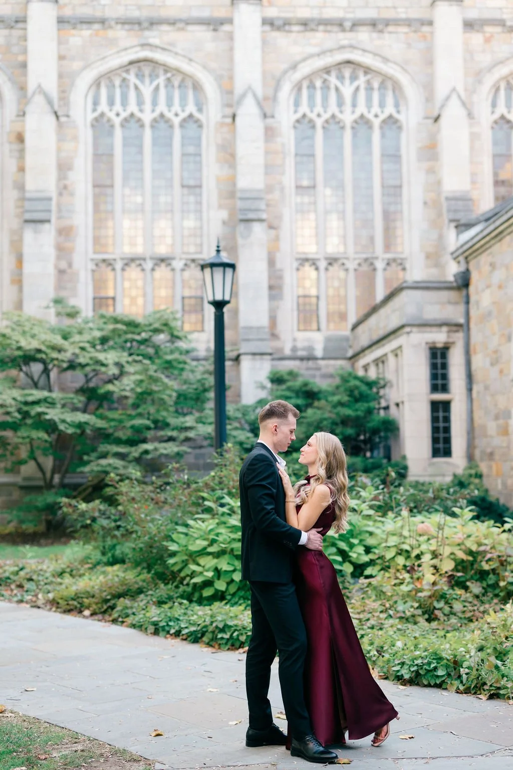 When preparing for what to wear to an engagement session, many brides choose to wear white. However, I love it when brides choose to to wear something that really pops against the background of the location they chose. That is exactly what what Sydney did. She chose to wear a wine colored dress, which really popped against the architecture of the Law Quad in Ann Arbor. It also perfectly matched the color of the hydrangeas all around the building! Here are some of my favorite photos from Justin and Sydney’s engagement session in Ann Arbor, and take note of Sydney’s dress when planning your own outfits!