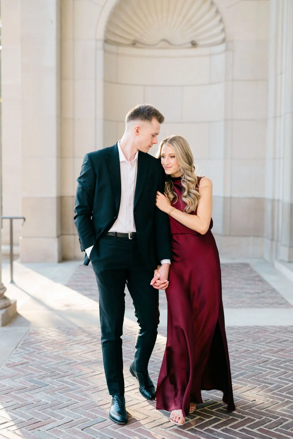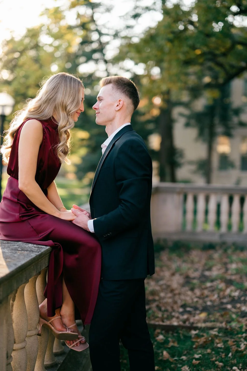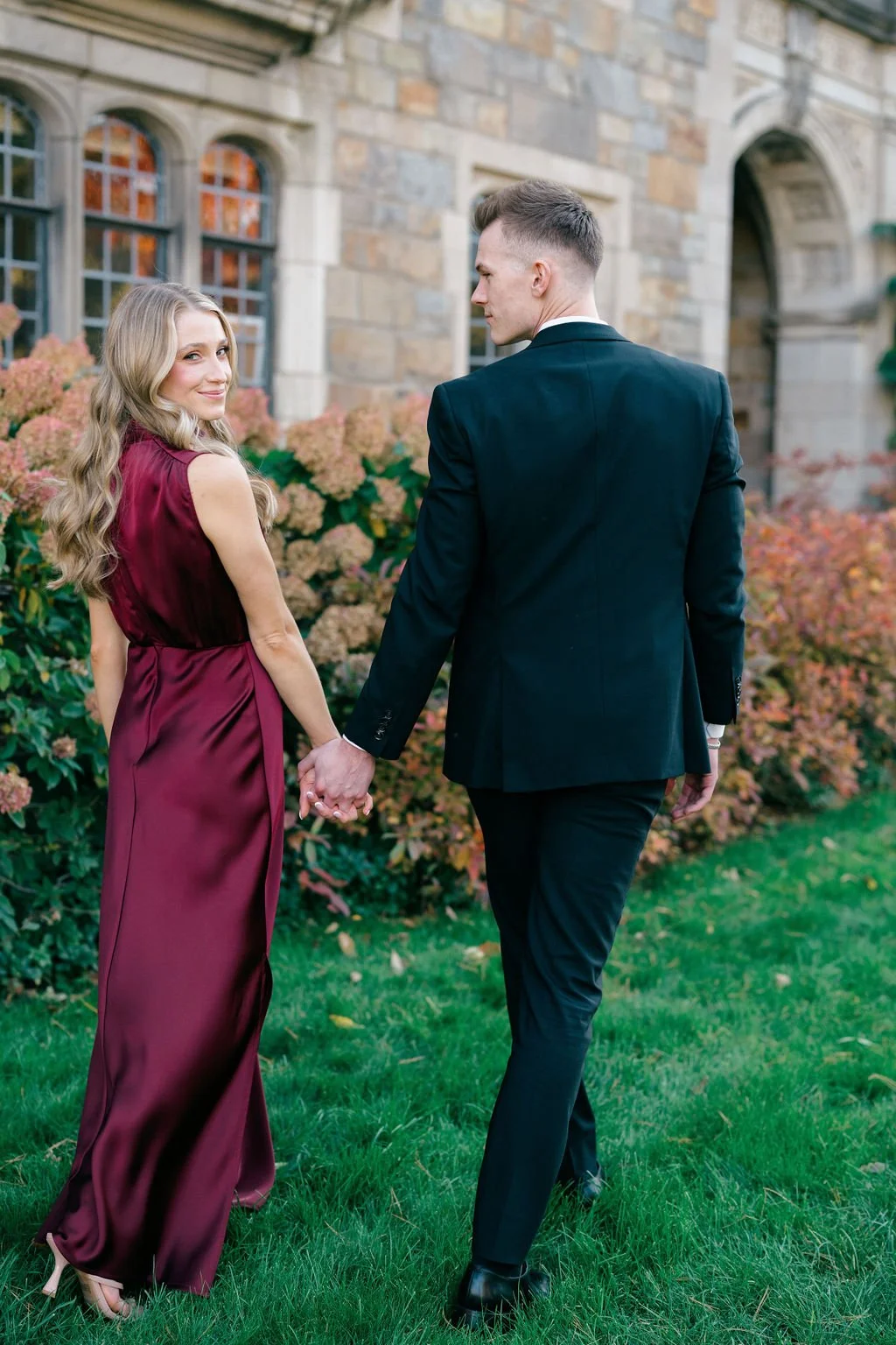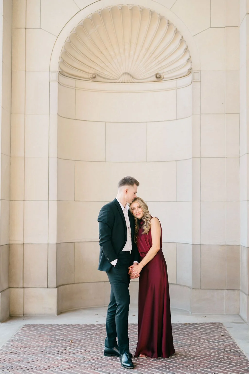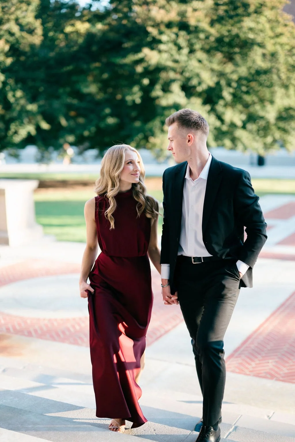 When preparing for what to wear to an engagement session, many brides choose to wear white. However, I love it when brides choose to to wear something that really pops against the background of the location they chose. That is exactly what what Sydney did. She chose to wear a wine colored dress, which really popped against the architecture of the Law Quad in Ann Arbor. It also perfectly matched the color of the hydrangeas all around the building! Here are some of my favorite photos from Justin and Sydney’s engagement session in Ann Arbor, and take note of Sydney’s dress when planning your own outfits!