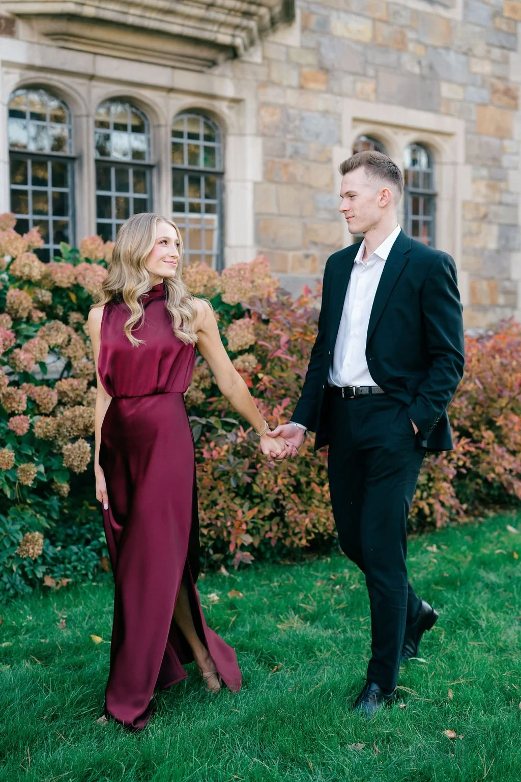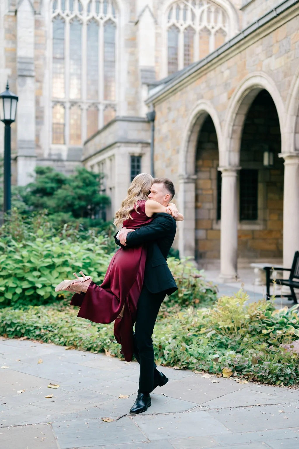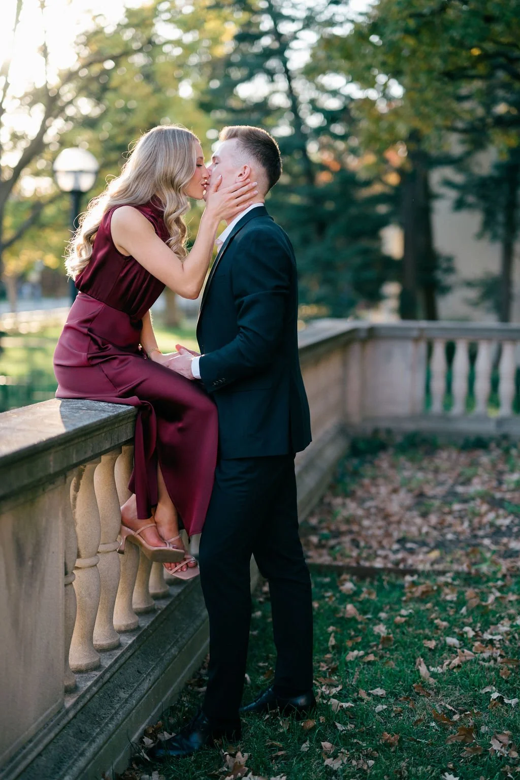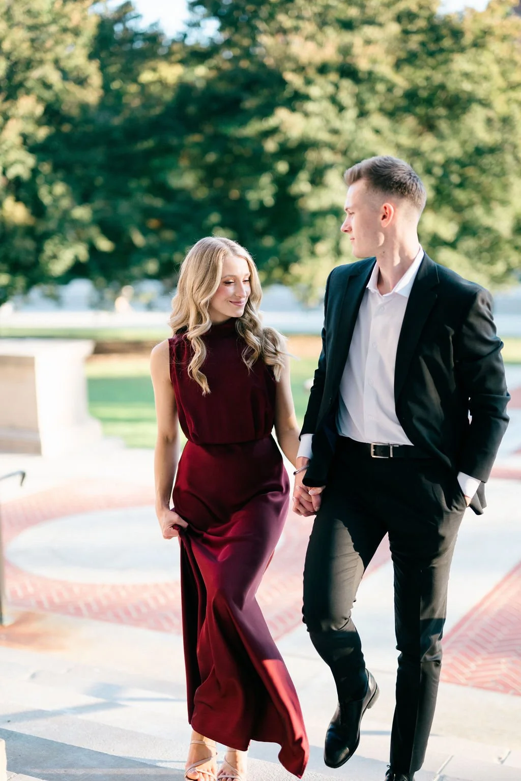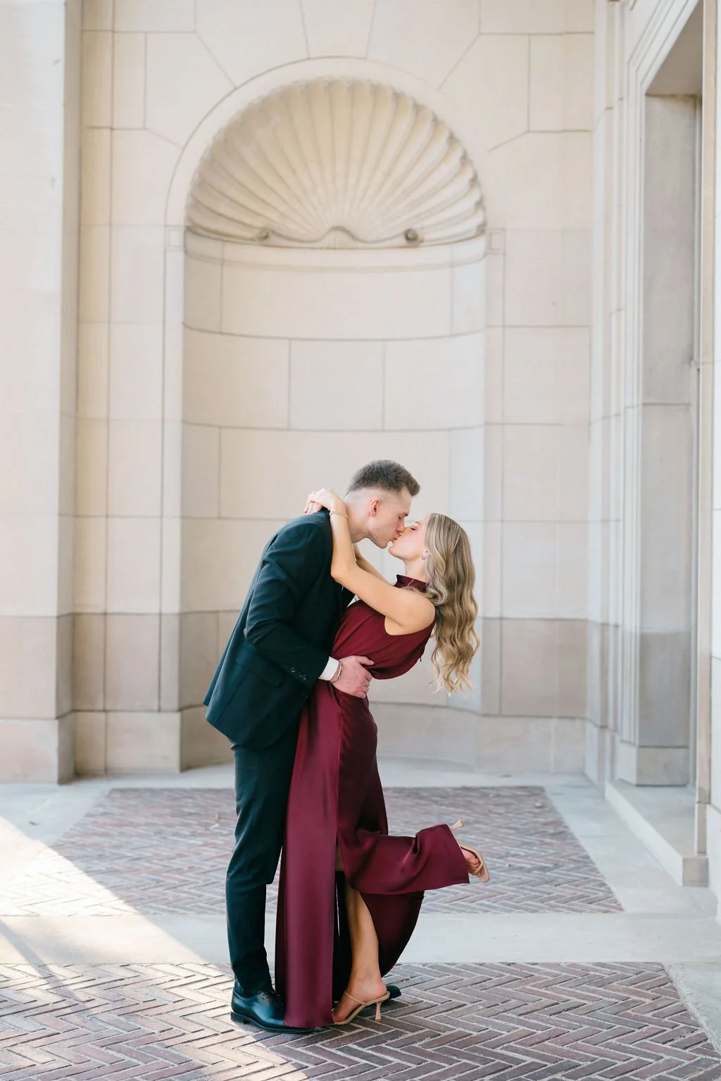 When preparing for what to wear to an engagement session, many brides choose to wear white. However, I love it when brides choose to to wear something that really pops against the background of the location they chose. That is exactly what what Sydney did. She chose to wear a wine colored dress, which really popped against the architecture of the Law Quad in Ann Arbor. It also perfectly matched the color of the hydrangeas all around the building! Here are some of my favorite photos from Justin and Sydney’s engagement session in Ann Arbor, and take note of Sydney’s dress when planning your own outfits!
