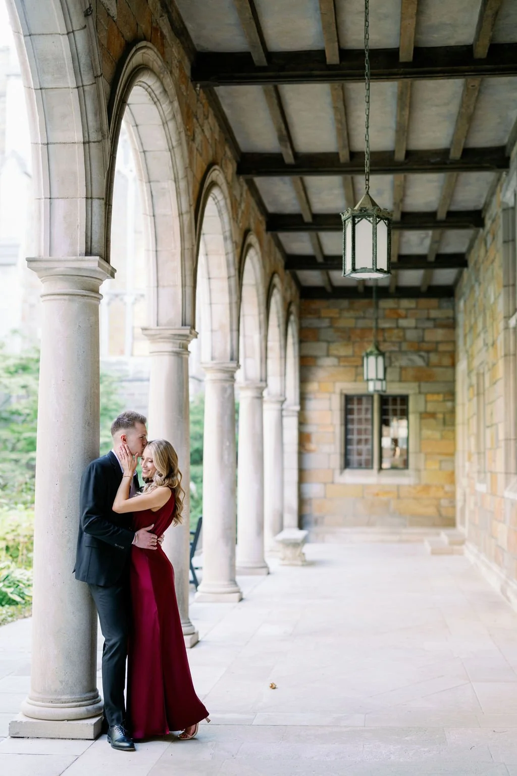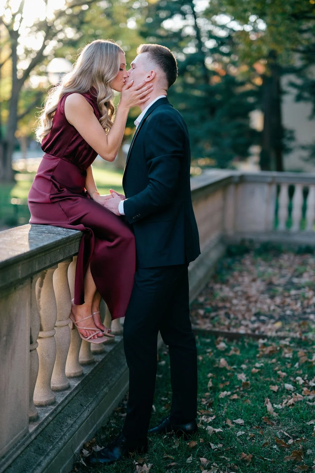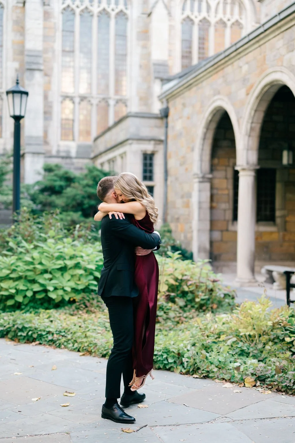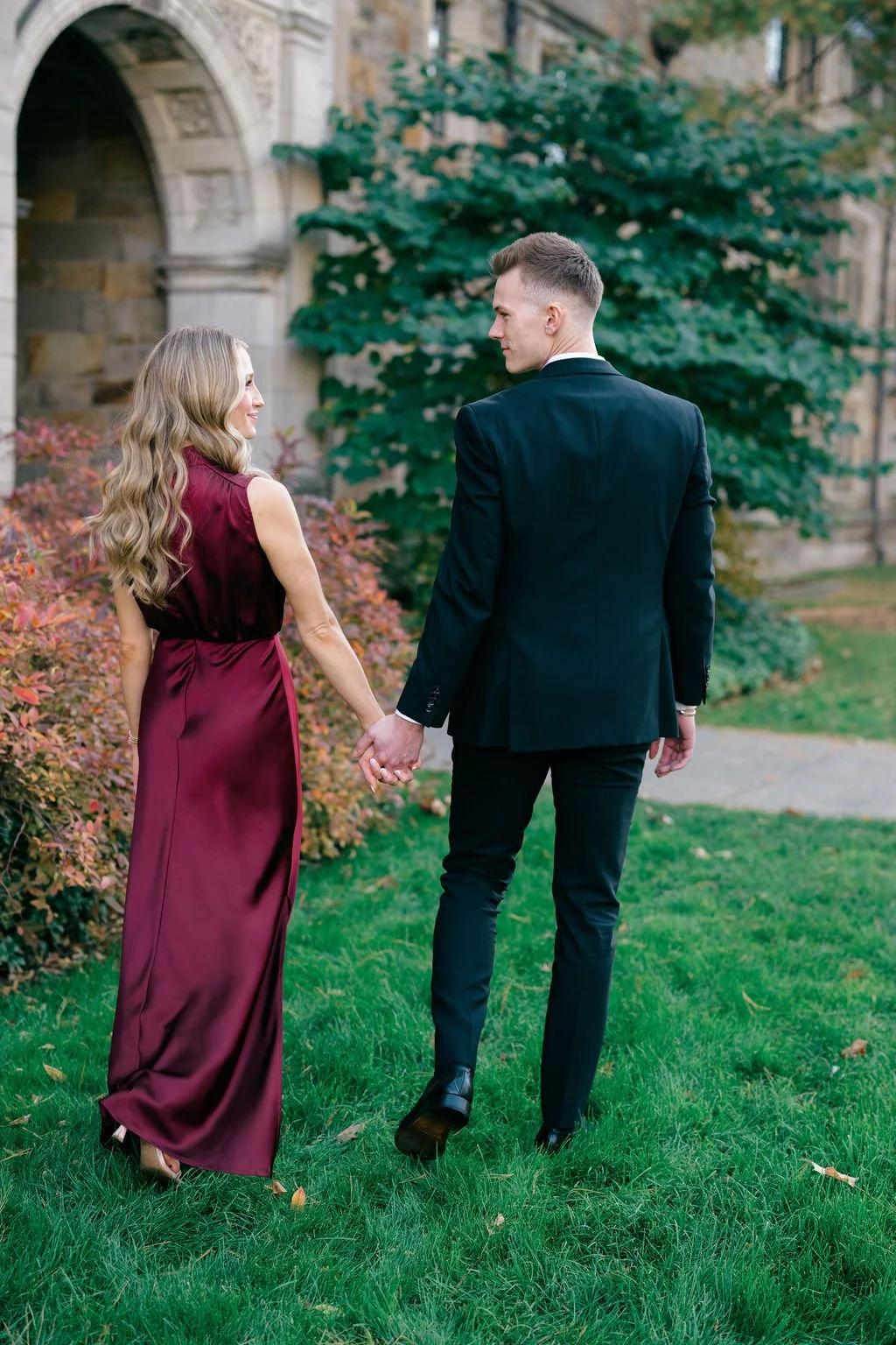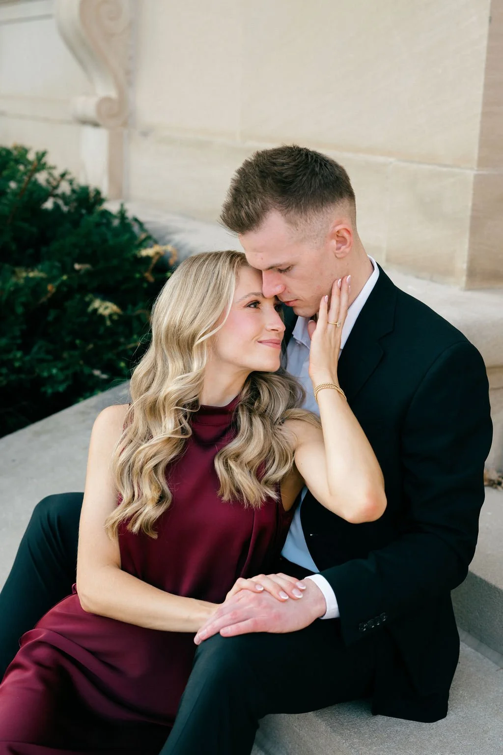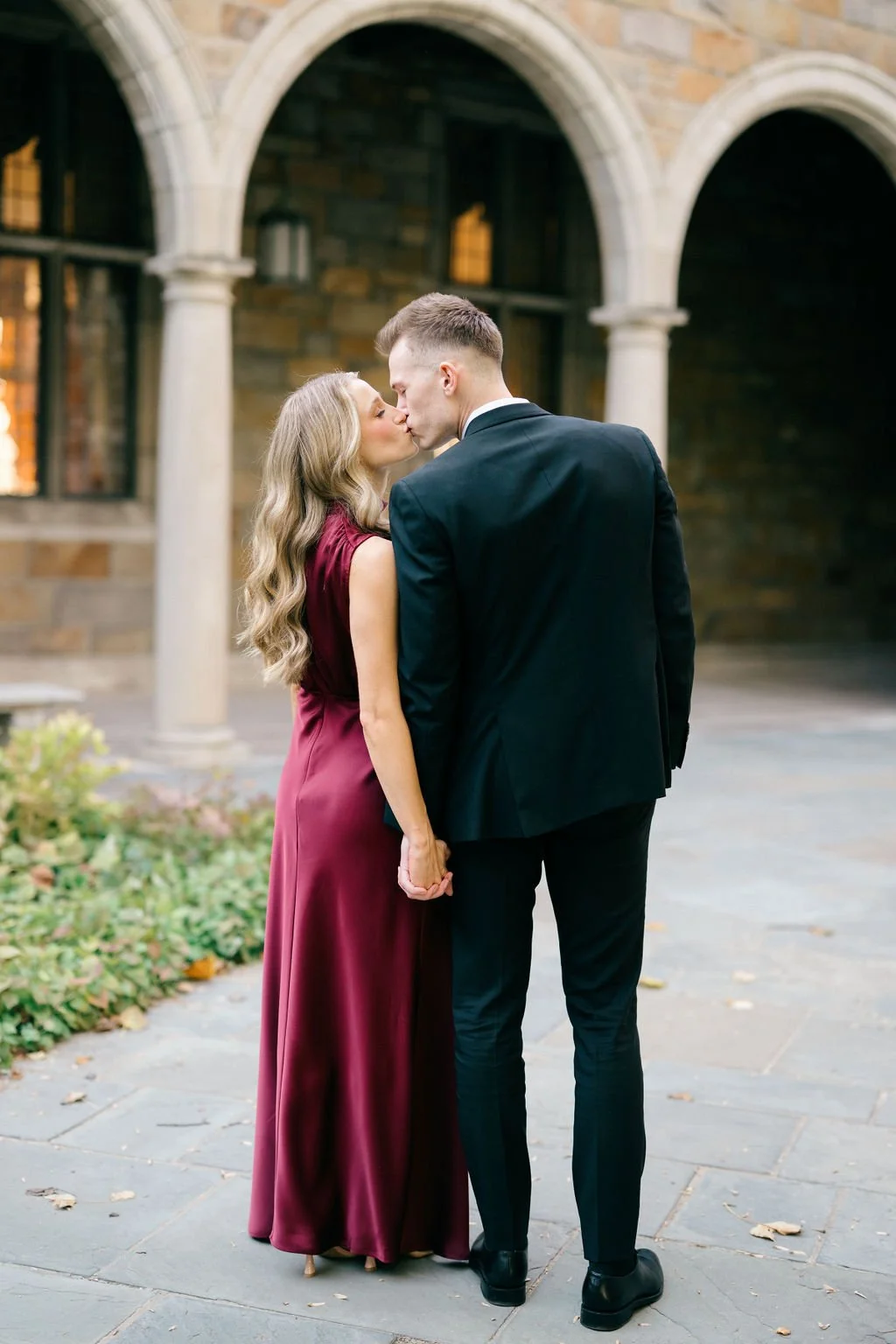 When preparing for what to wear to an engagement session, many brides choose to wear white. However, I love it when brides choose to to wear something that really pops against the background of the location they chose. That is exactly what what Sydney did. She chose to wear a wine colored dress, which really popped against the architecture of the Law Quad in Ann Arbor. It also perfectly matched the color of the hydrangeas all around the building! Here are some of my favorite photos from Justin and Sydney’s engagement session in Ann Arbor, and take note of Sydney’s dress when planning your own outfits!