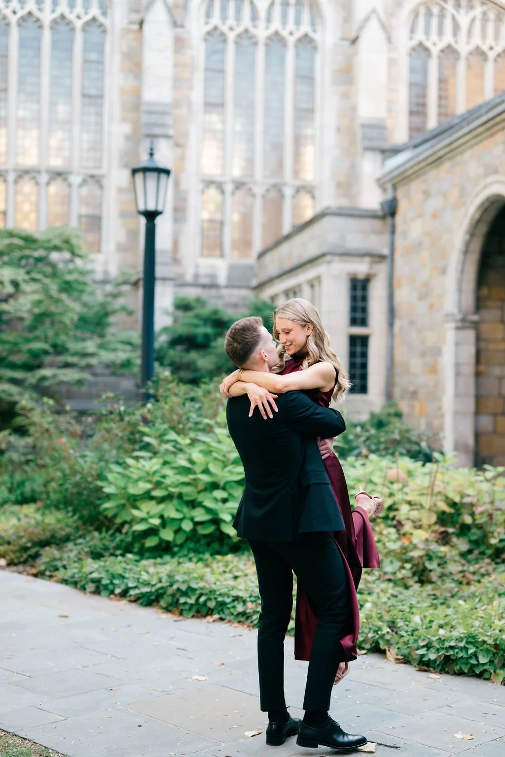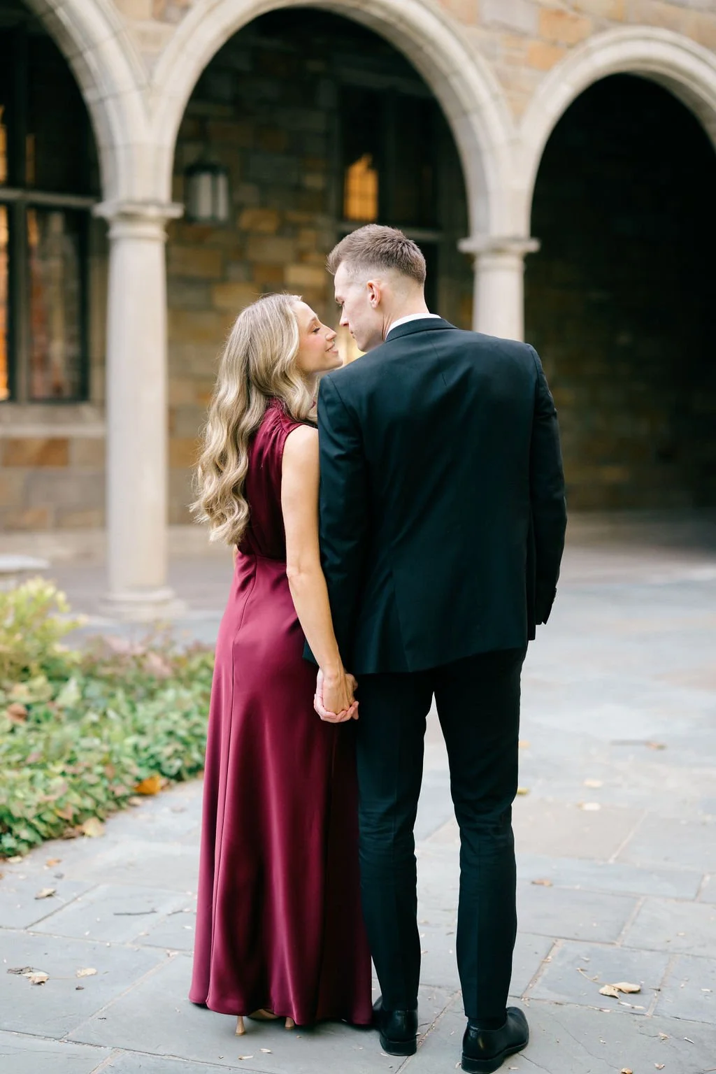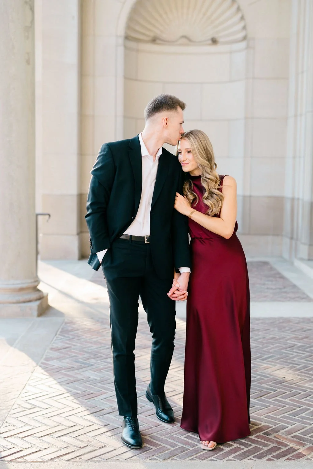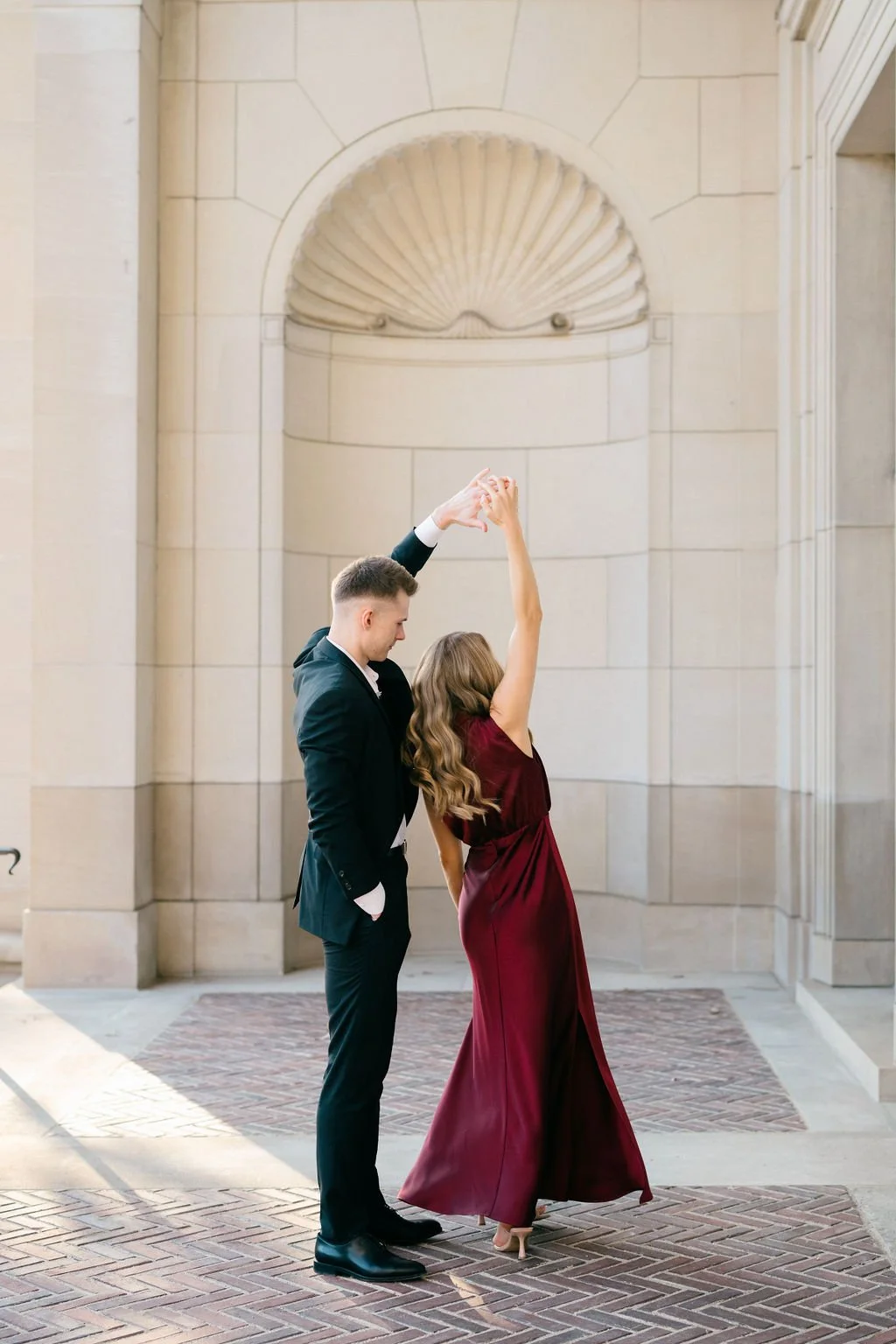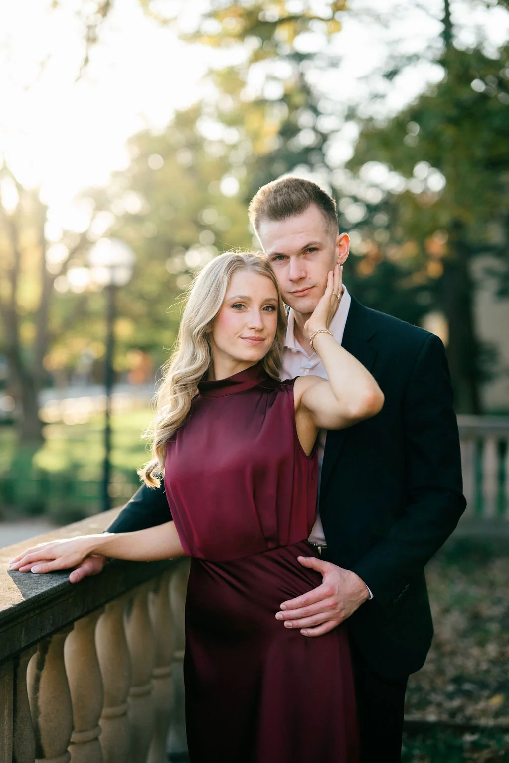 When preparing for what to wear to an engagement session, many brides choose to wear white. However, I love it when brides choose to to wear something that really pops against the background of the location they chose. That is exactly what what Sydney did. She chose to wear a wine colored dress, which really popped against the architecture of the Law Quad in Ann Arbor. It also perfectly matched the color of the hydrangeas all around the building! Here are some of my favorite photos from Justin and Sydney’s engagement session in Ann Arbor, and take note of Sydney’s dress when planning your own outfits!