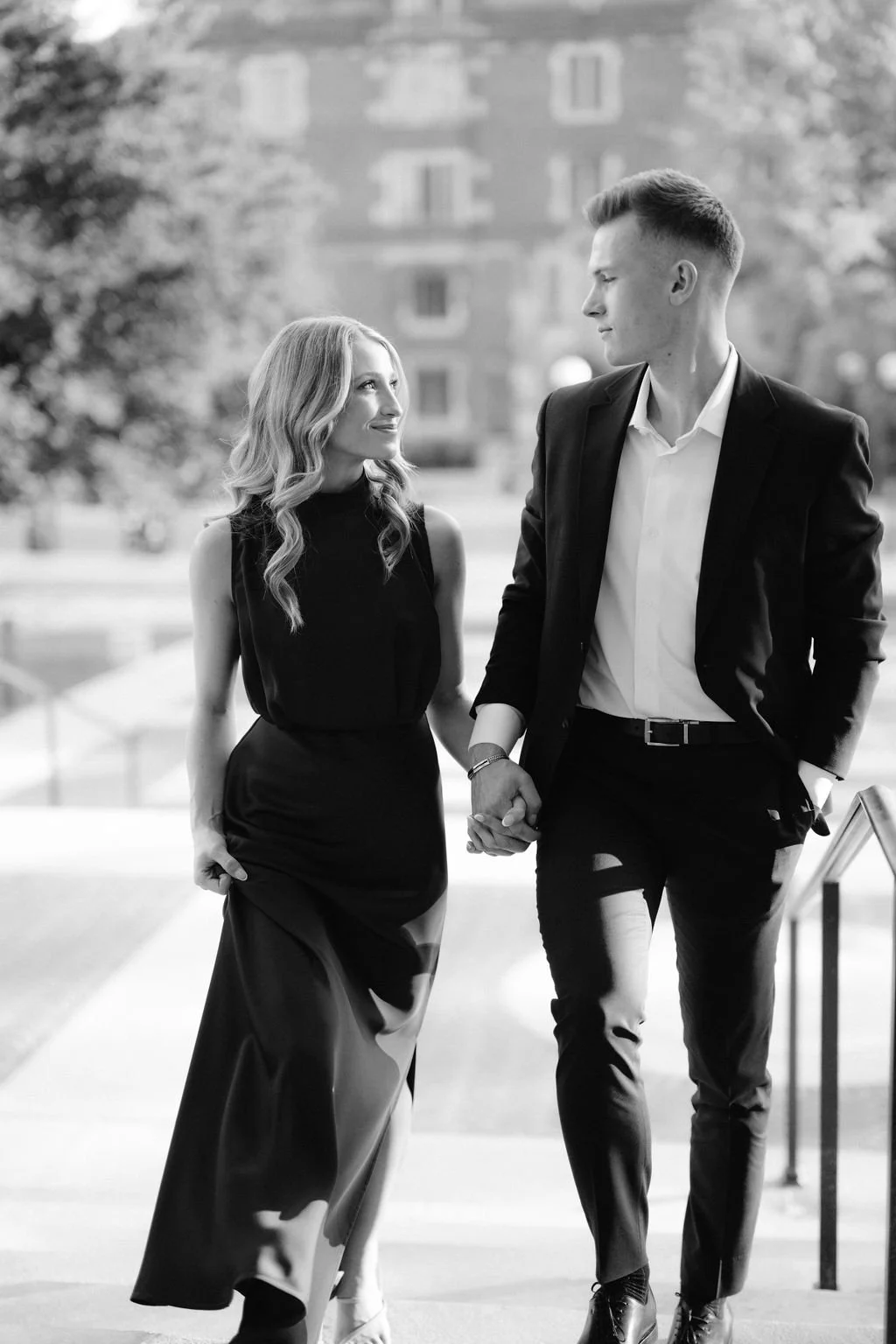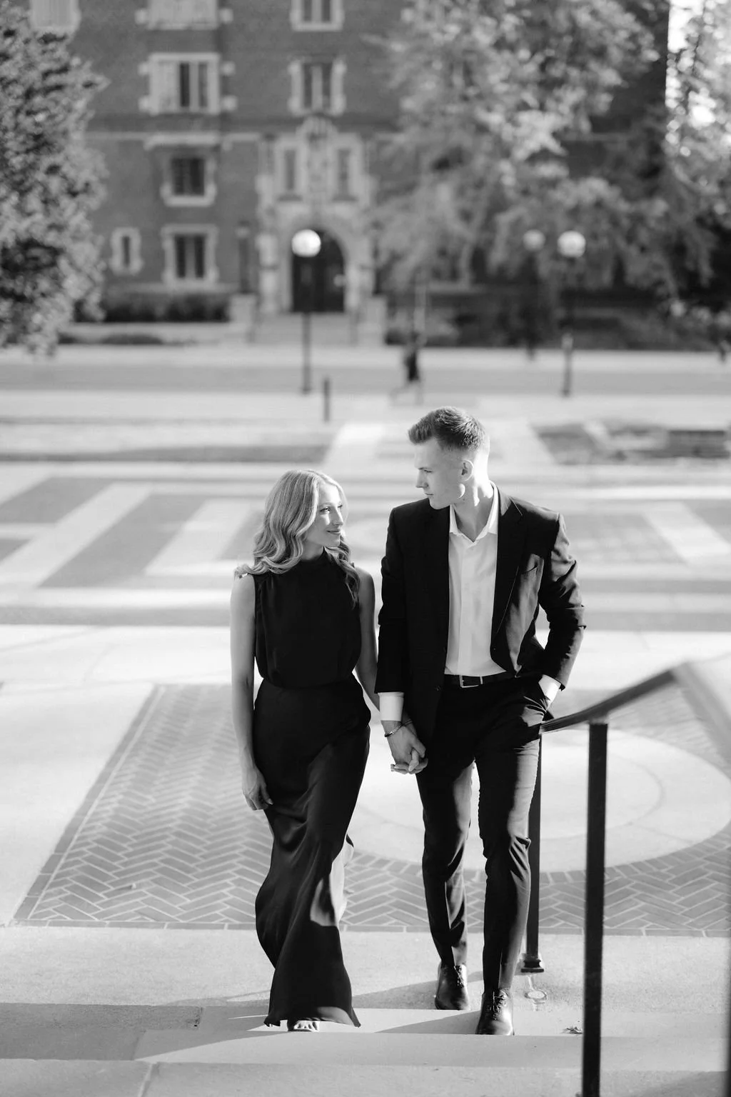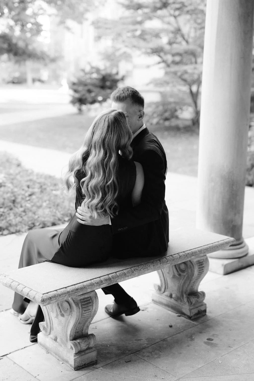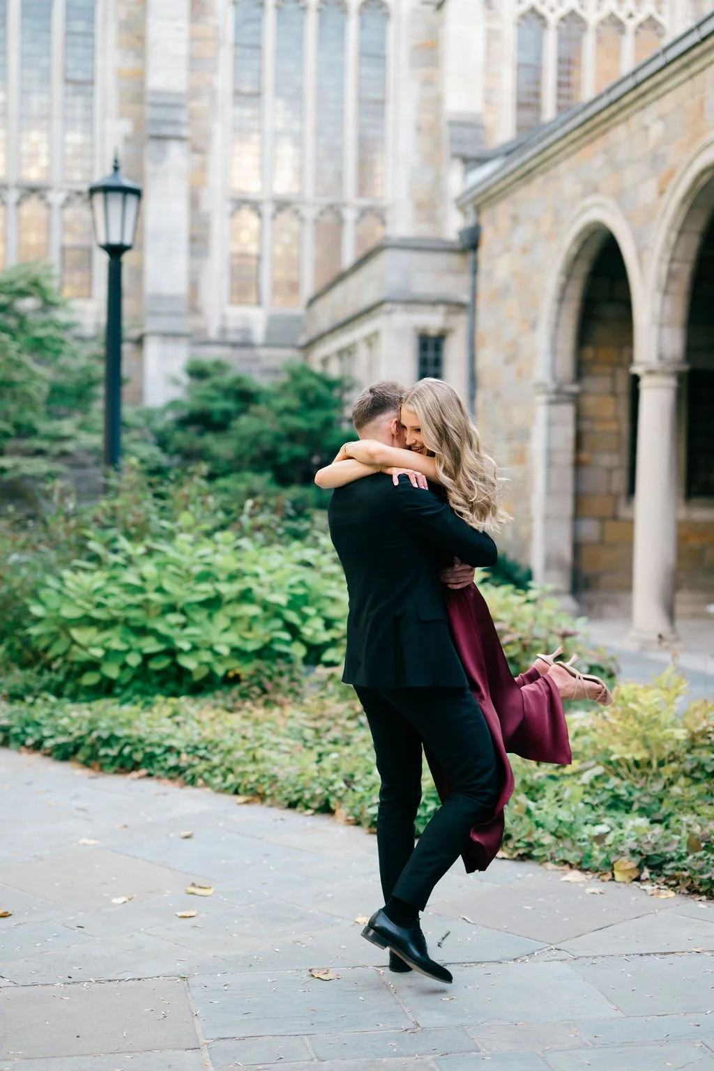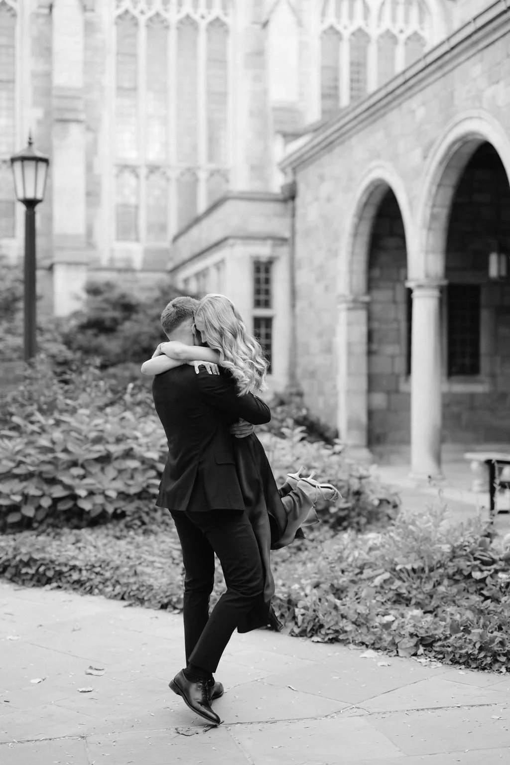 When preparing for what to wear to an engagement session, many brides choose to wear white. However, I love it when brides choose to to wear something that really pops against the background of the location they chose. That is exactly what what Sydney did. She chose to wear a wine colored dress, which really popped against the architecture of the Law Quad in Ann Arbor. It also perfectly matched the color of the hydrangeas all around the building! Here are some of my favorite photos from Justin and Sydney’s engagement session in Ann Arbor, and take note of Sydney’s dress when planning your own outfits!