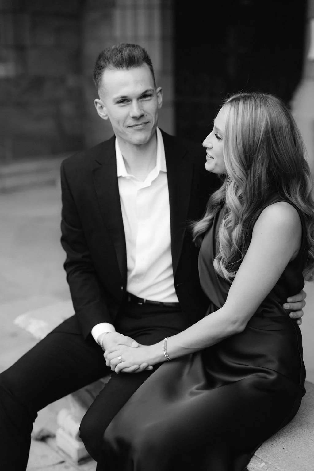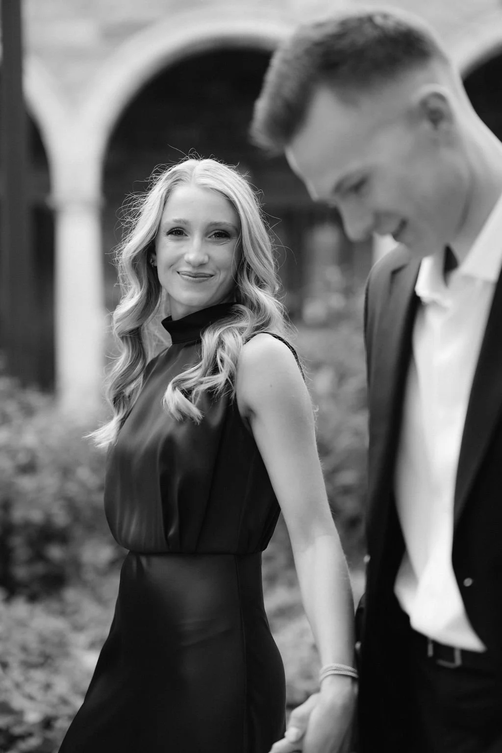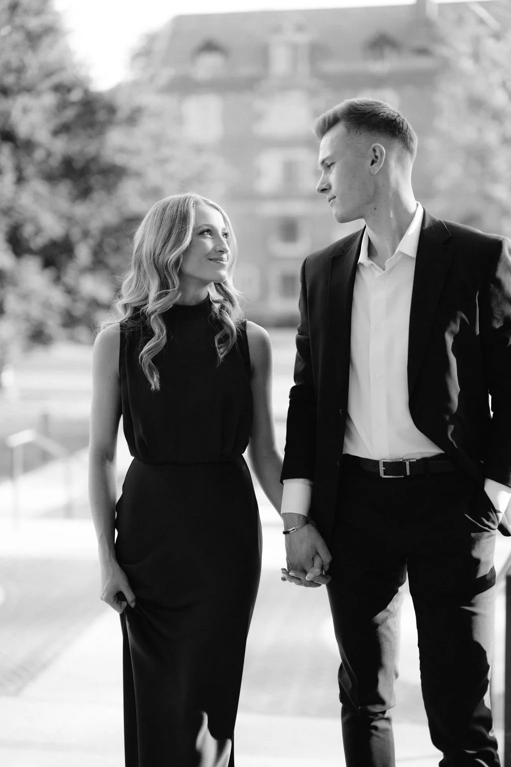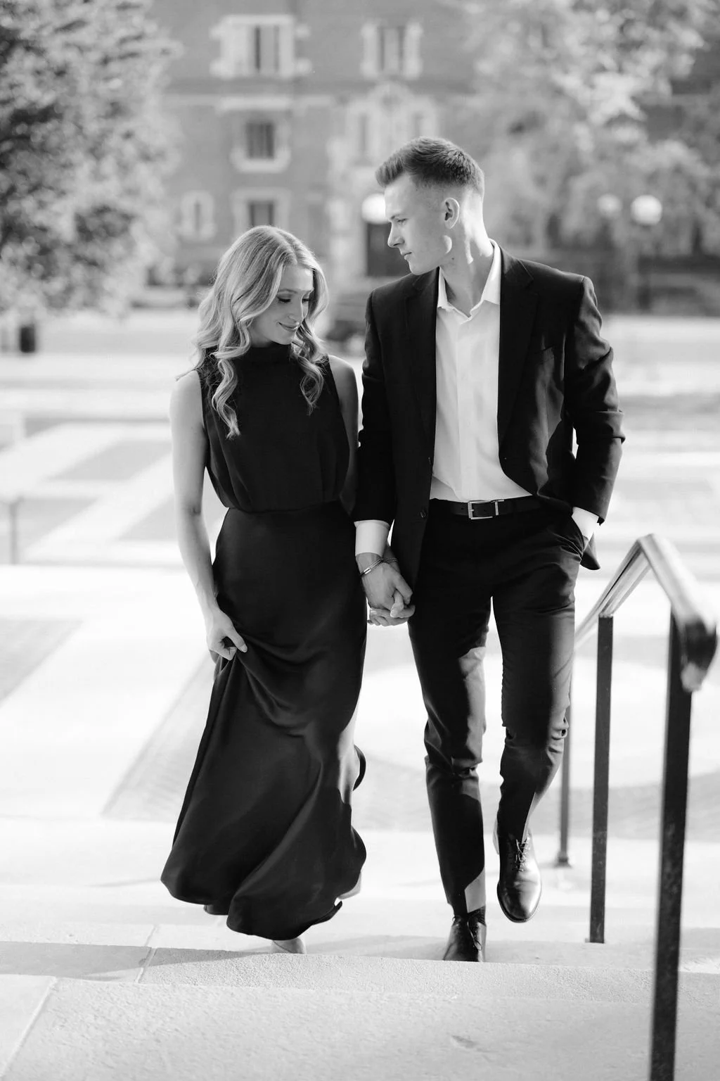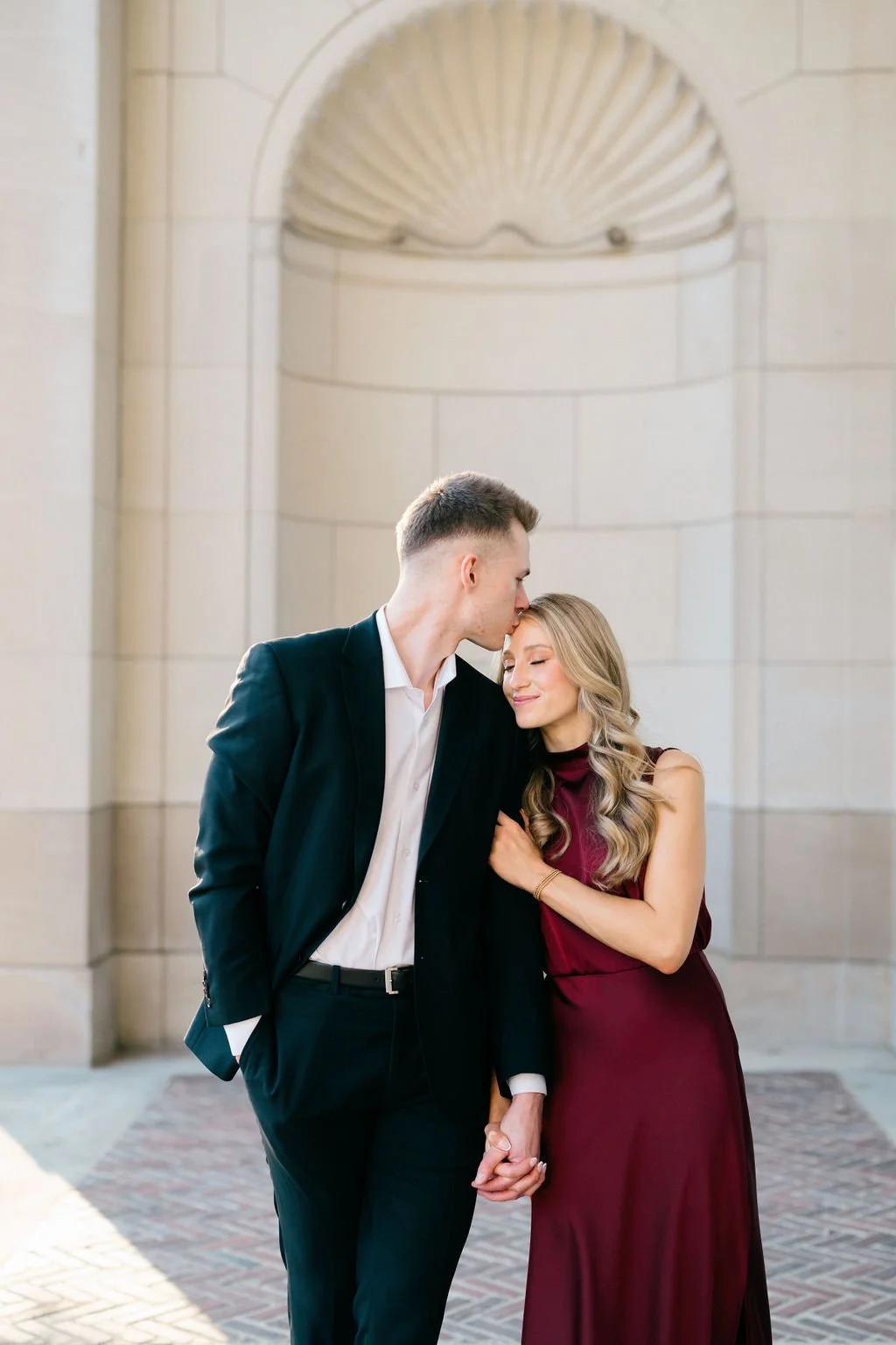 When preparing for what to wear to an engagement session, many brides choose to wear white. However, I love it when brides choose to to wear something that really pops against the background of the location they chose. That is exactly what what Sydney did. She chose to wear a wine colored dress, which really popped against the architecture of the Law Quad in Ann Arbor. It also perfectly matched the color of the hydrangeas all around the building! Here are some of my favorite photos from Justin and Sydney’s engagement session in Ann Arbor, and take note of Sydney’s dress when planning your own outfits!