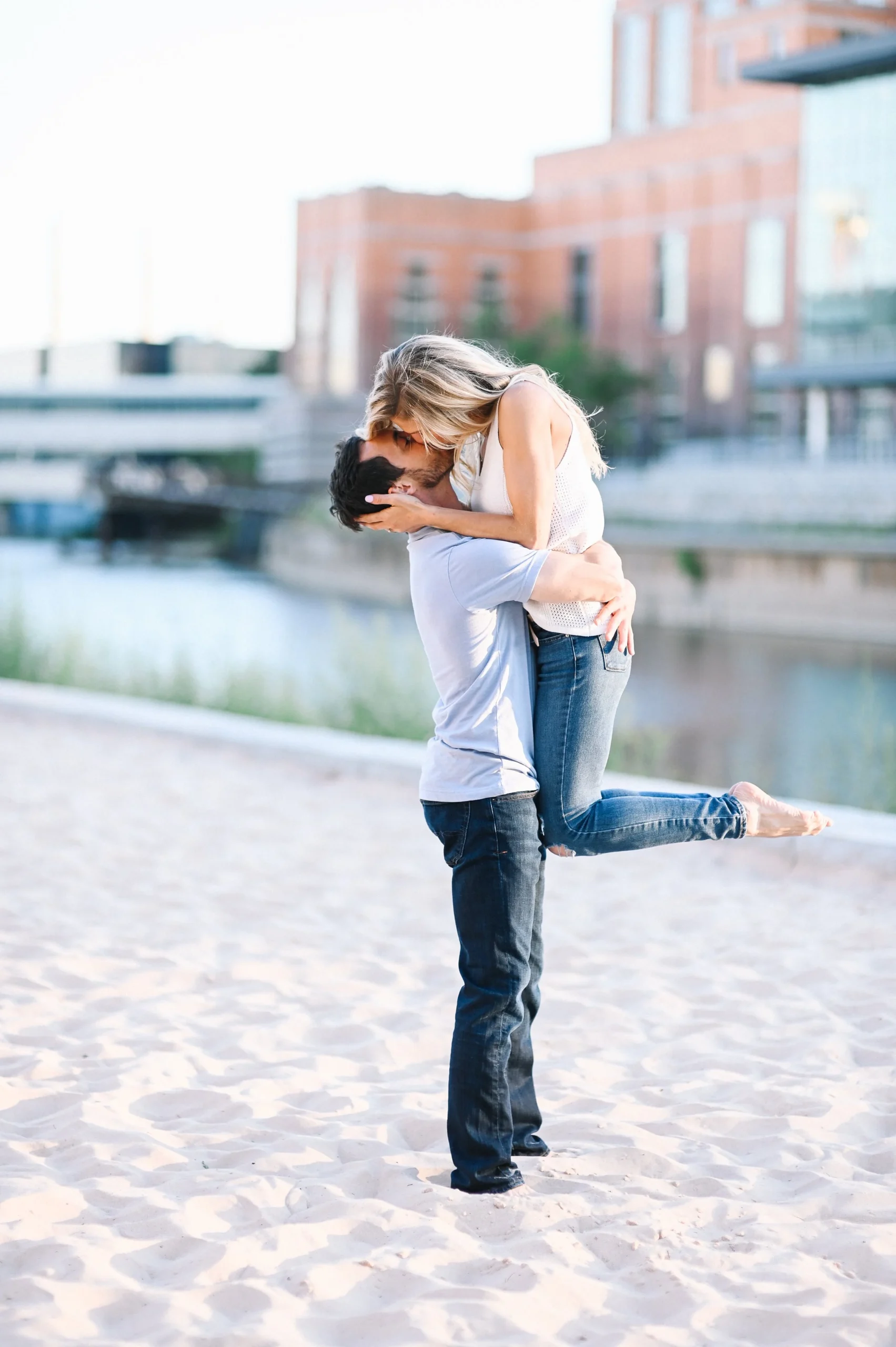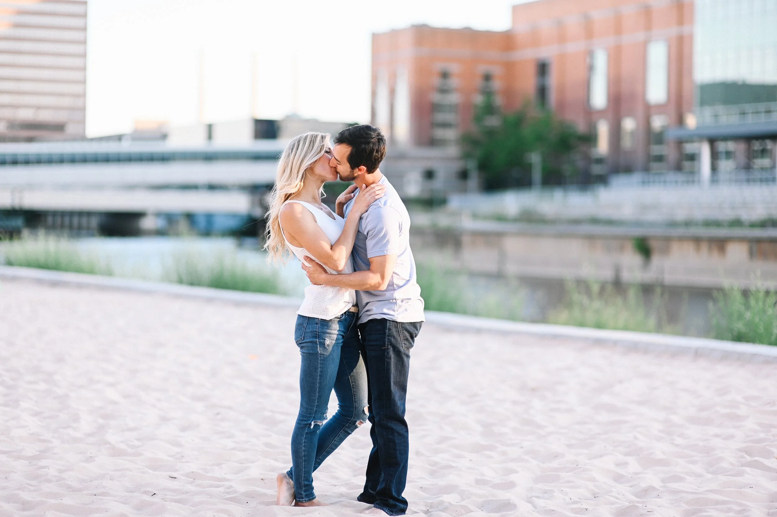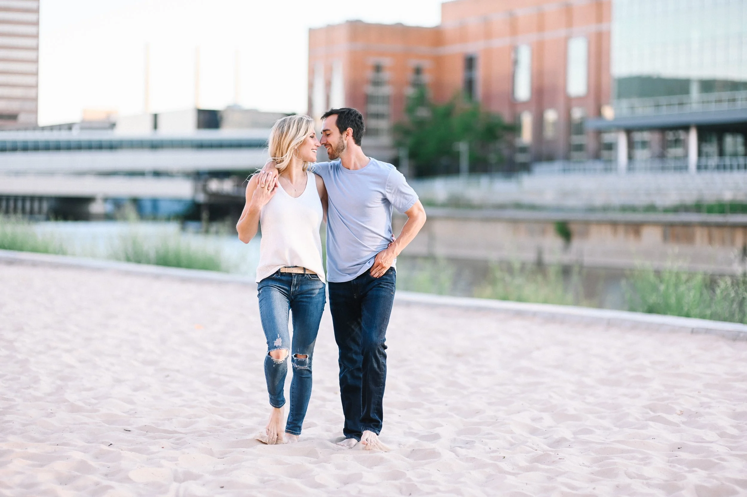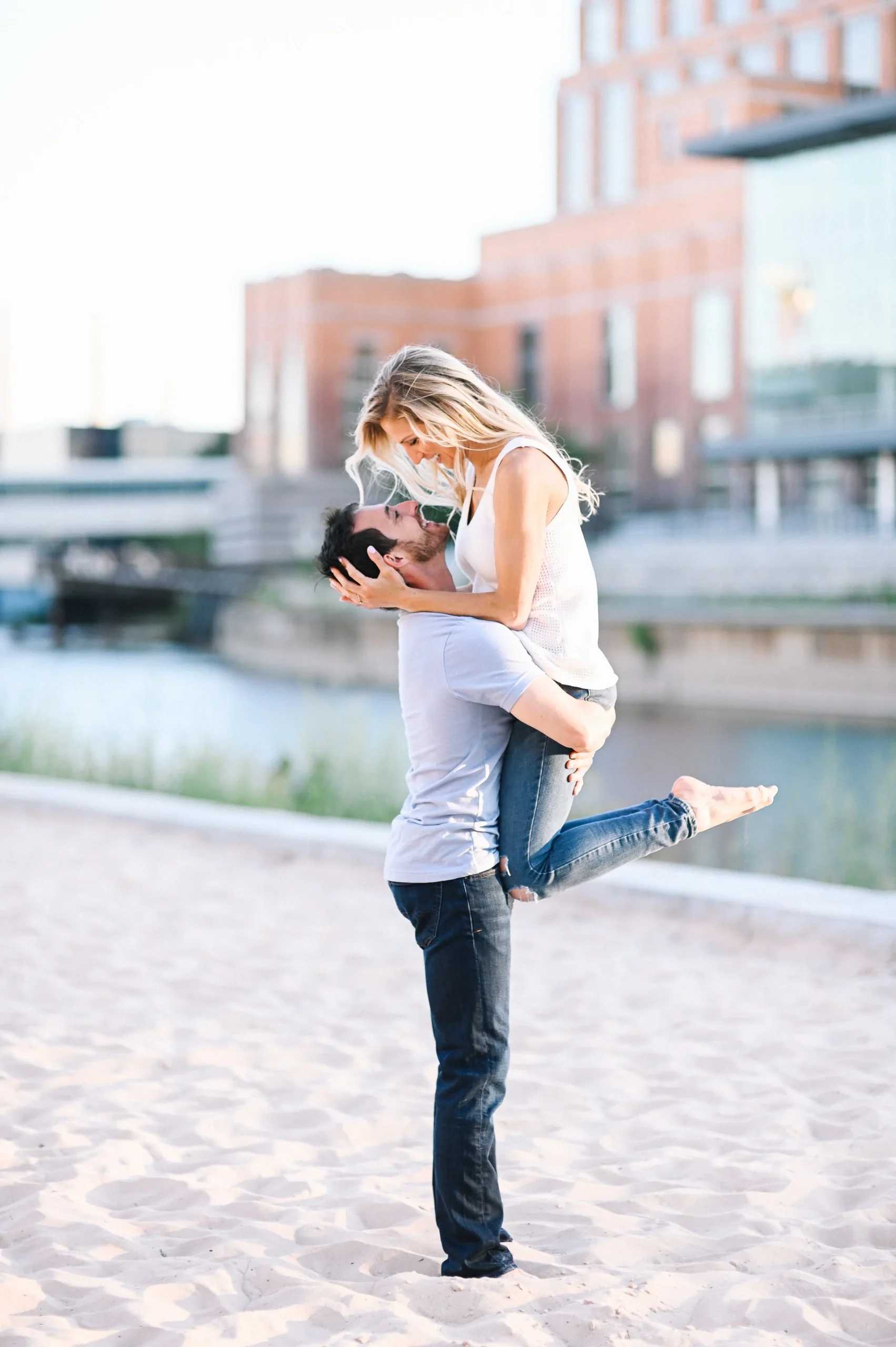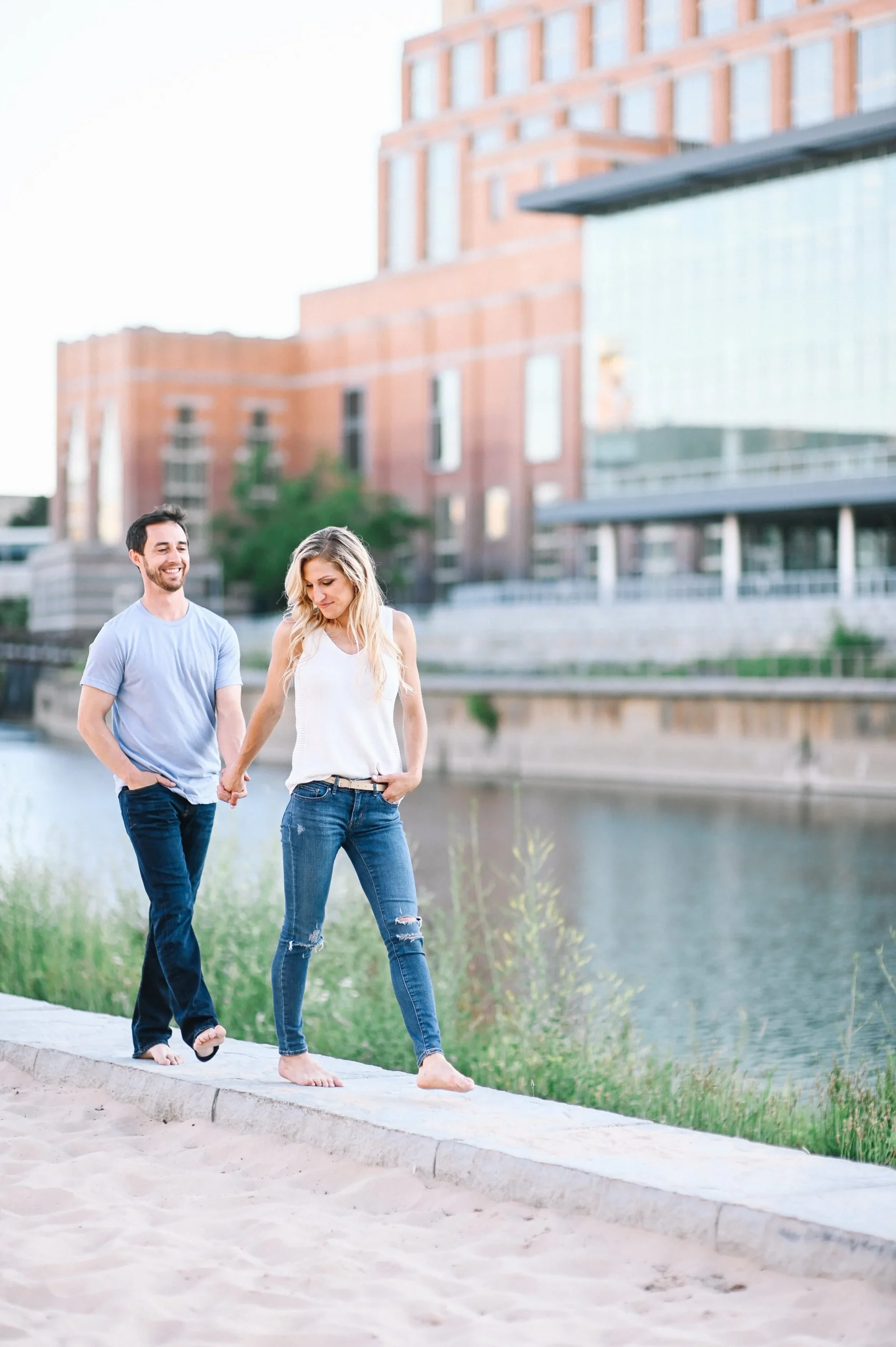 If you are looking for a beach/water summery vibe, but don’t want to drive to a lake, Rotary Park in downtown Lansing has a beach along the river! It gets a great sunset and I love how the photos turn out. It’s right on the river trail so there are lots of little nooks and a cool bridge to use too. Parking is super simple but unfortunately there aren’t public bathrooms for changing. This spot can be combined with shots at the Capitol building/downtown Lansing. Couples often start with a formal look a the Capitol and change into a casual one for the beach.