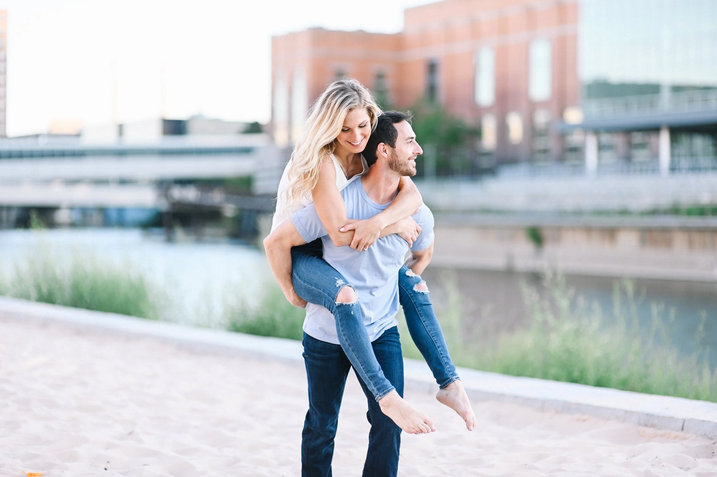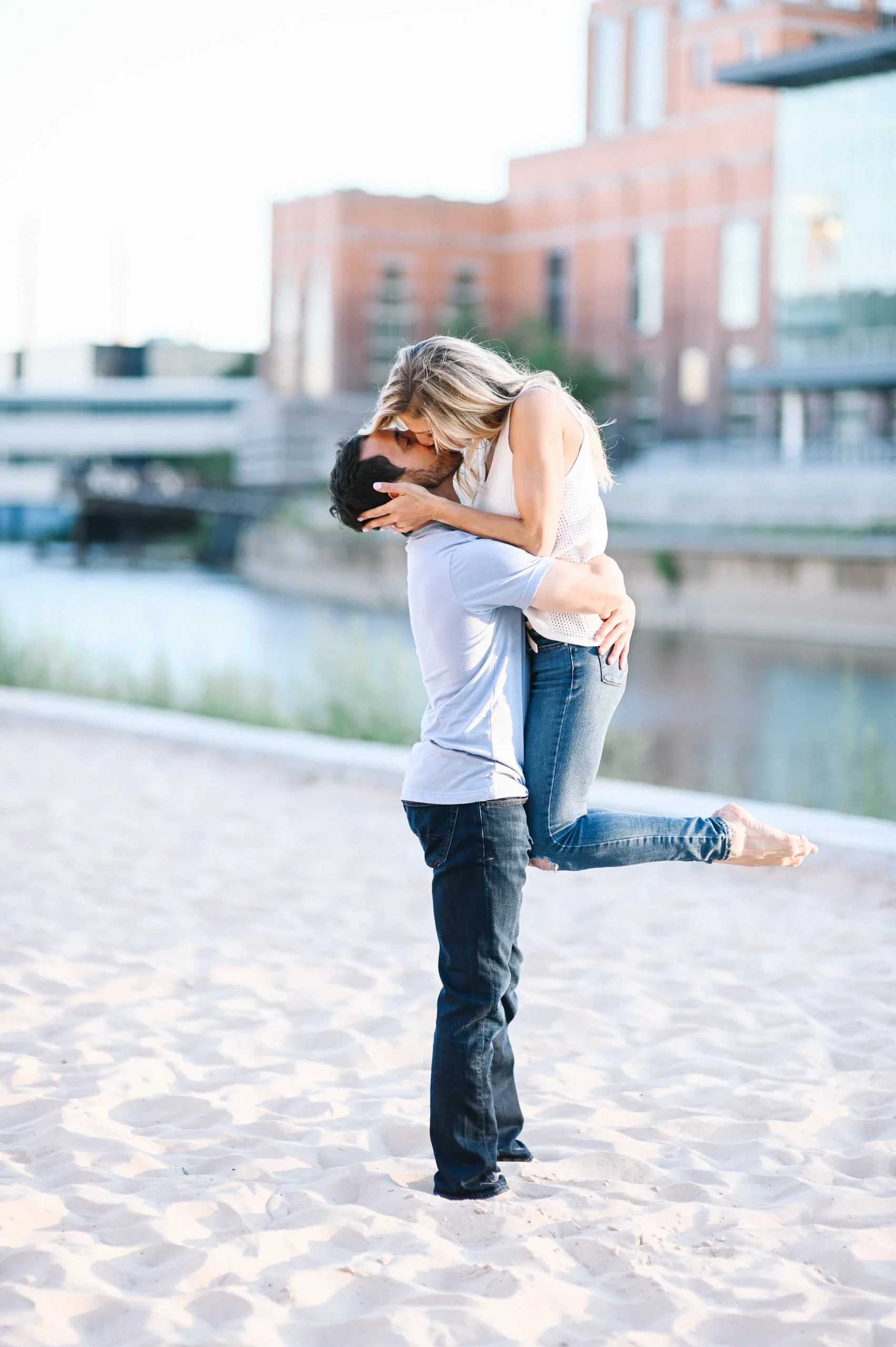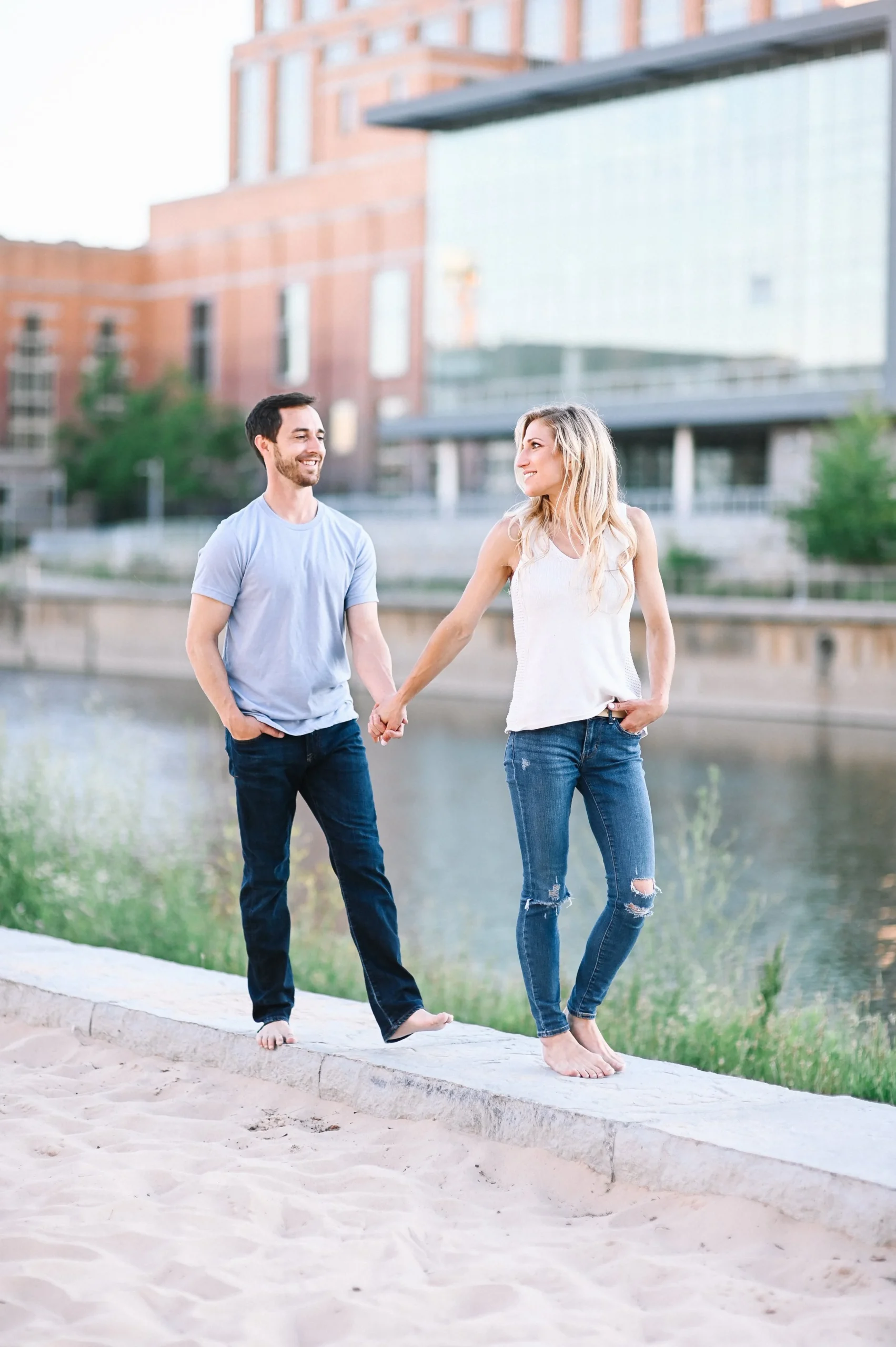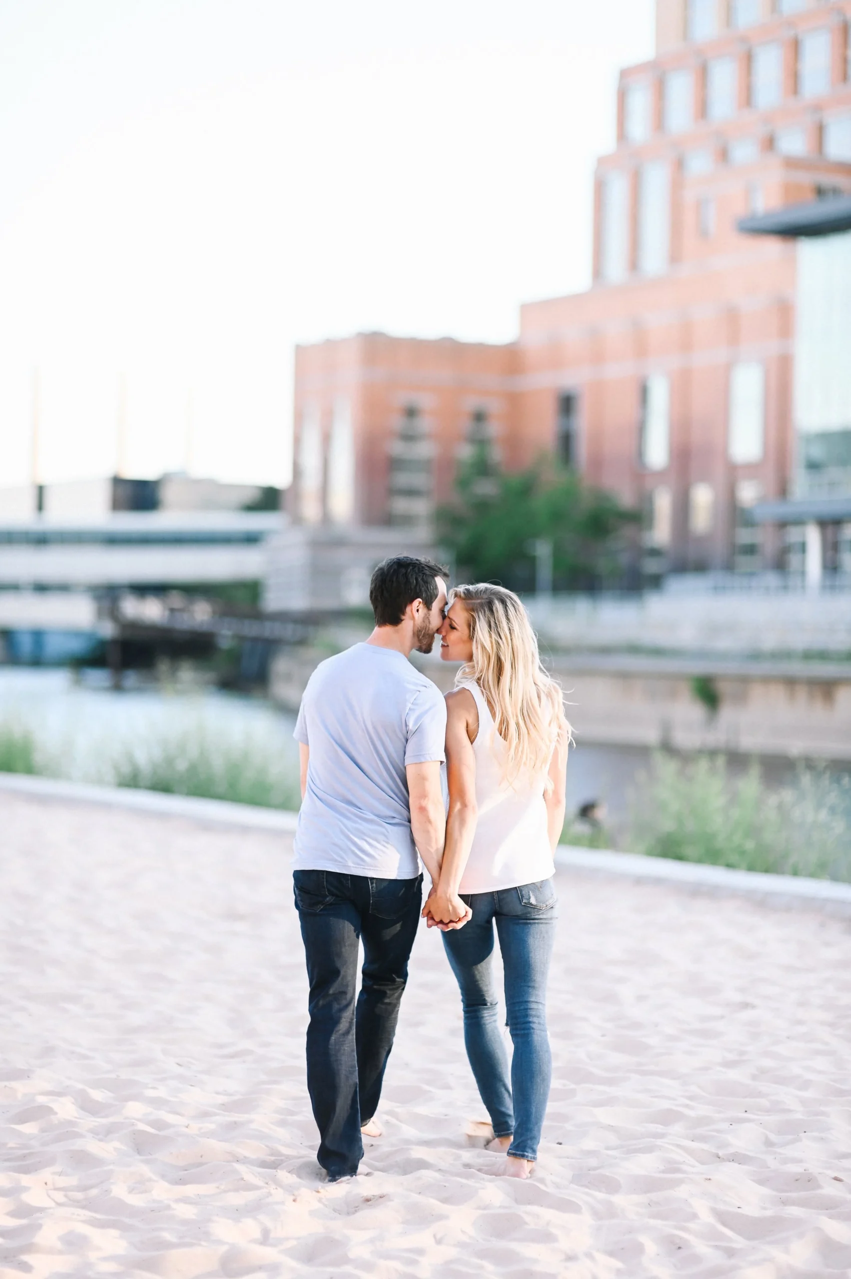 If you are looking for a beach/water summery vibe, but don’t want to drive to a lake, Rotary Park in downtown Lansing has a beach along the river! It gets a great sunset and I love how the photos turn out. It’s right on the river trail so there are lots of little nooks and a cool bridge to use too. Parking is super simple but unfortunately there aren’t public bathrooms for changing. This spot can be combined with shots at the Capitol building/downtown Lansing. Couples often start with a formal look a the Capitol and change into a casual one for the beach.