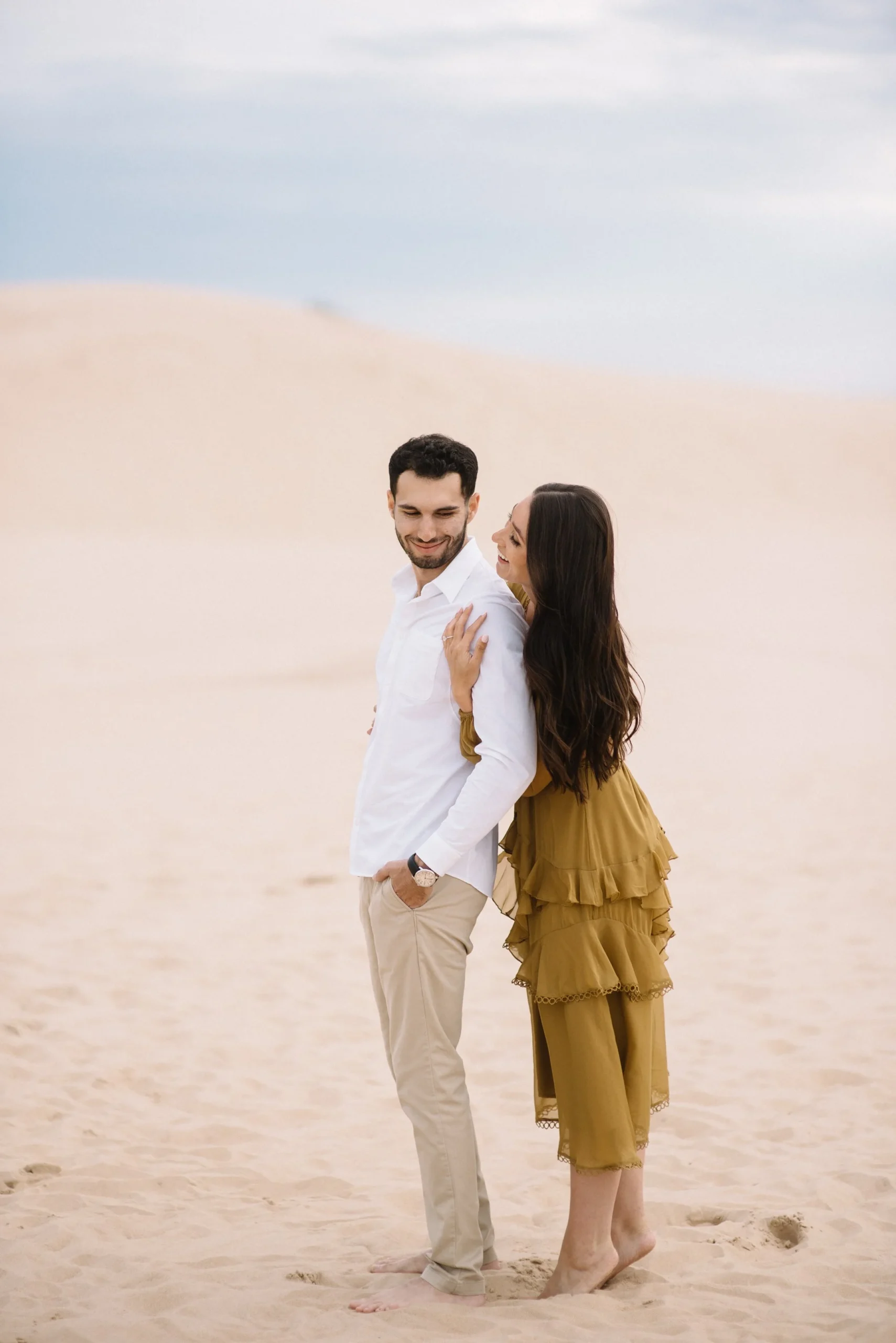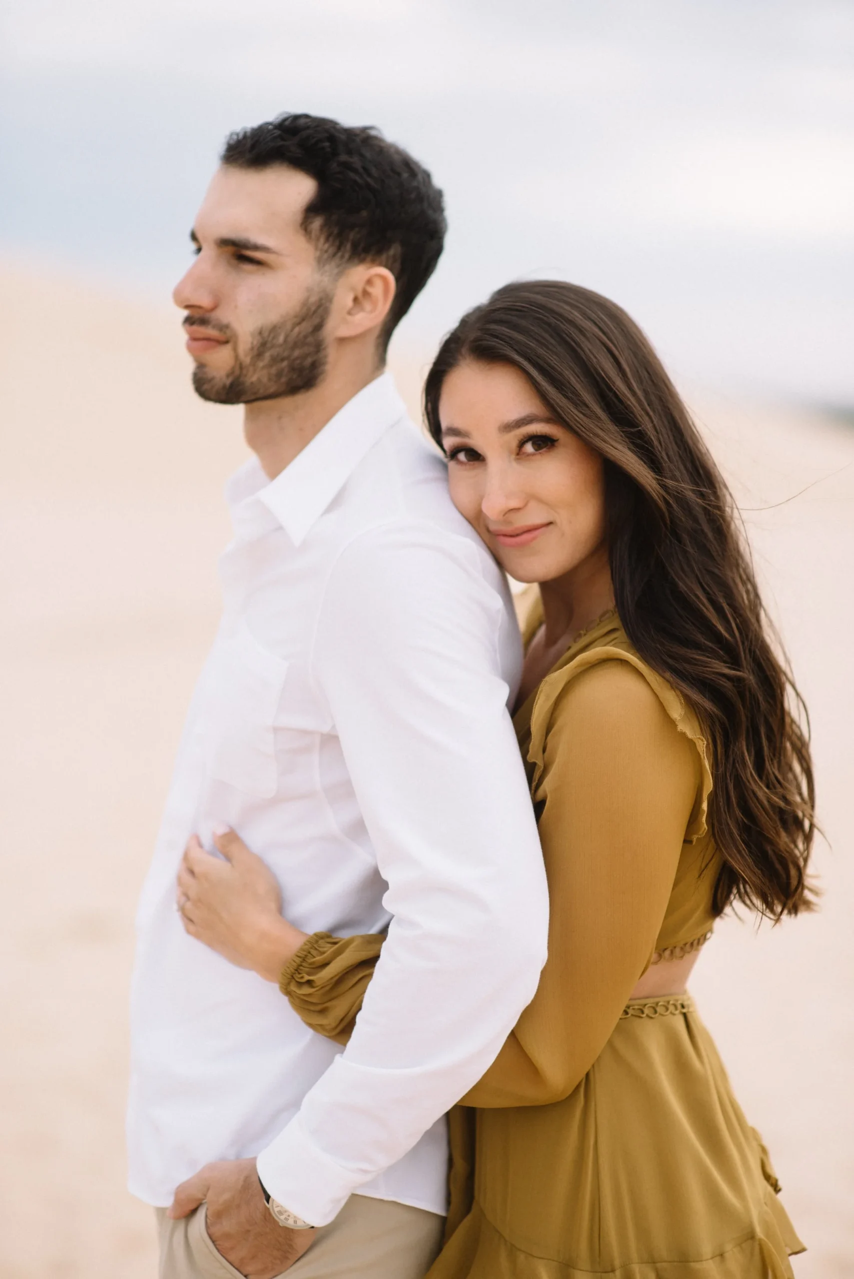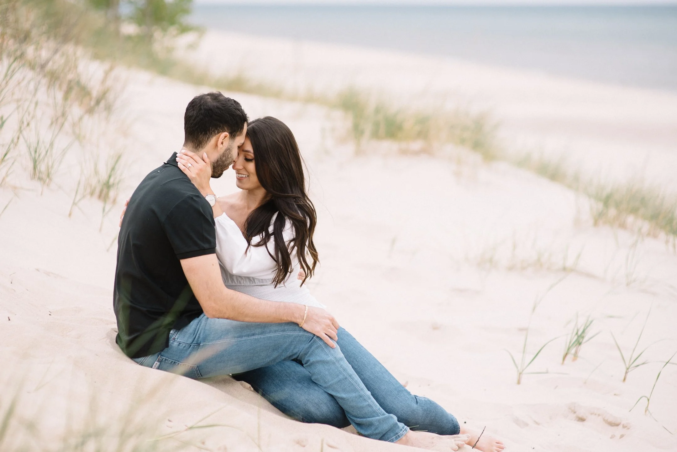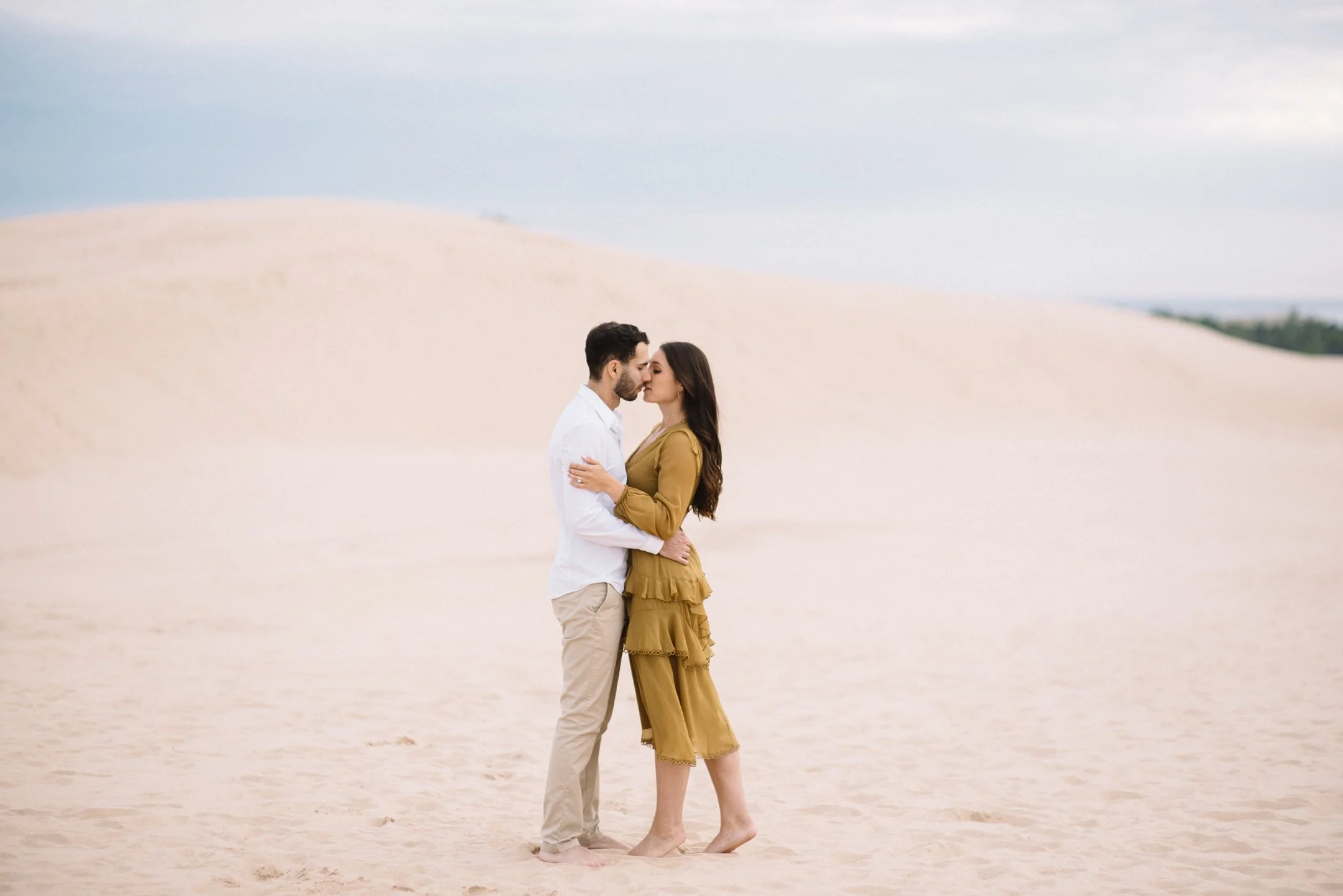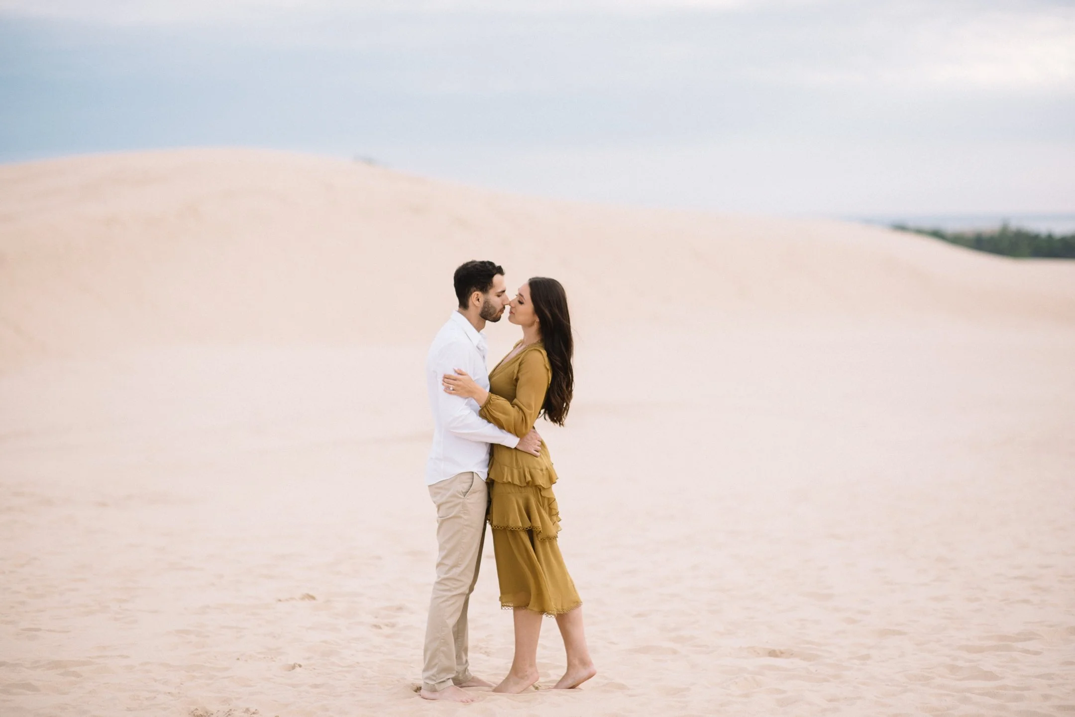 Danielle and Max were the first couple to book a 2023 wedding with me! At the time of booking, Danielle asked if they could do their engagement session at Silver Lake Sand Dunes. She loved a set of romantic dune photos she had seen on Pinterest taken in California, and wanted a similar look here in Michigan. Since they are getting married in Detroit, they wanted a totally different look for their engagement photos.