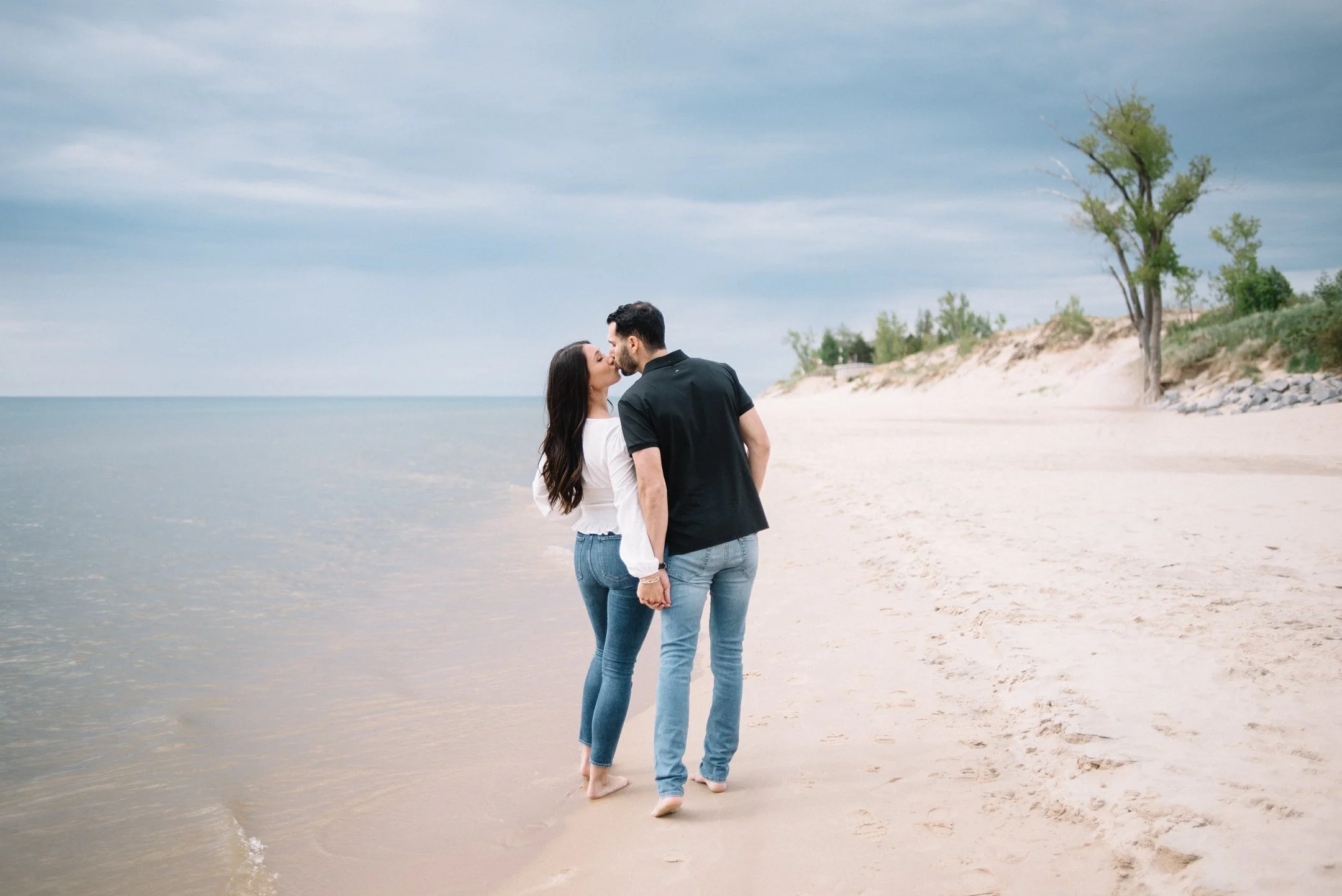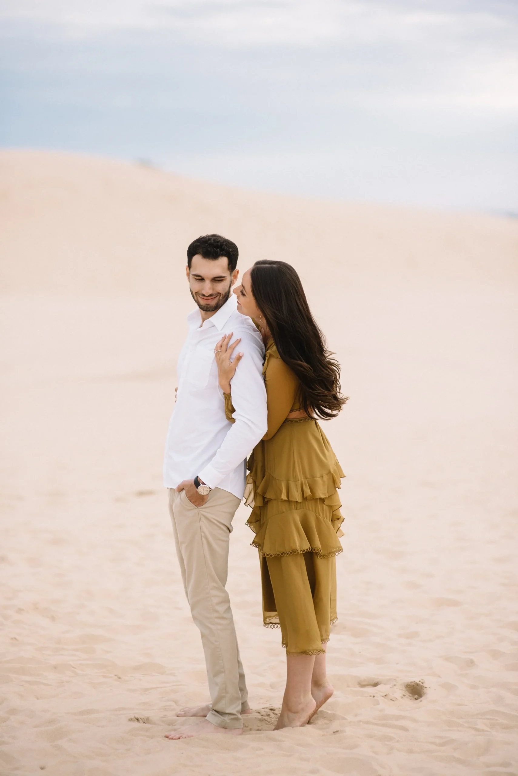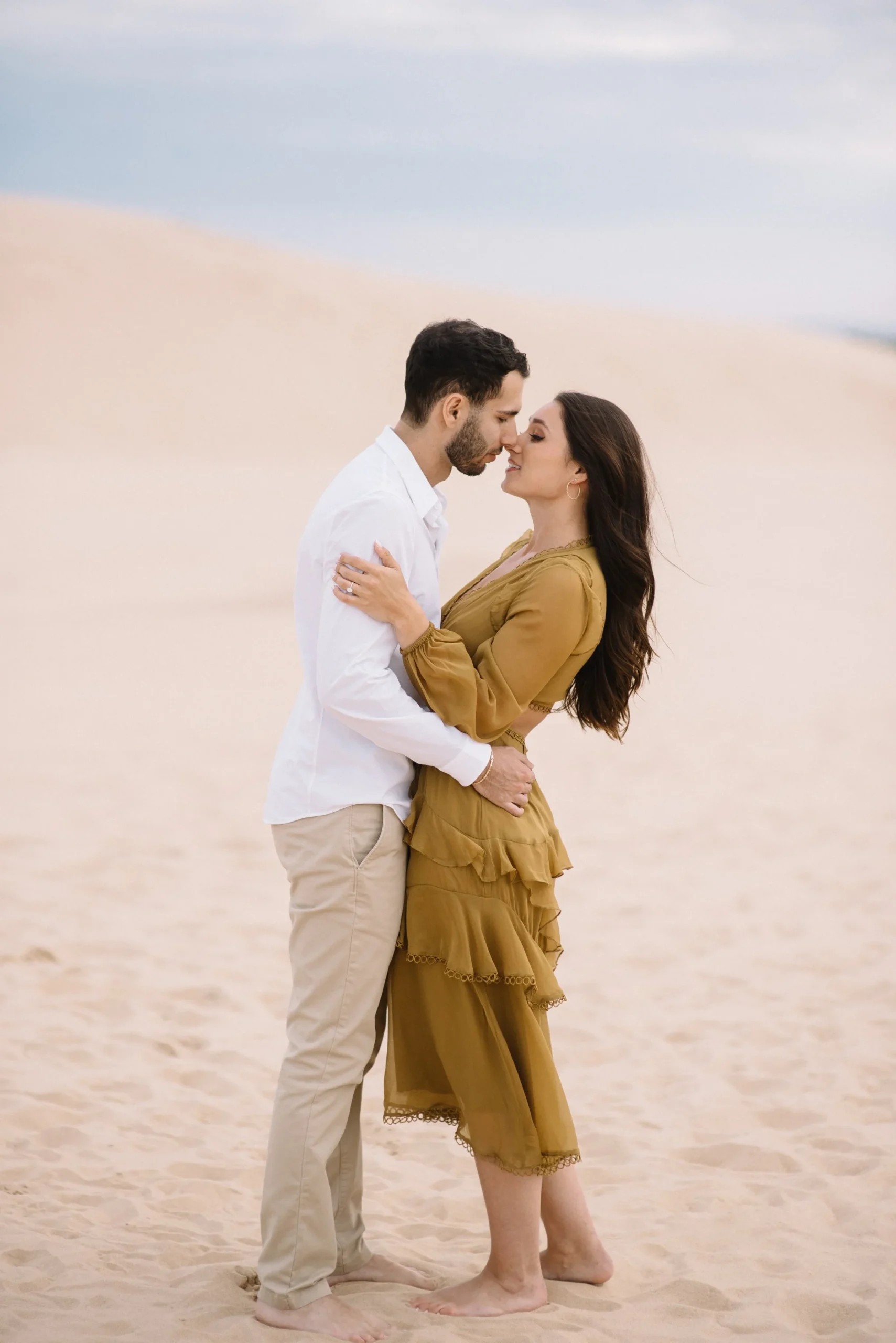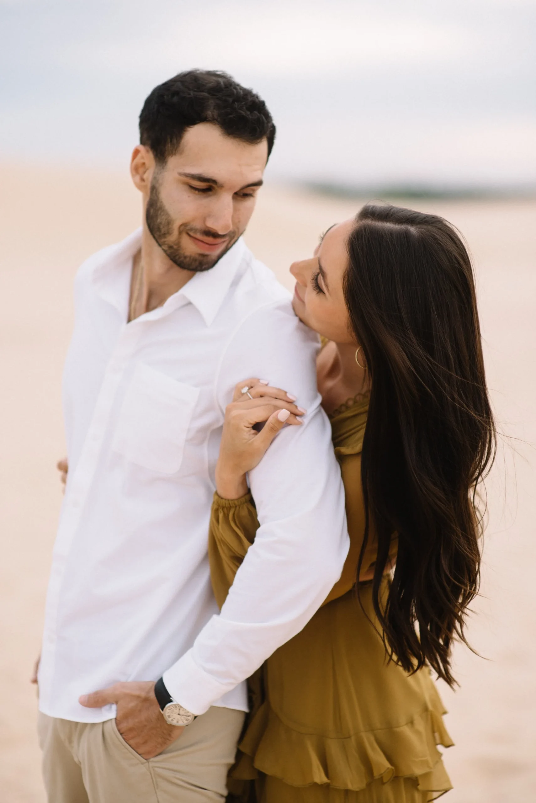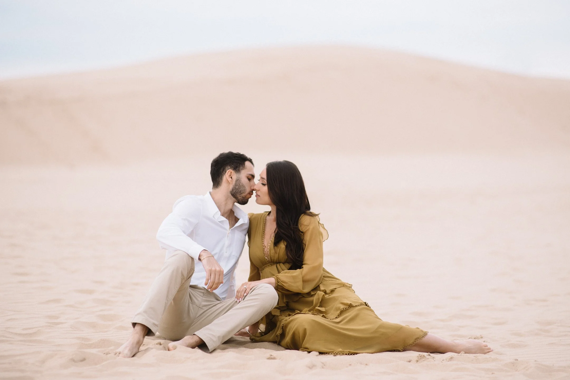 Danielle and Max were the first couple to book a 2023 wedding with me! At the time of booking, Danielle asked if they could do their engagement session at Silver Lake Sand Dunes. She loved a set of romantic dune photos she had seen on Pinterest taken in California, and wanted a similar look here in Michigan. Since they are getting married in Detroit, they wanted a totally different look for their engagement photos.