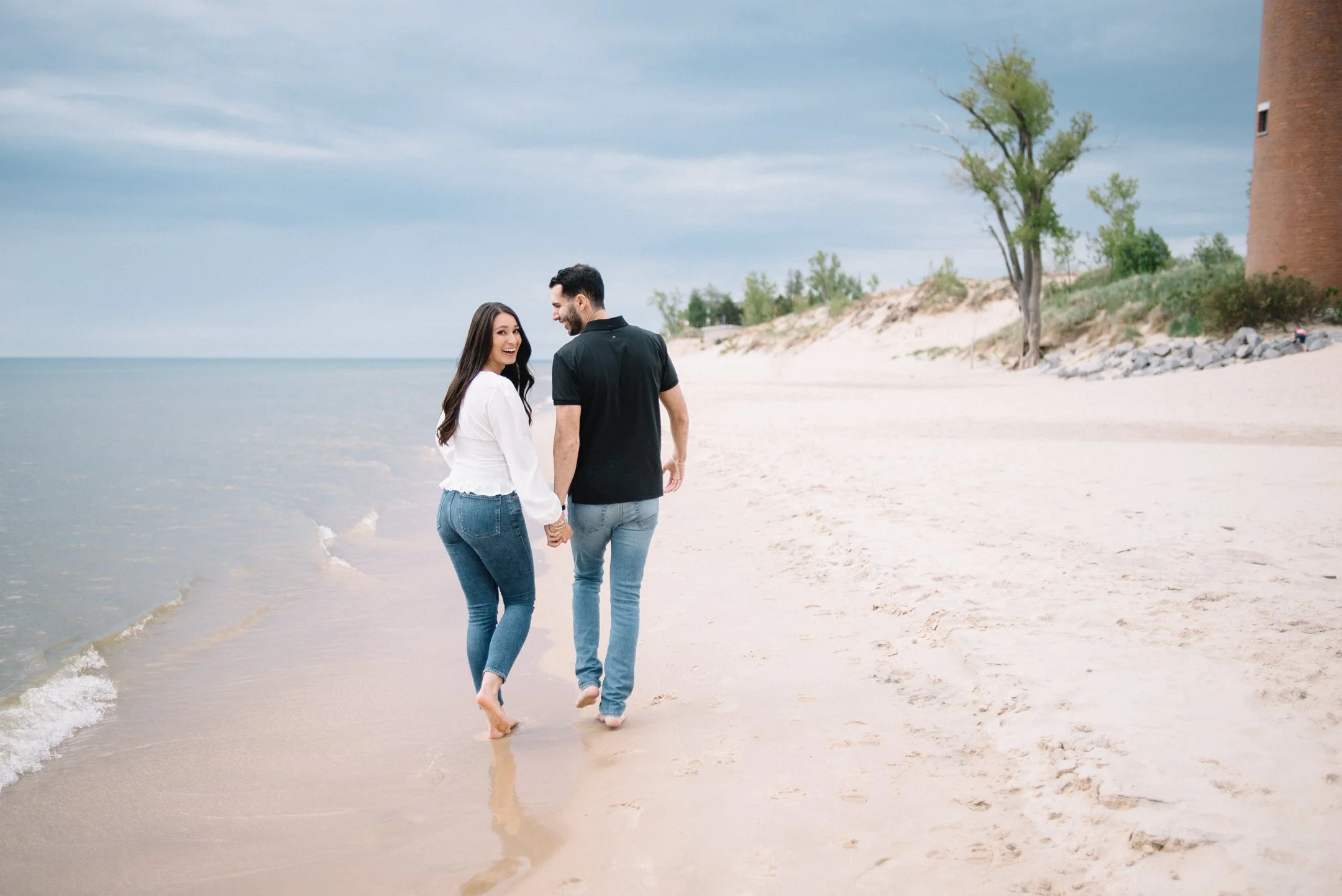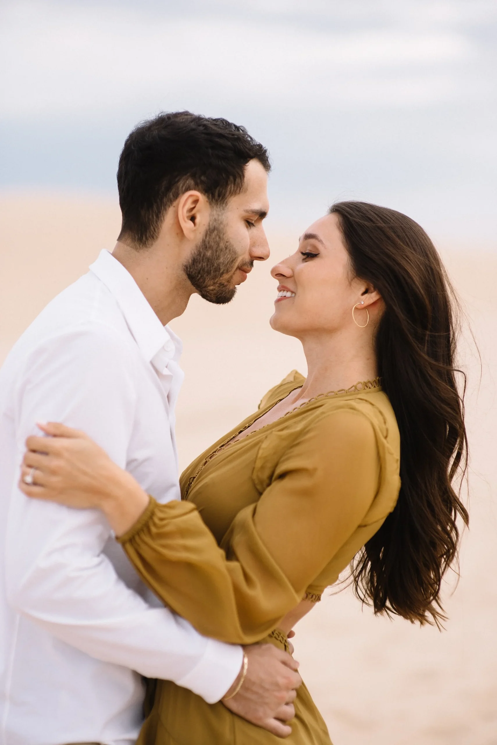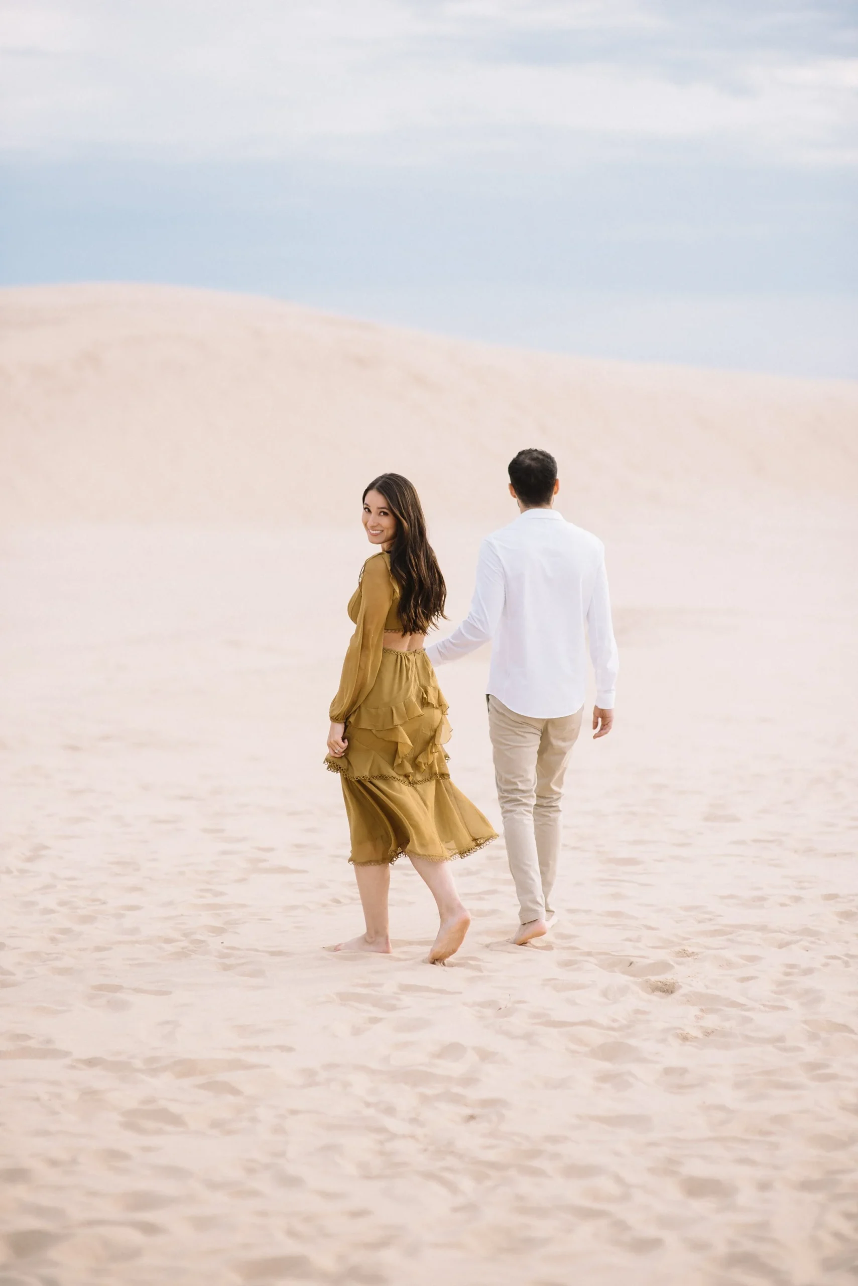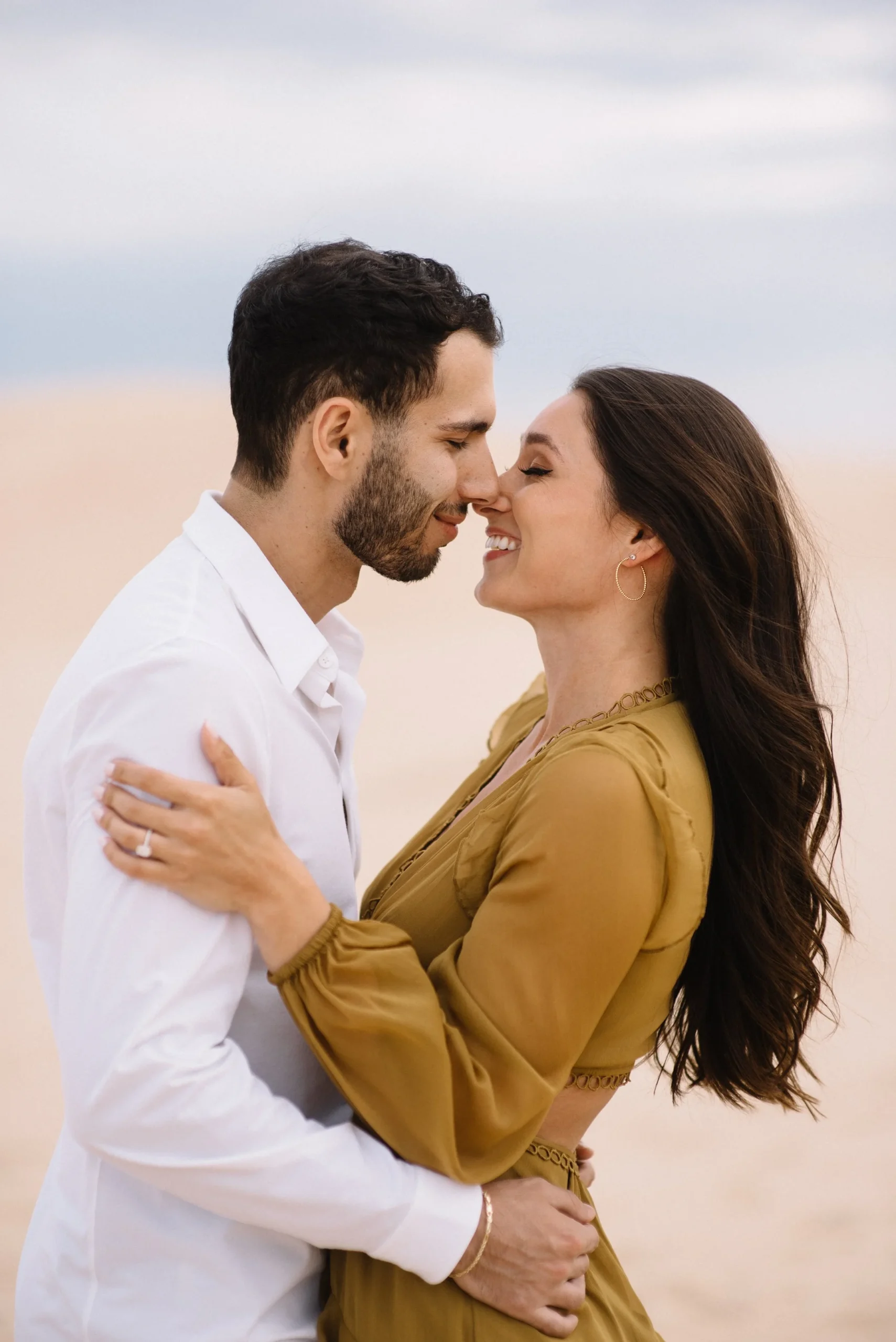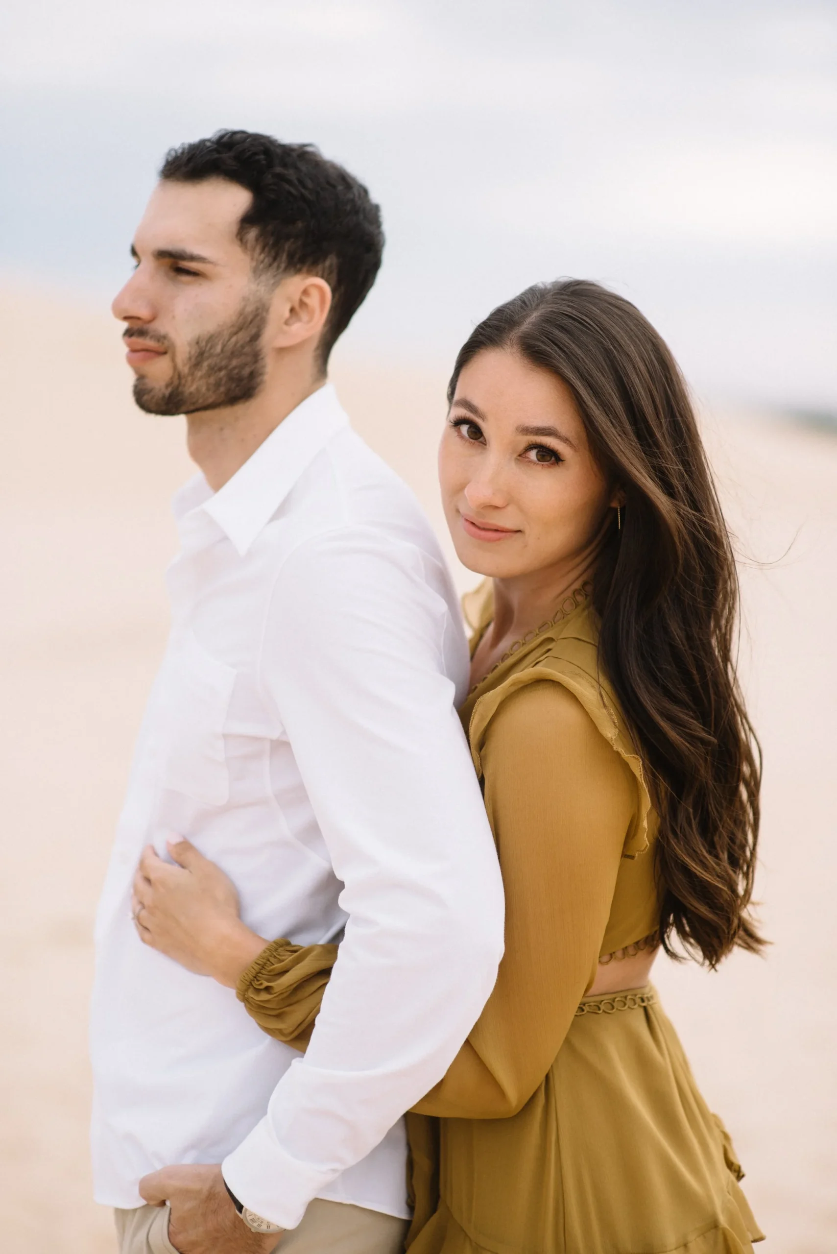 Danielle and Max were the first couple to book a 2023 wedding with me! At the time of booking, Danielle asked if they could do their engagement session at Silver Lake Sand Dunes. She loved a set of romantic dune photos she had seen on Pinterest taken in California, and wanted a similar look here in Michigan. Since they are getting married in Detroit, they wanted a totally different look for their engagement photos.
