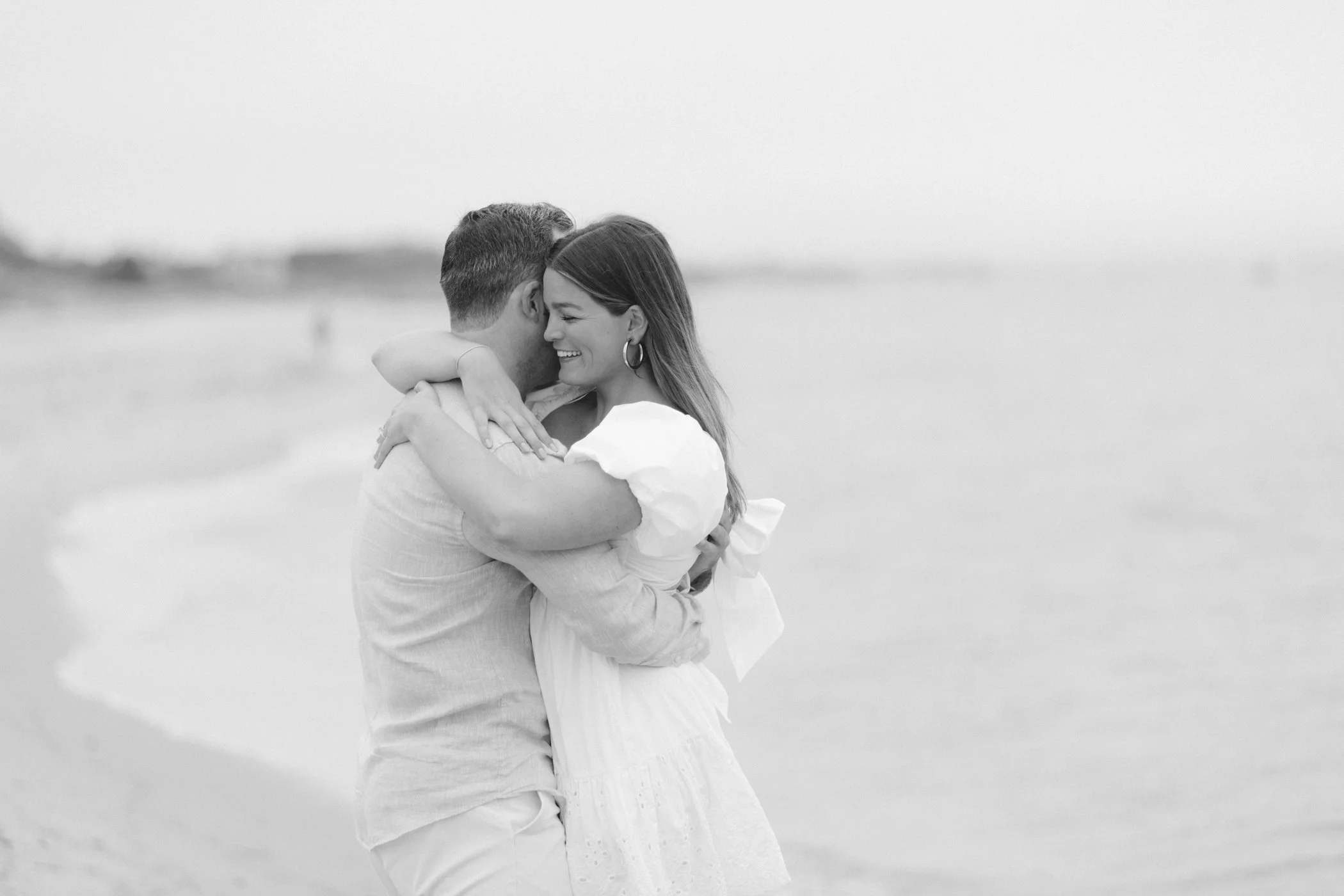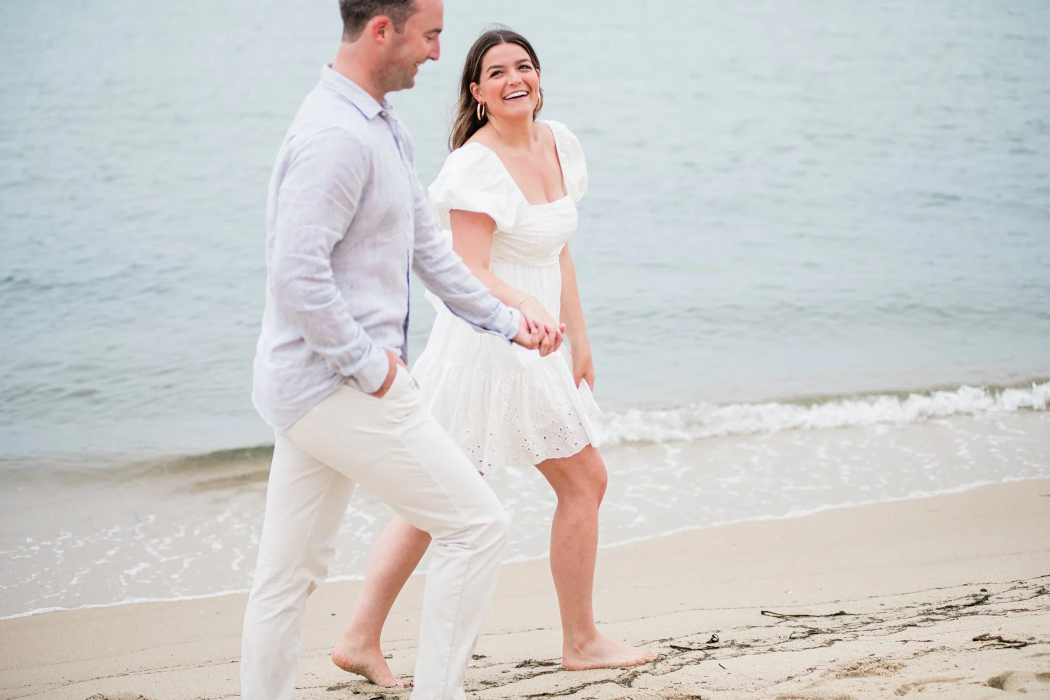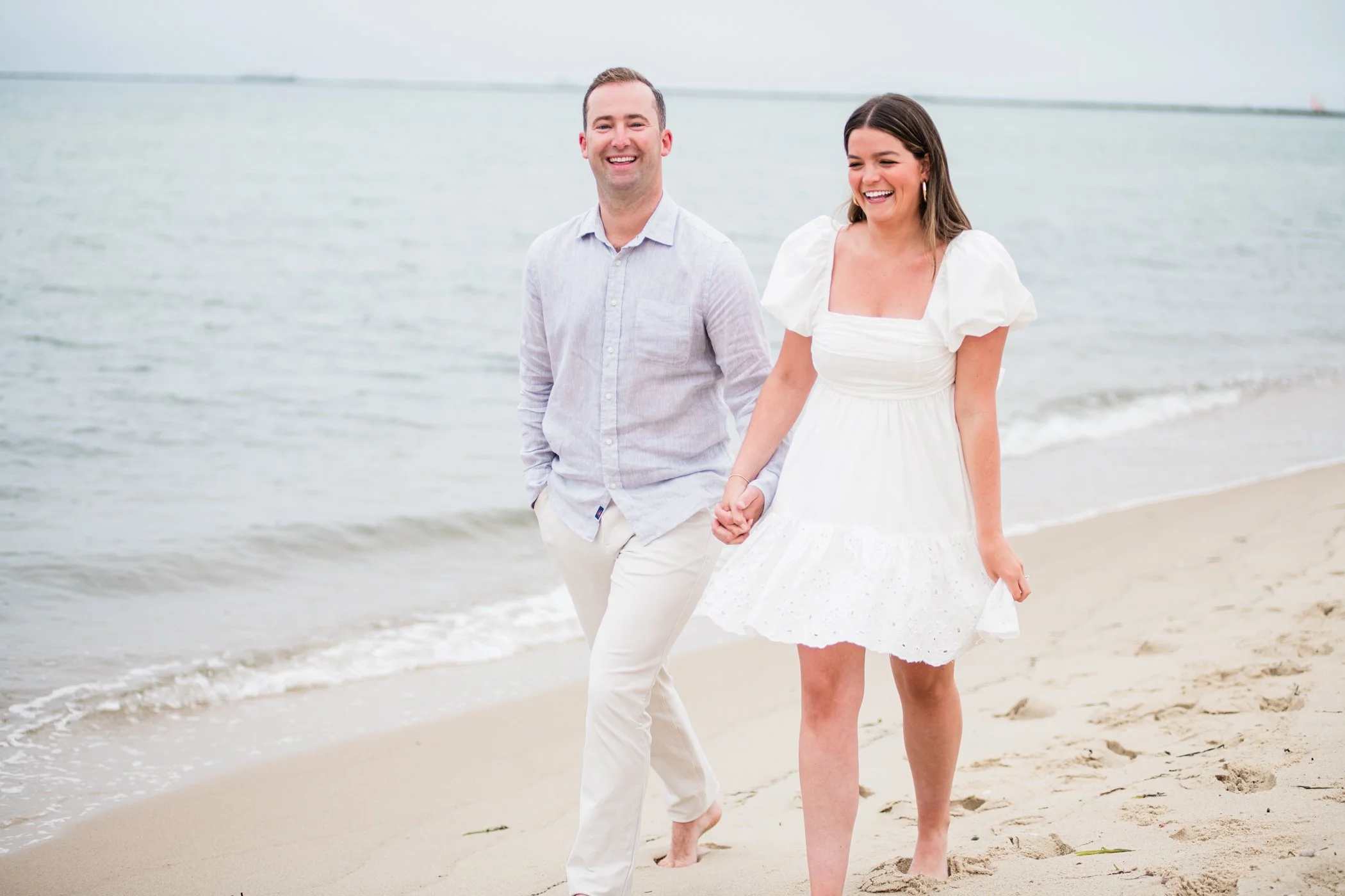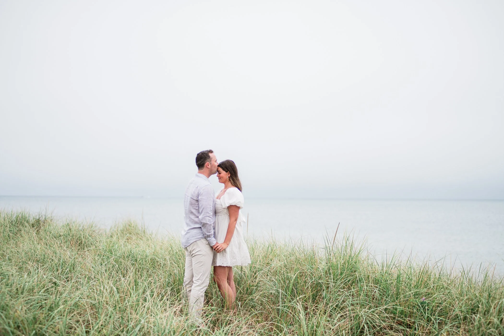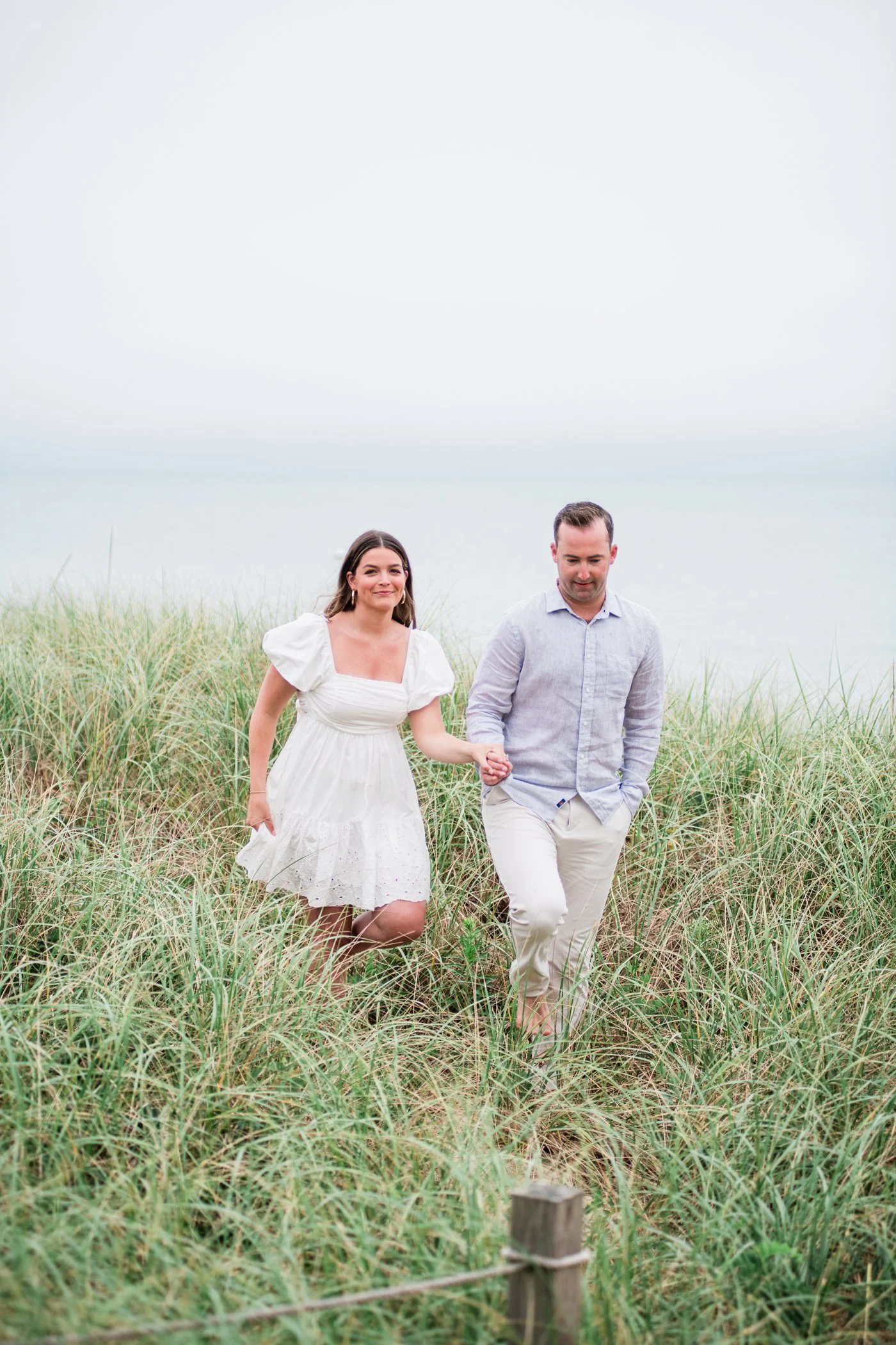 When I first chatted with Grace, one of the first things we talked about was the fact that I worked on both the East Coast and in Michigan. While she and Bo are going to get married in Grand Rapids summer of 2024, she desperately wanted engagement photos on Nantucket, where she and Bo summer every year and where Bo’s grandparents have a home. Luckily, our dates aligned and the week they were on Nantucket happened to be the week I was in Newport for a wedding, so I hopped the ferry (with the kids and nanny in tow!) and we made a day trip of it! We went to the Whaling Museum in the morning (highly recommend!), I photographed Grace and Bo in the afternoon while the nanny hung with the kids, and then we went shopping and had dinner before taking the ferry back to our hotel on the Cape. Even though it was raining, we still had an amazing day, and I LOVE how the photos turned out! A light drizzle isn’t always bad at the beach…it usually means its empty so no beach goers in the background! And no squinting because its overcast 🙂 . Here are a few of my favorites from their session!