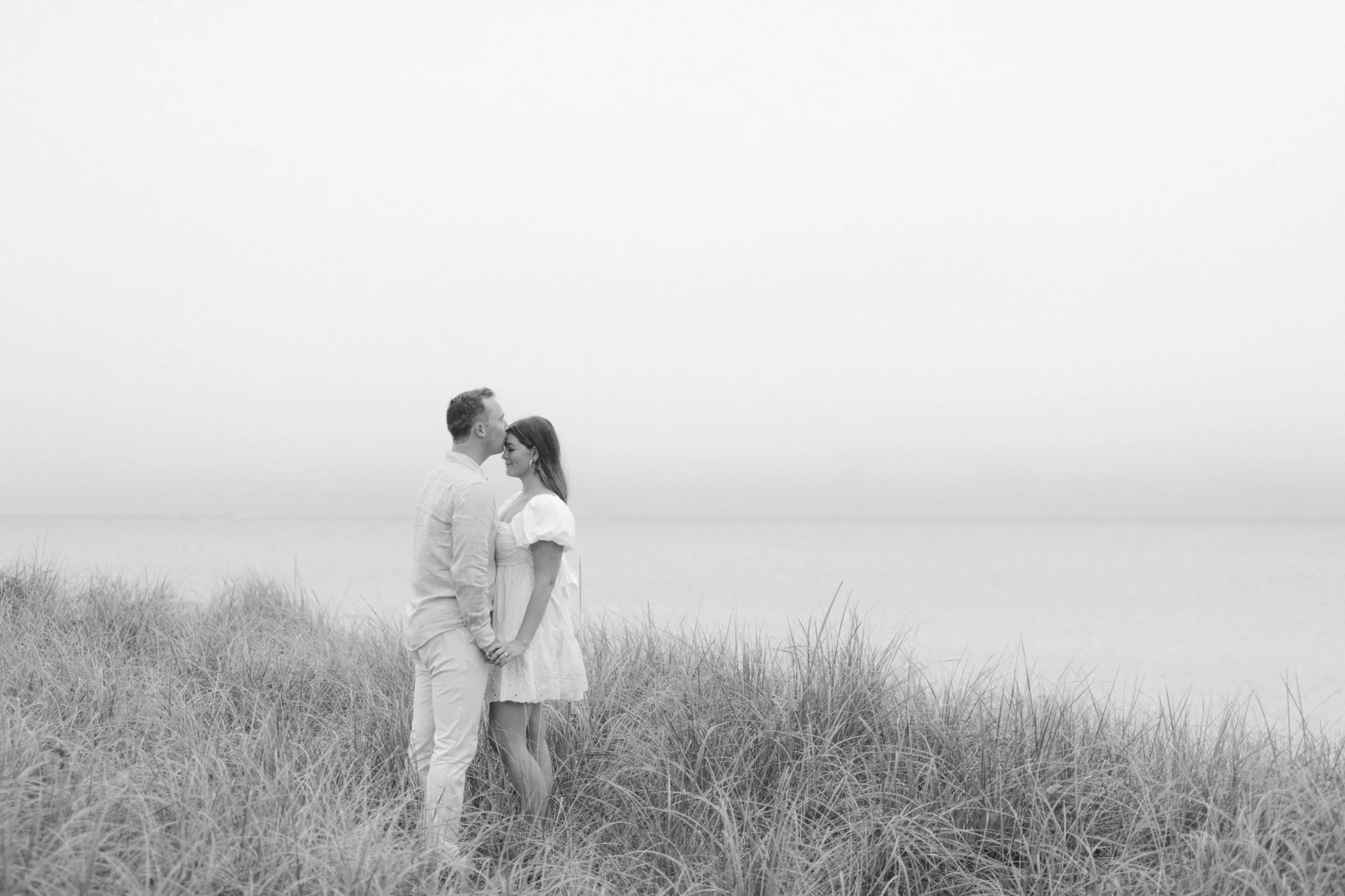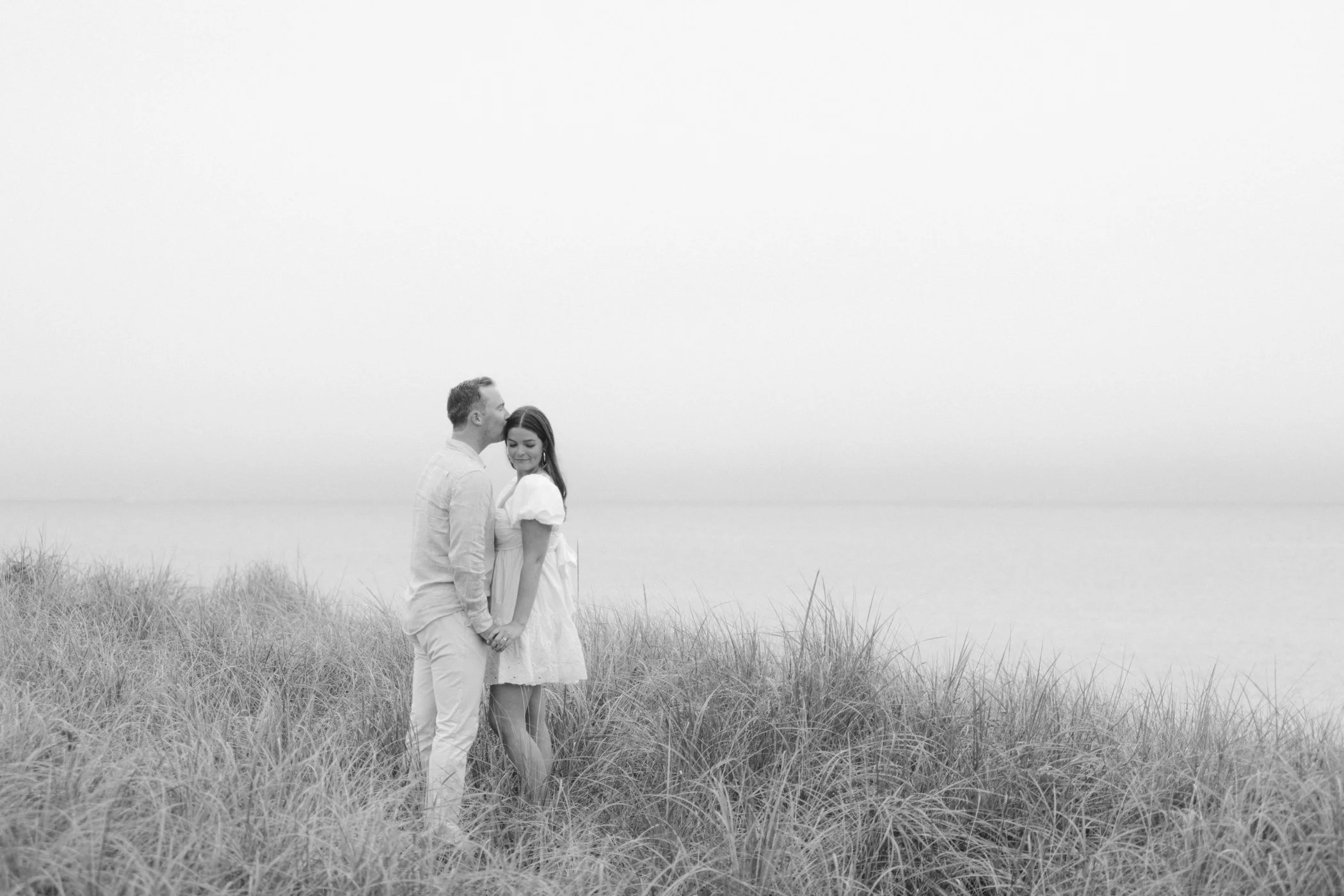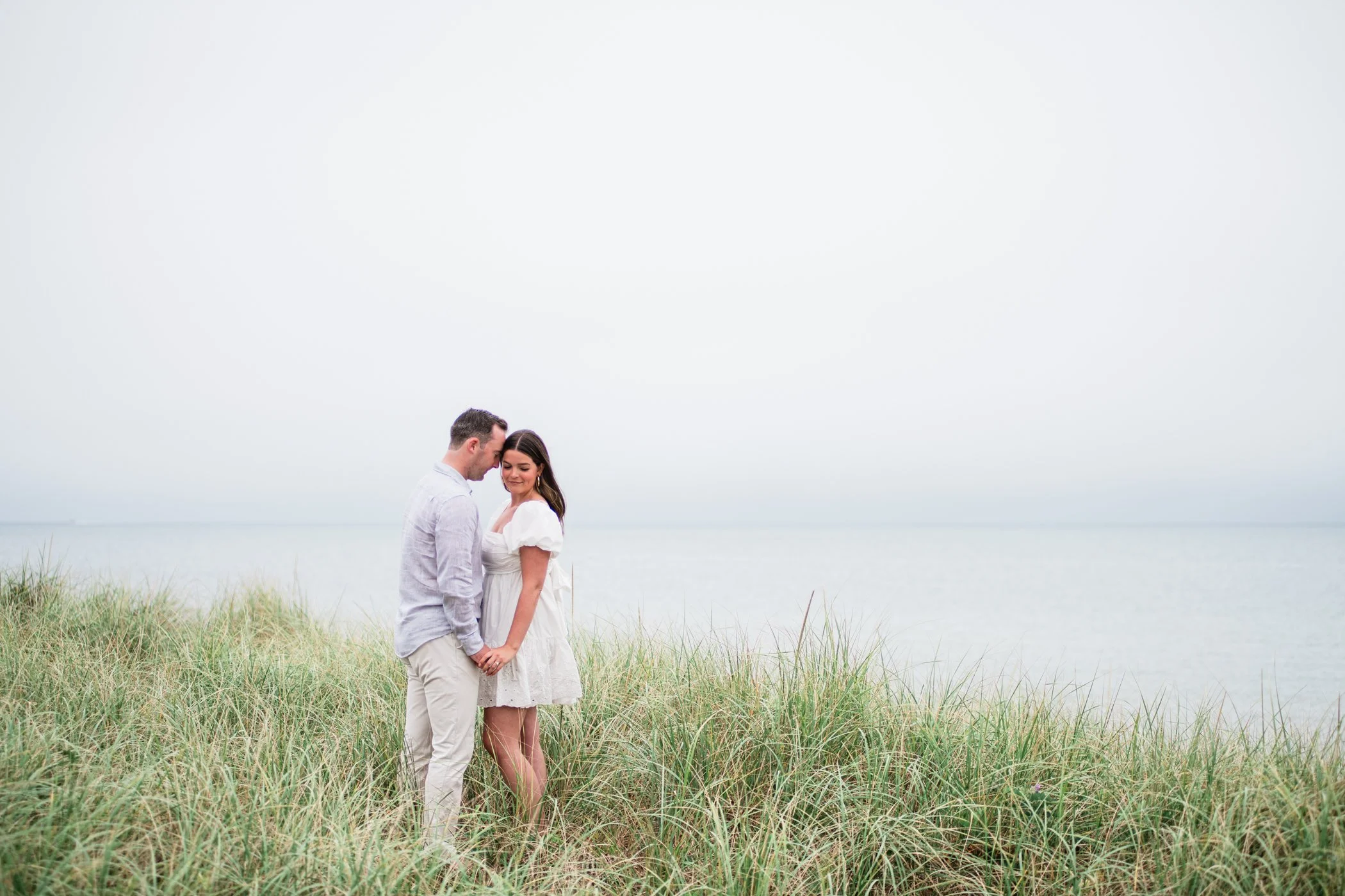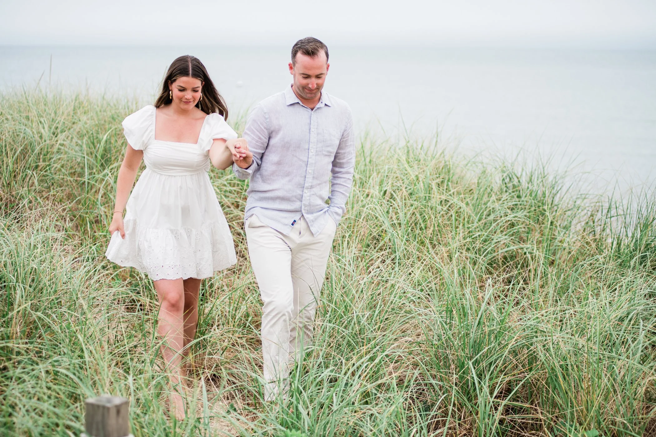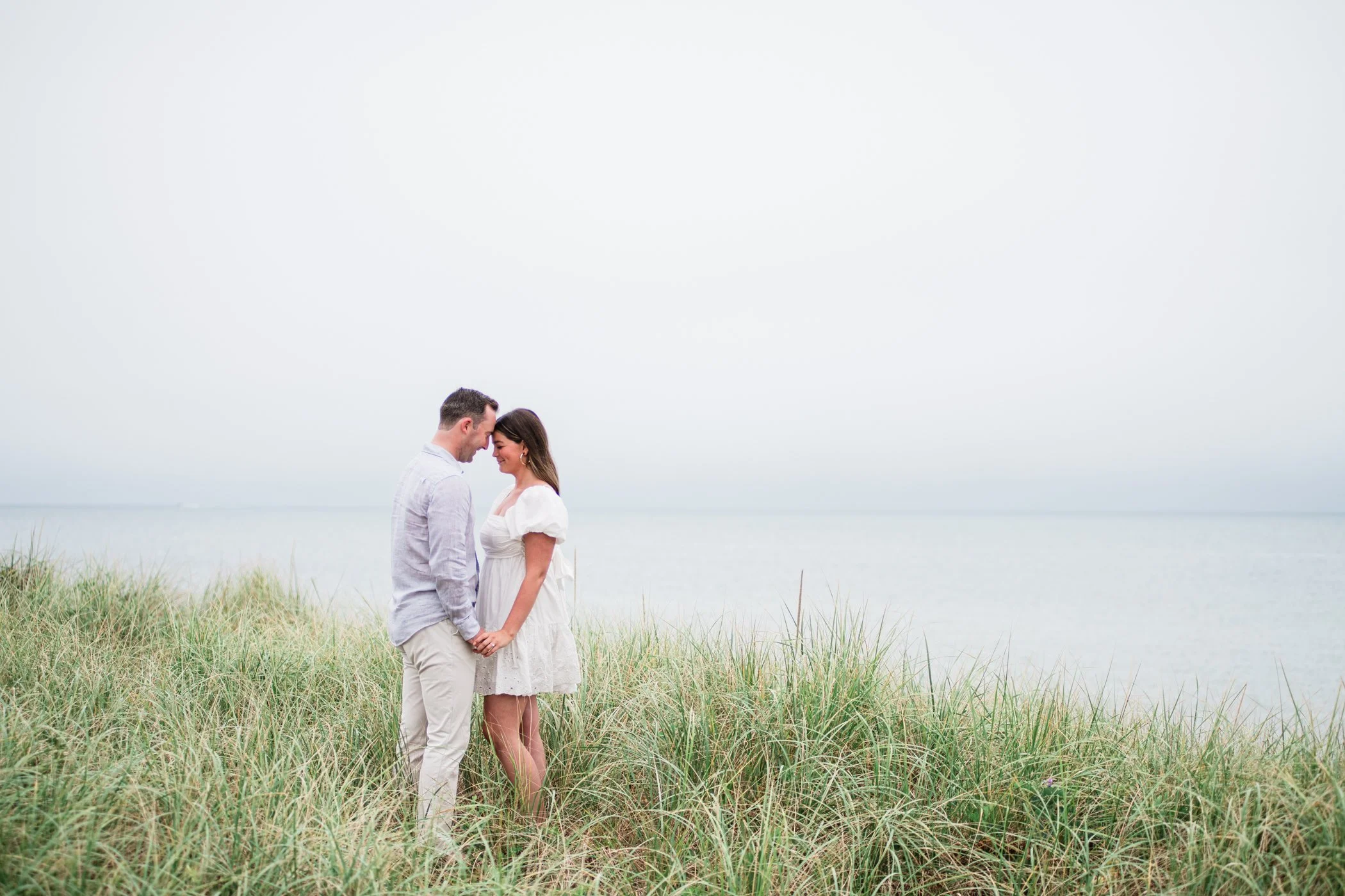 When I first chatted with Grace, one of the first things we talked about was the fact that I worked on both the East Coast and in Michigan. While she and Bo are going to get married in Grand Rapids summer of 2024, she desperately wanted engagement photos on Nantucket, where she and Bo summer every year and where Bo’s grandparents have a home. Luckily, our dates aligned and the week they were on Nantucket happened to be the week I was in Newport for a wedding, so I hopped the ferry (with the kids and nanny in tow!) and we made a day trip of it! We went to the Whaling Museum in the morning (highly recommend!), I photographed Grace and Bo in the afternoon while the nanny hung with the kids, and then we went shopping and had dinner before taking the ferry back to our hotel on the Cape. Even though it was raining, we still had an amazing day, and I LOVE how the photos turned out! A light drizzle isn’t always bad at the beach…it usually means its empty so no beach goers in the background! And no squinting because its overcast 🙂 . Here are a few of my favorites from their session!