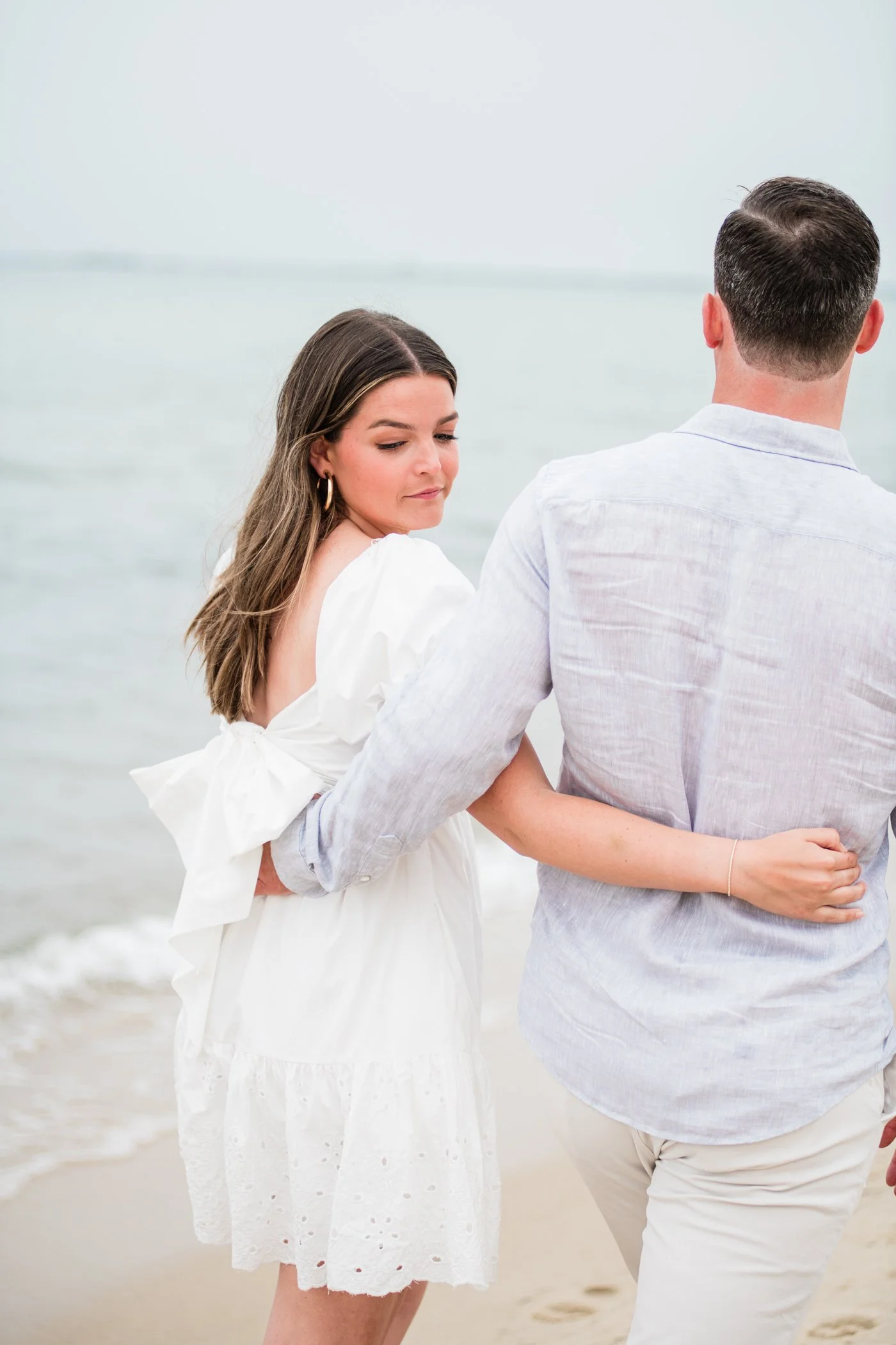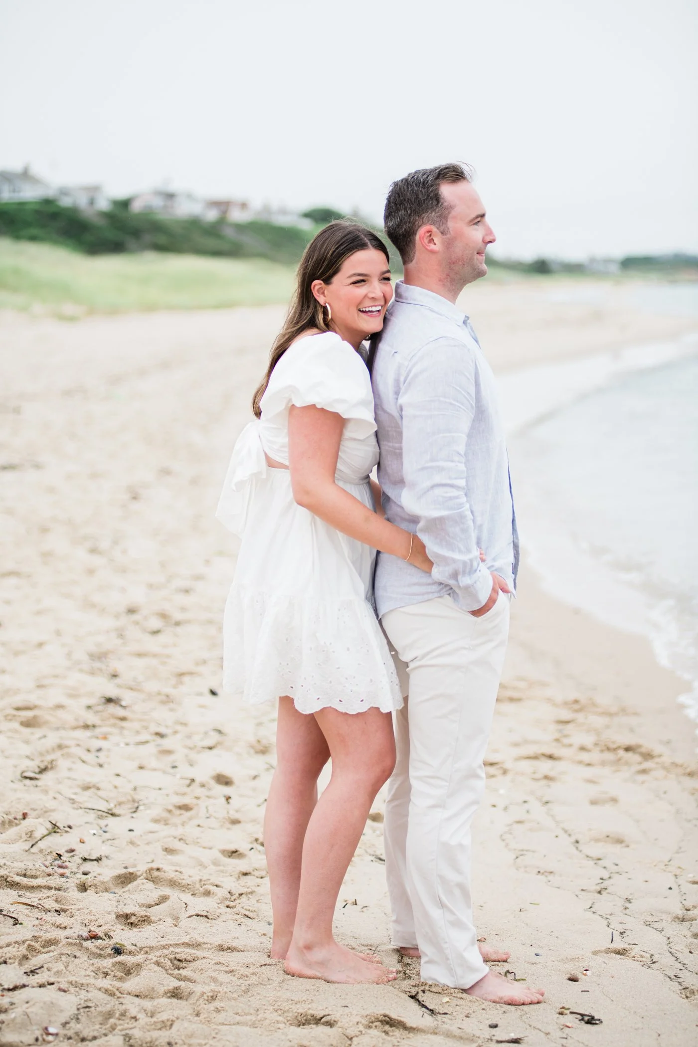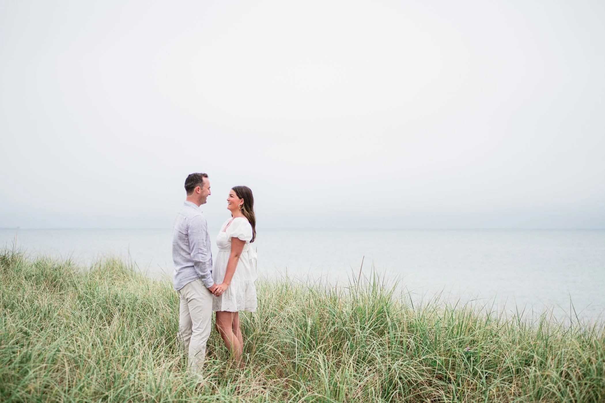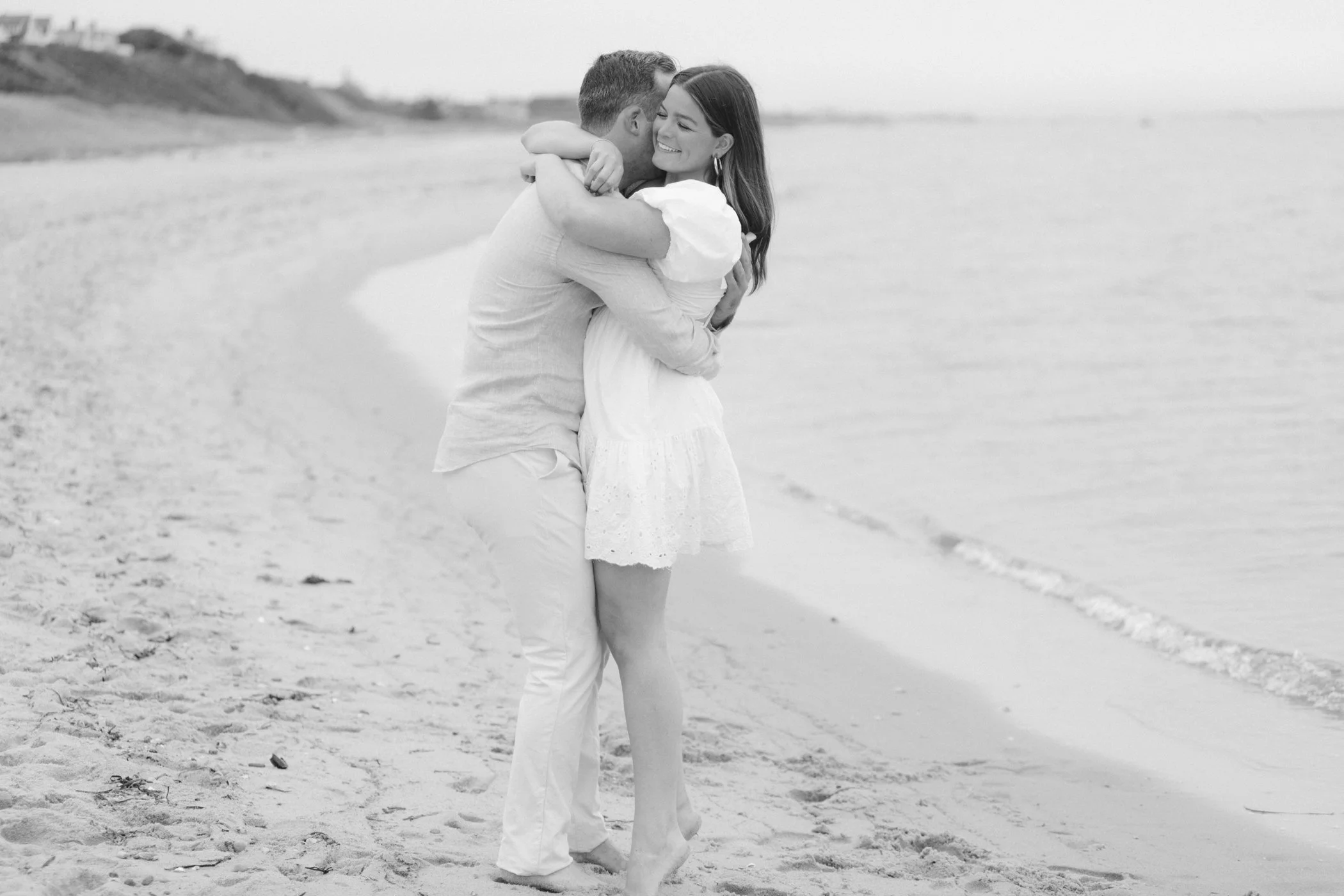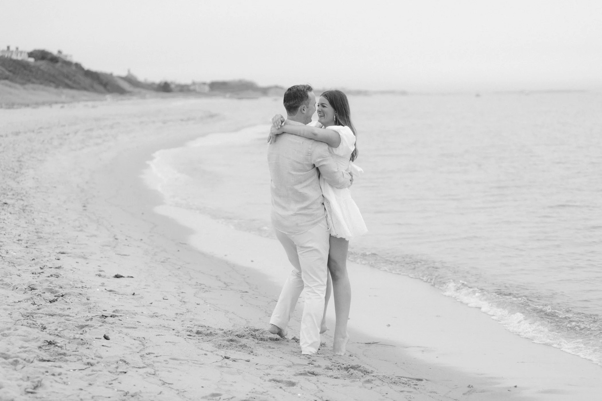 When I first chatted with Grace, one of the first things we talked about was the fact that I worked on both the East Coast and in Michigan. While she and Bo are going to get married in Grand Rapids summer of 2024, she desperately wanted engagement photos on Nantucket, where she and Bo summer every year and where Bo’s grandparents have a home. Luckily, our dates aligned and the week they were on Nantucket happened to be the week I was in Newport for a wedding, so I hopped the ferry (with the kids and nanny in tow!) and we made a day trip of it! We went to the Whaling Museum in the morning (highly recommend!), I photographed Grace and Bo in the afternoon while the nanny hung with the kids, and then we went shopping and had dinner before taking the ferry back to our hotel on the Cape. Even though it was raining, we still had an amazing day, and I LOVE how the photos turned out! A light drizzle isn’t always bad at the beach…it usually means its empty so no beach goers in the background! And no squinting because its overcast 🙂 . Here are a few of my favorites from their session!
