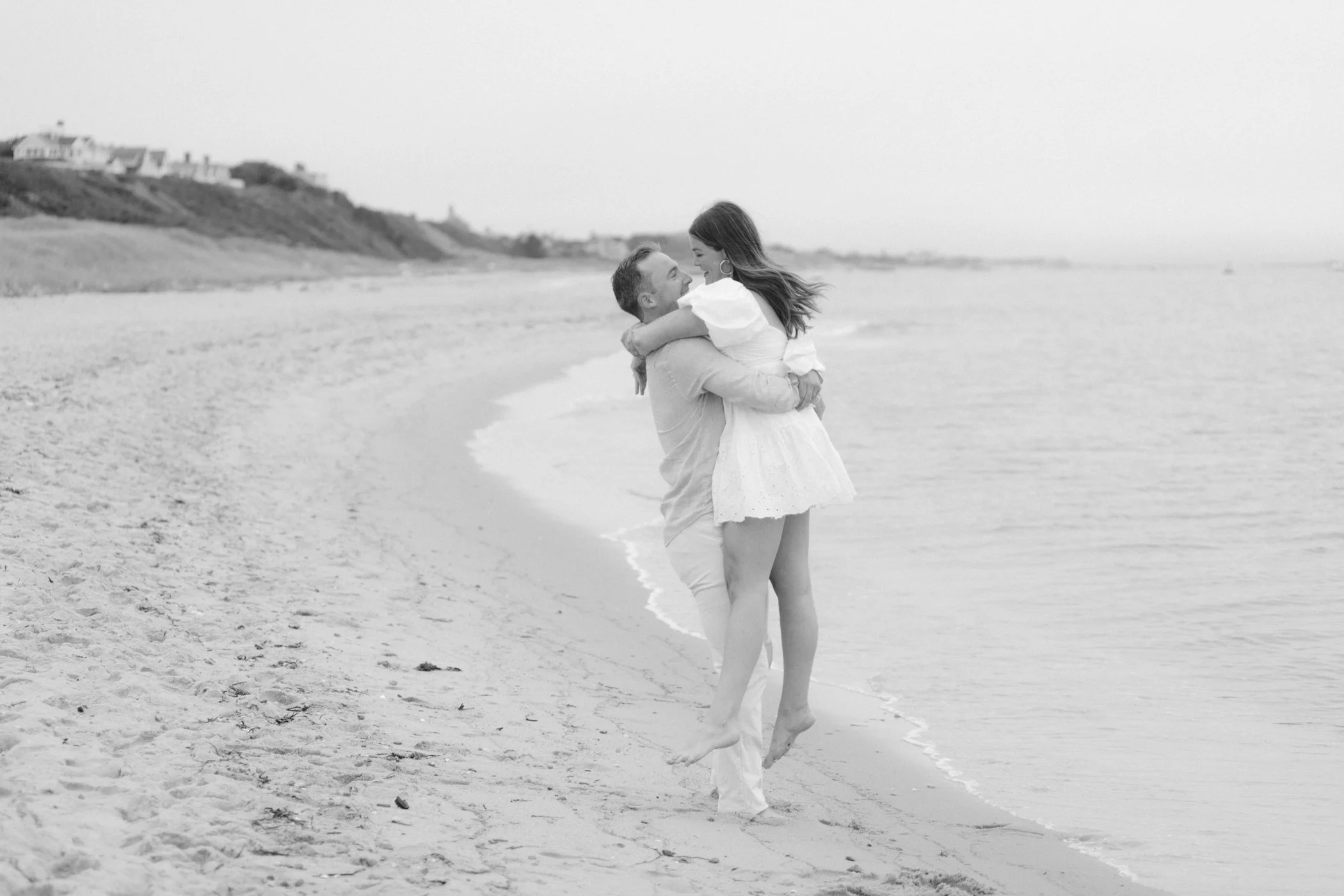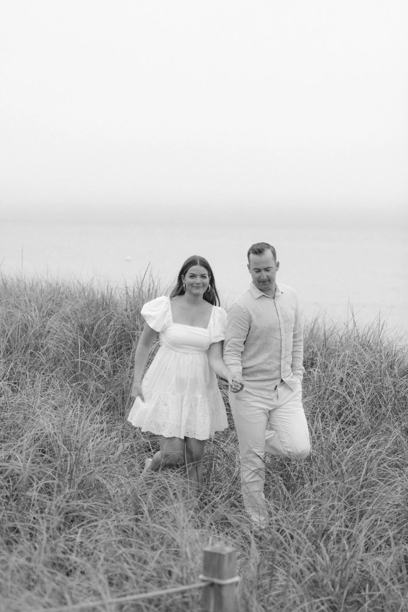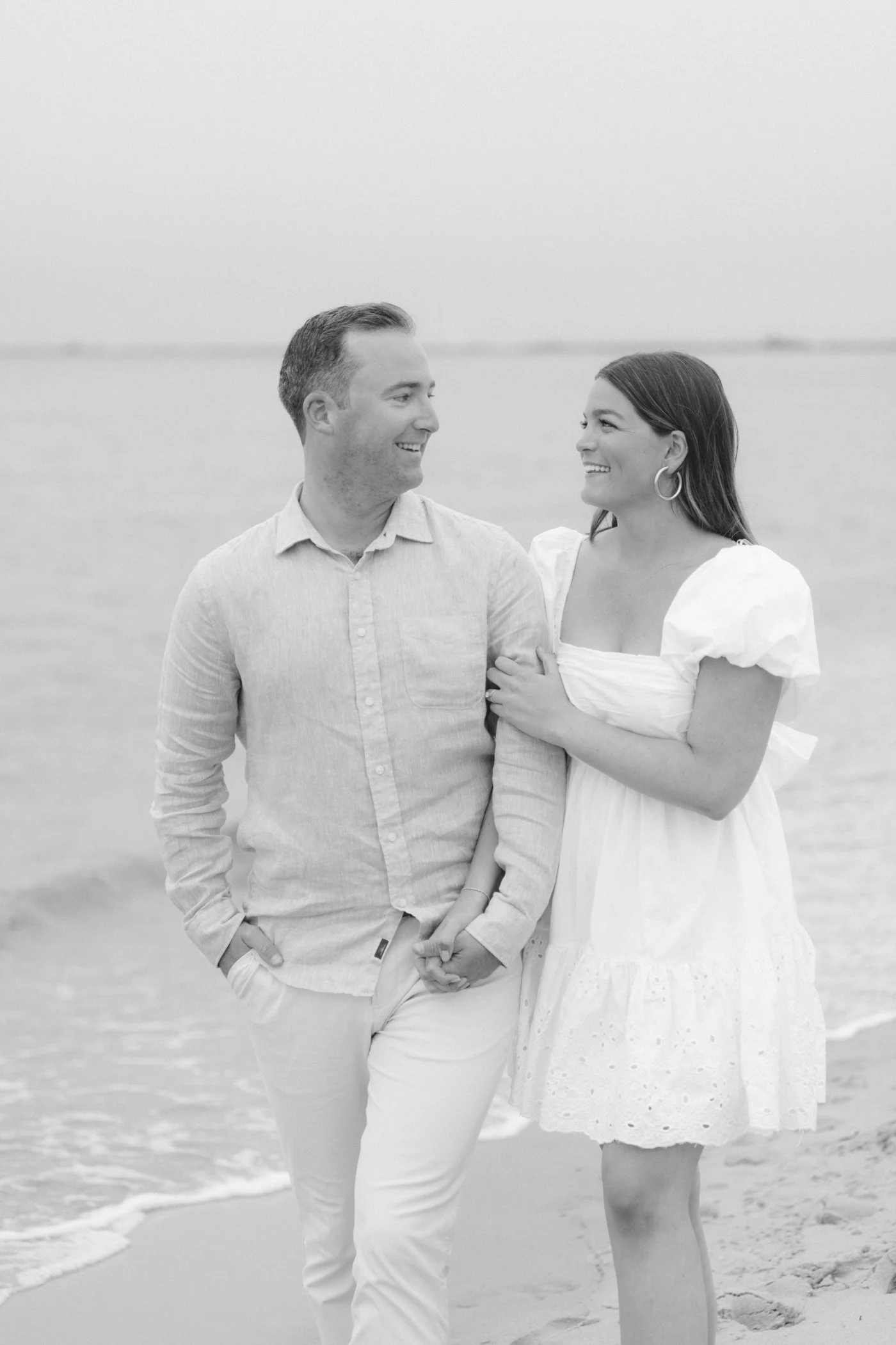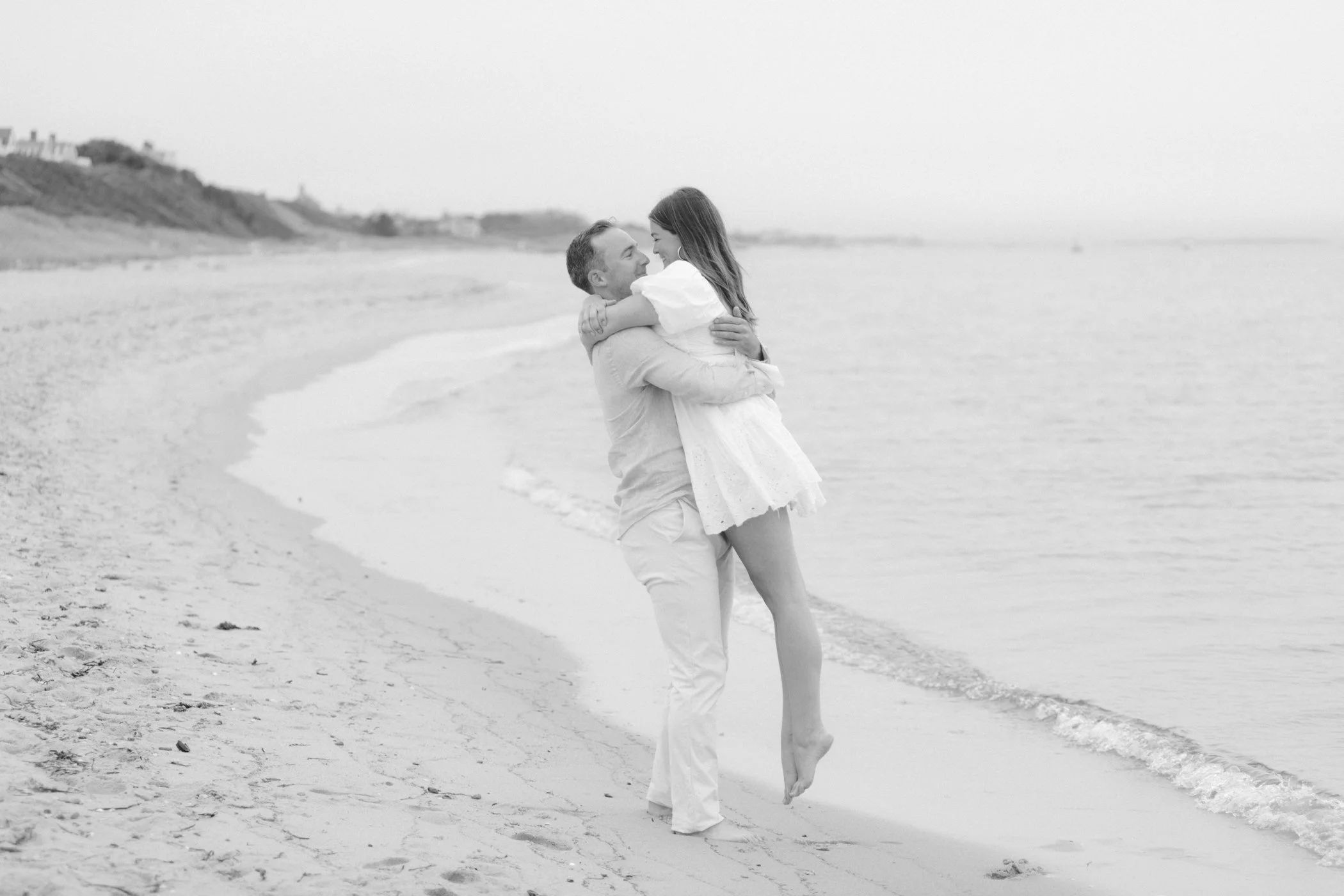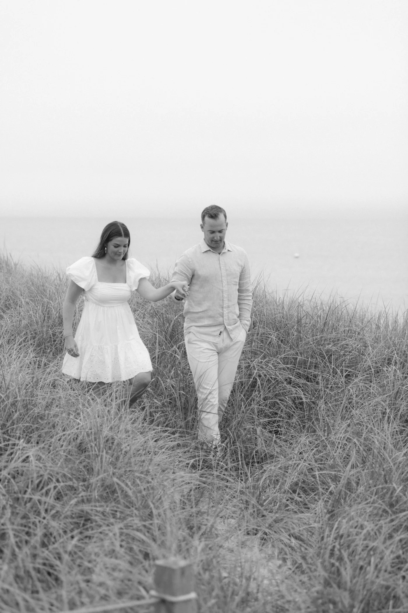 When I first chatted with Grace, one of the first things we talked about was the fact that I worked on both the East Coast and in Michigan. While she and Bo are going to get married in Grand Rapids summer of 2024, she desperately wanted engagement photos on Nantucket, where she and Bo summer every year and where Bo’s grandparents have a home. Luckily, our dates aligned and the week they were on Nantucket happened to be the week I was in Newport for a wedding, so I hopped the ferry (with the kids and nanny in tow!) and we made a day trip of it! We went to the Whaling Museum in the morning (highly recommend!), I photographed Grace and Bo in the afternoon while the nanny hung with the kids, and then we went shopping and had dinner before taking the ferry back to our hotel on the Cape. Even though it was raining, we still had an amazing day, and I LOVE how the photos turned out! A light drizzle isn’t always bad at the beach…it usually means its empty so no beach goers in the background! And no squinting because its overcast 🙂 . Here are a few of my favorites from their session!