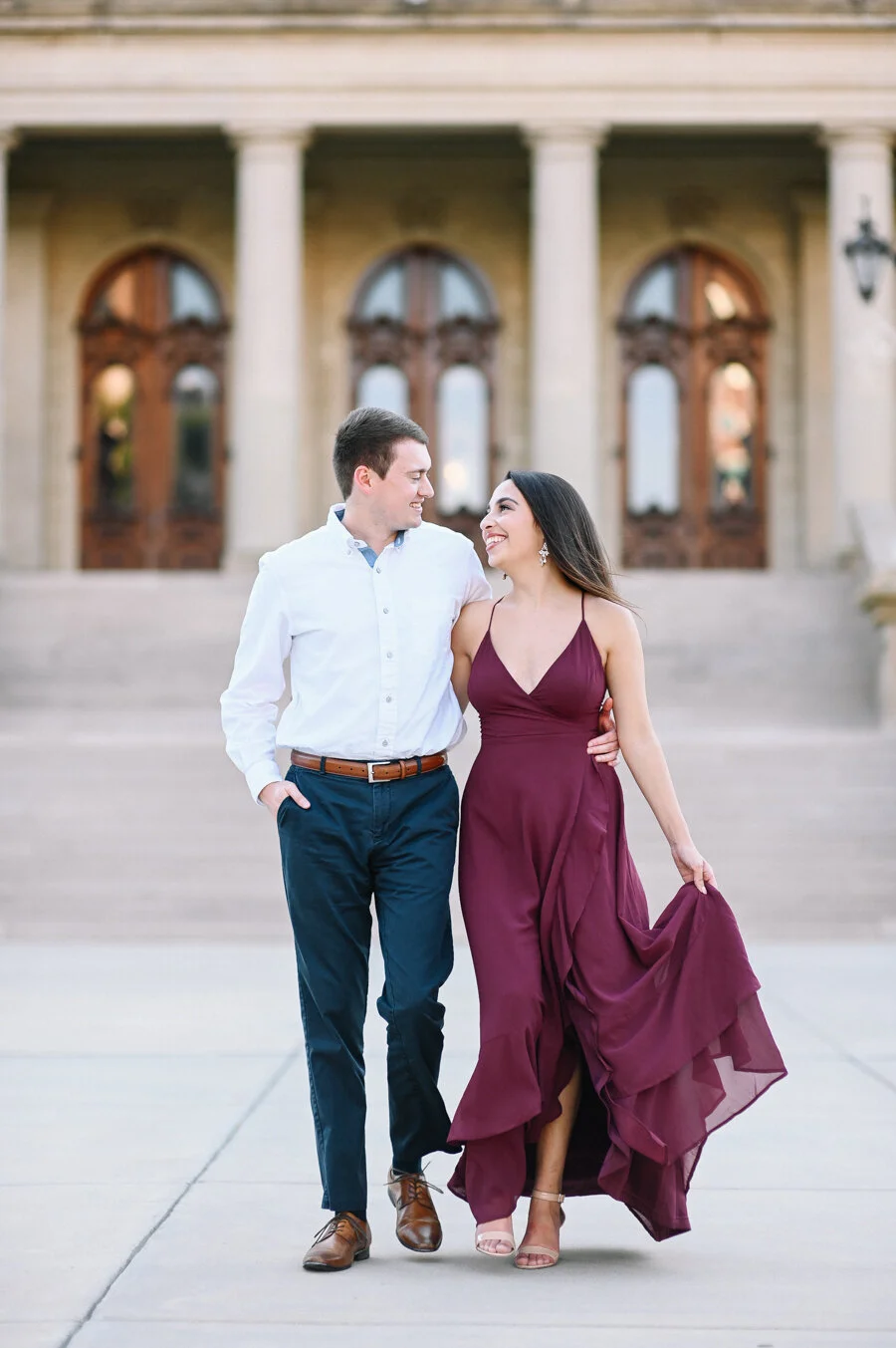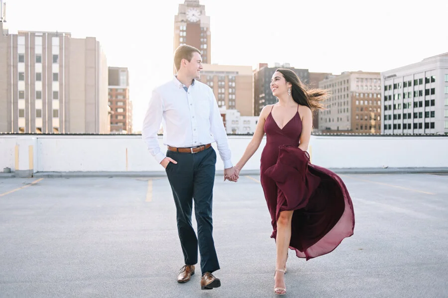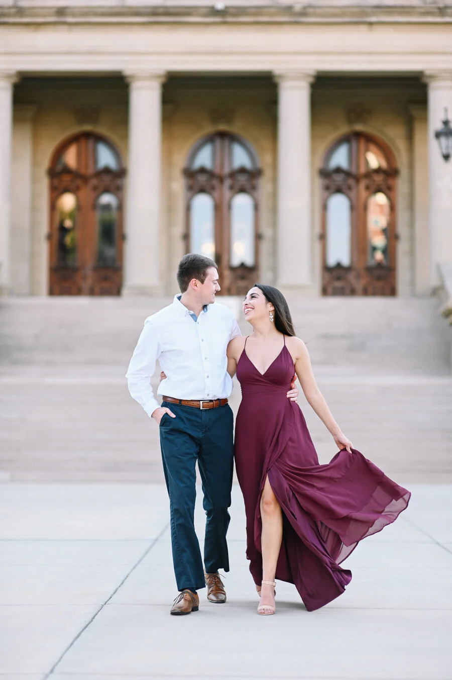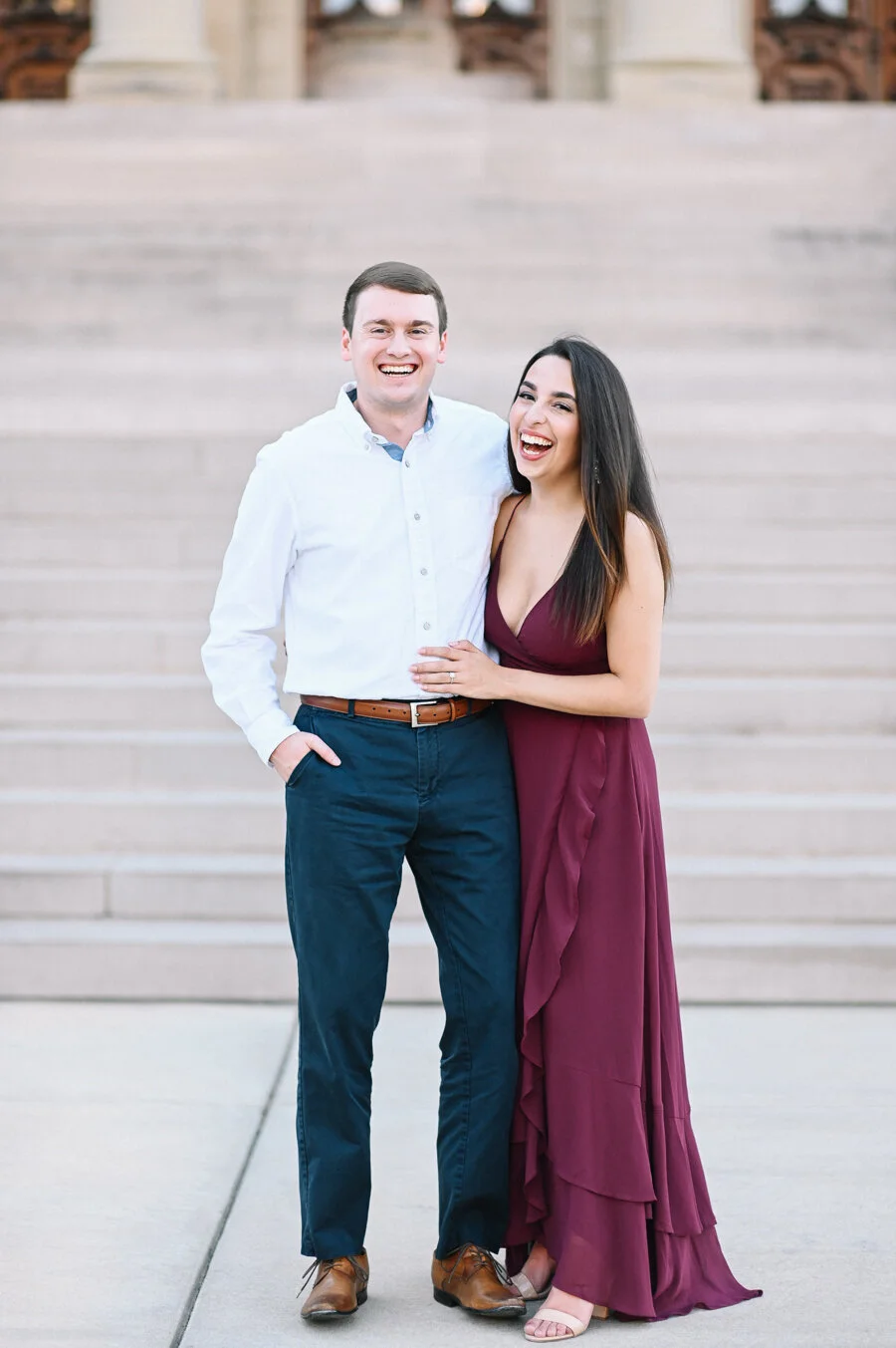 This session was one of my favorites of 2020. Haley and Derek chose to reschedule their August 22, 2020 wedding to August, 2021 due to COVID. However, they wanted to do something special on their original wedding date. They already had their fall engagement session in 2019, but decided a second engagement session on their original date would be a great way to celebrate. They got all dressed up, went out to dinner, and then headed to downtown Lansing for some photos at the Capitol building and on the rooftop of a parking garage with a view of the city.