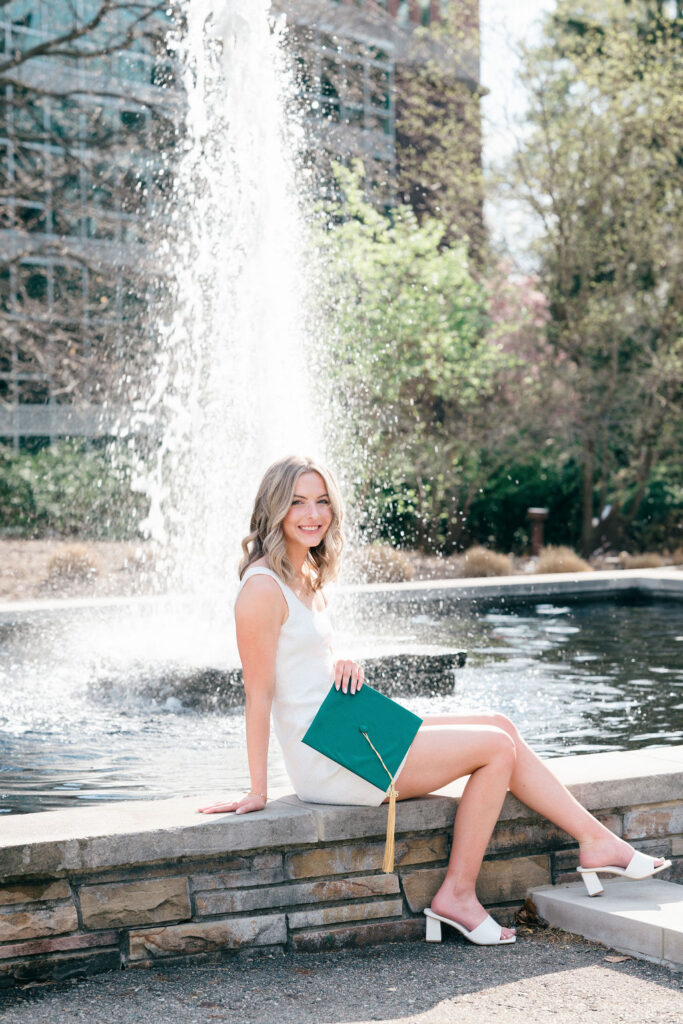 Right out front, you get soft blooms and water. Vibes that feels light and fun by the fountain, plus classy/classic in front of the flowers. It’s perfect for spraying champagne if lines are too long at Beaumont, candid laughs, and those “I’m done with finals forever” shots.