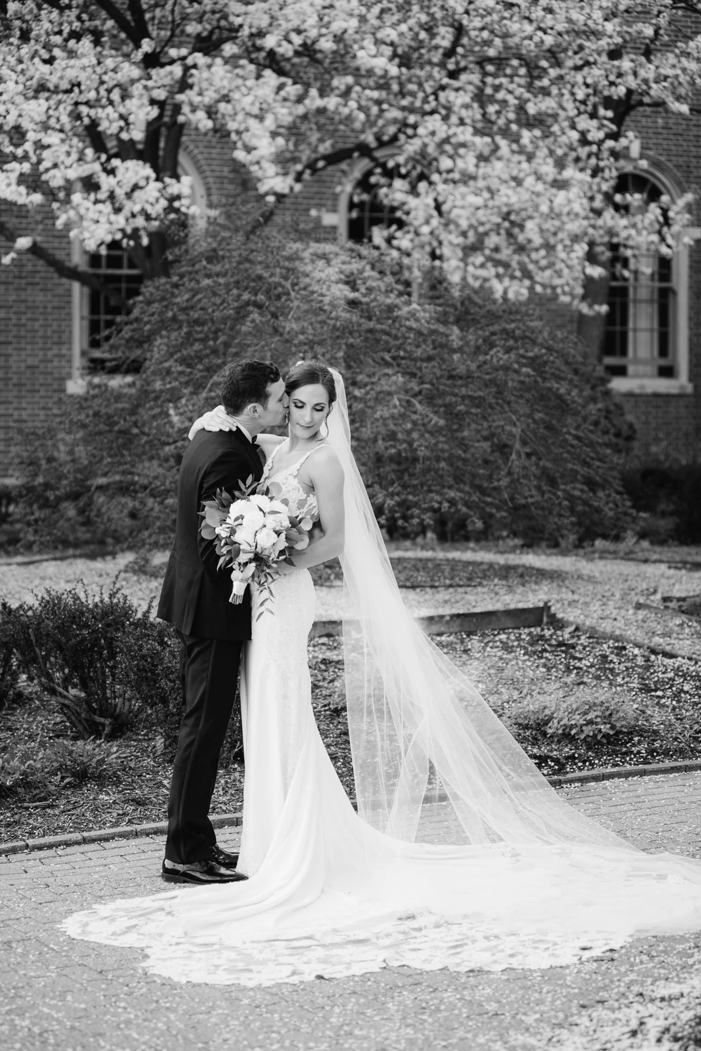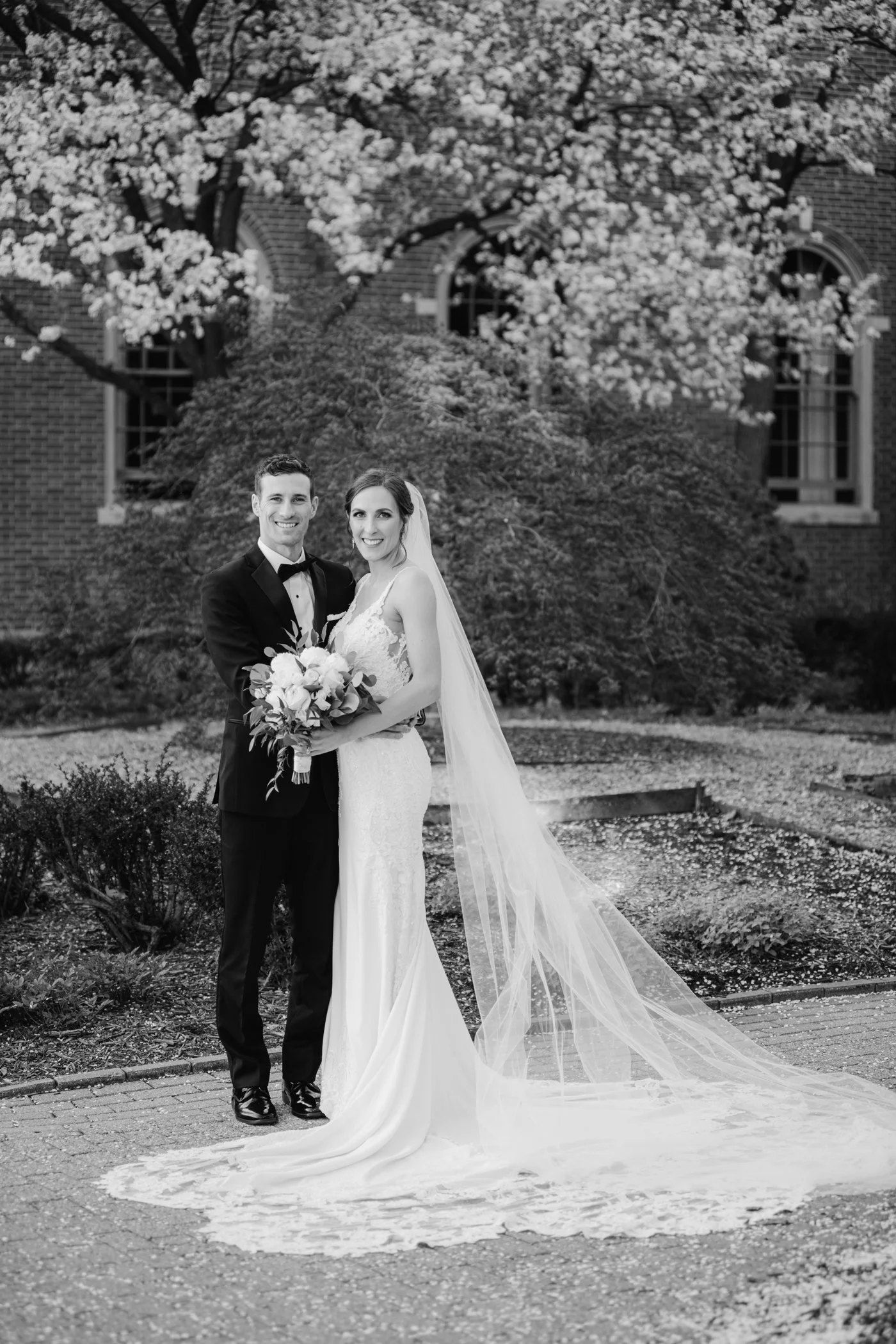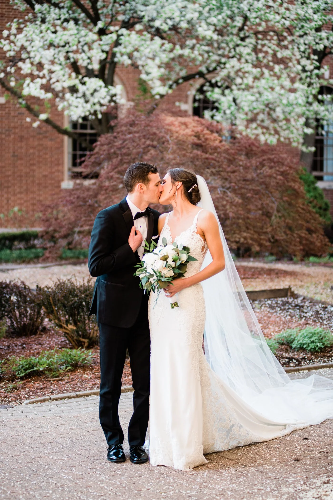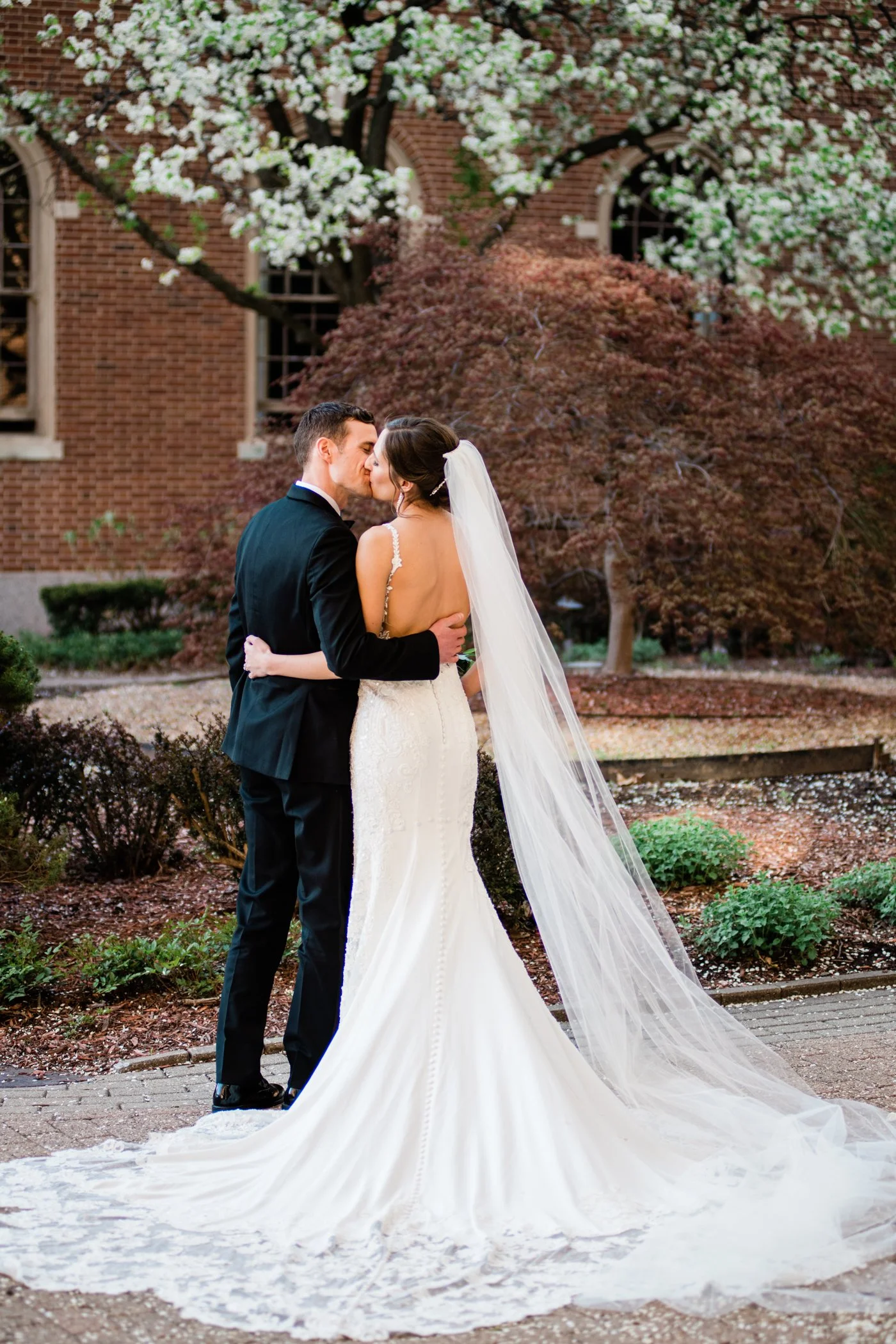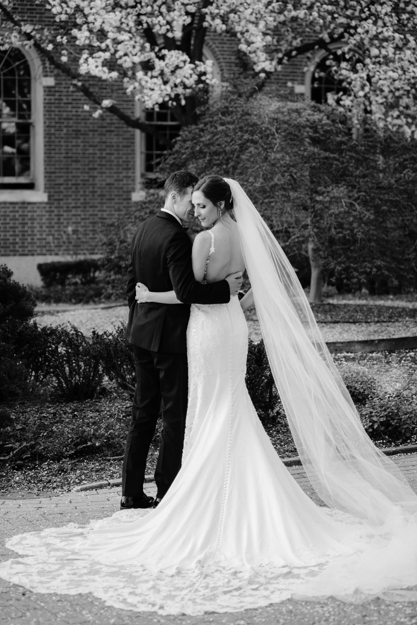 Megan and Brad were originally supposed to be married in April 2021, but indoor weddings were still restricted in Michigan at that time, so they decided to postpone until spring of 2022. They ended up with the most gorgeous weather- sunny and no humidity, in the 70s with a light breeze. There were pink and white blooming trees everywhere which really made the portraits look extra beautiful.