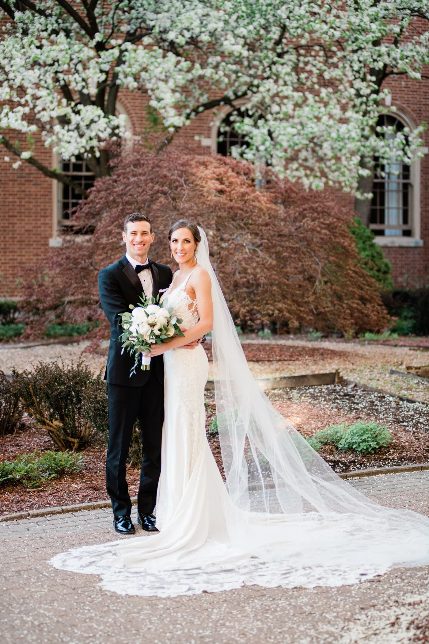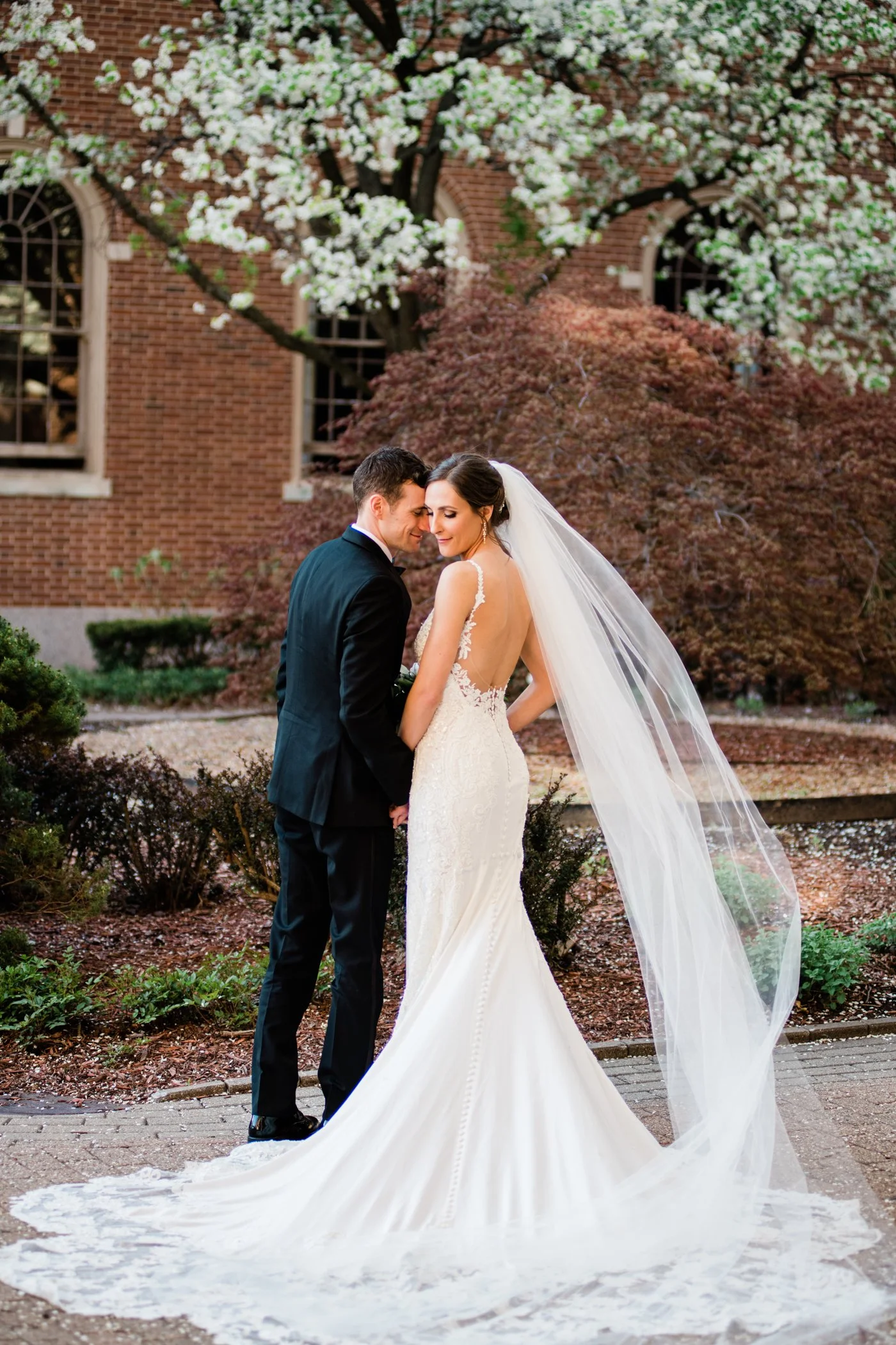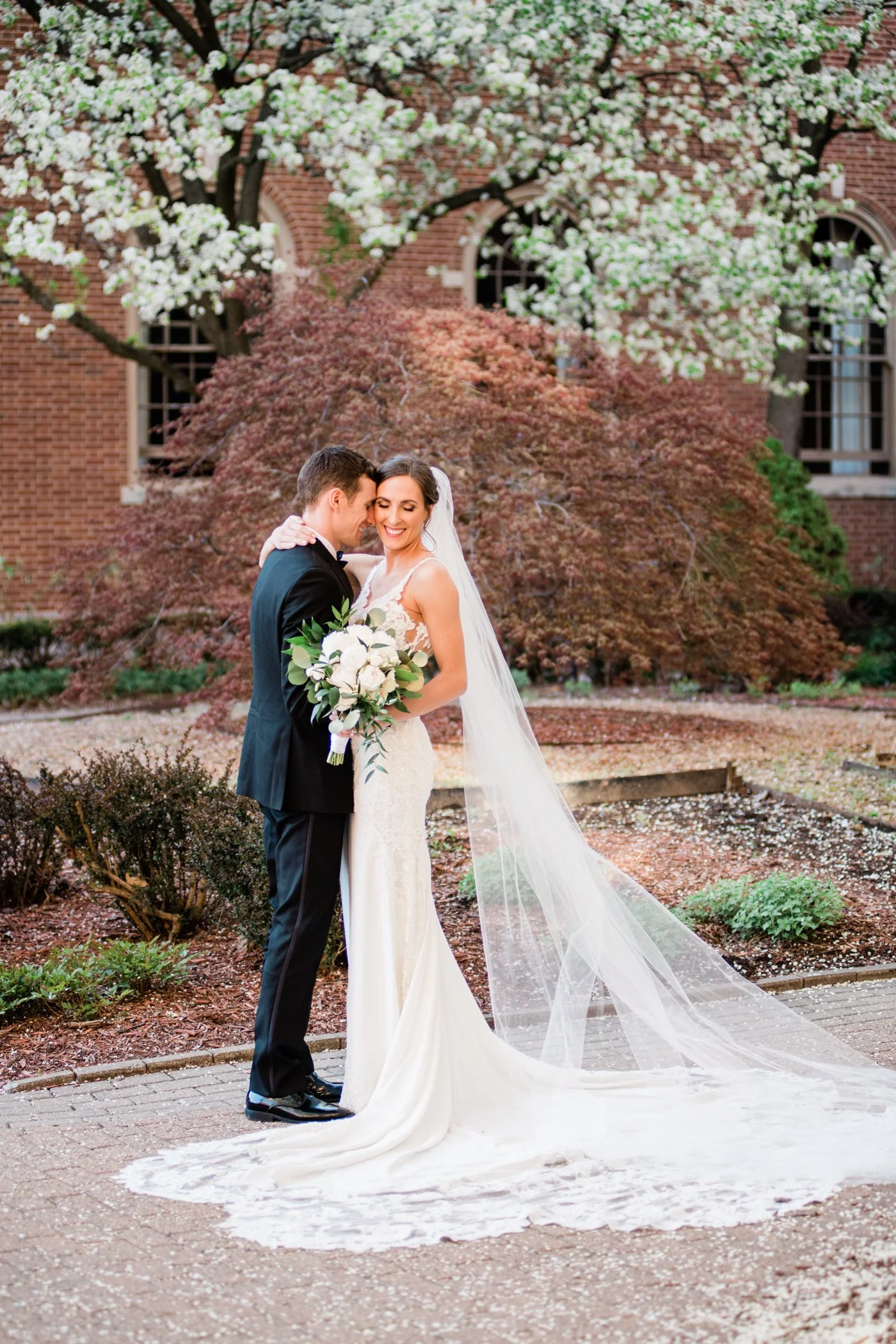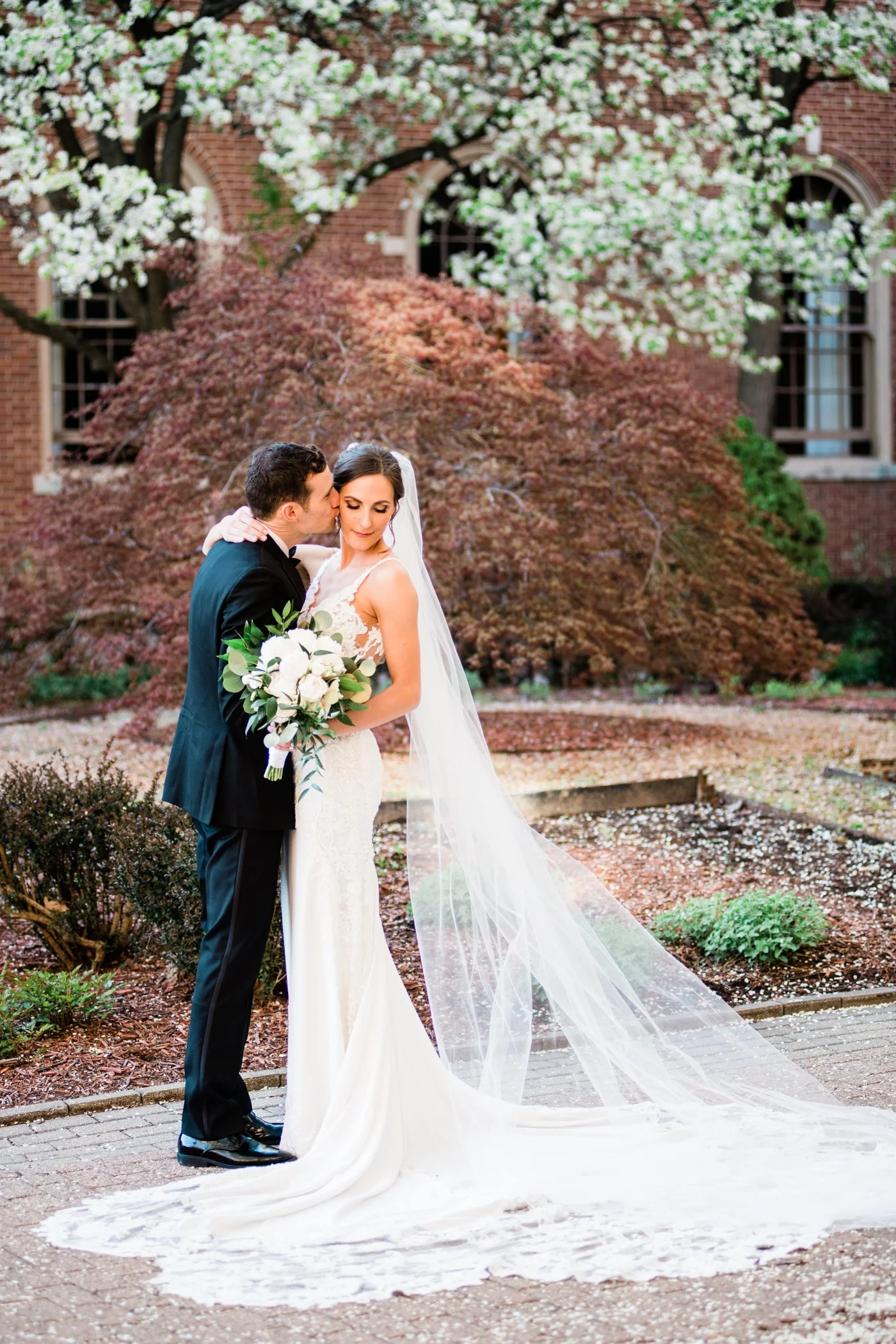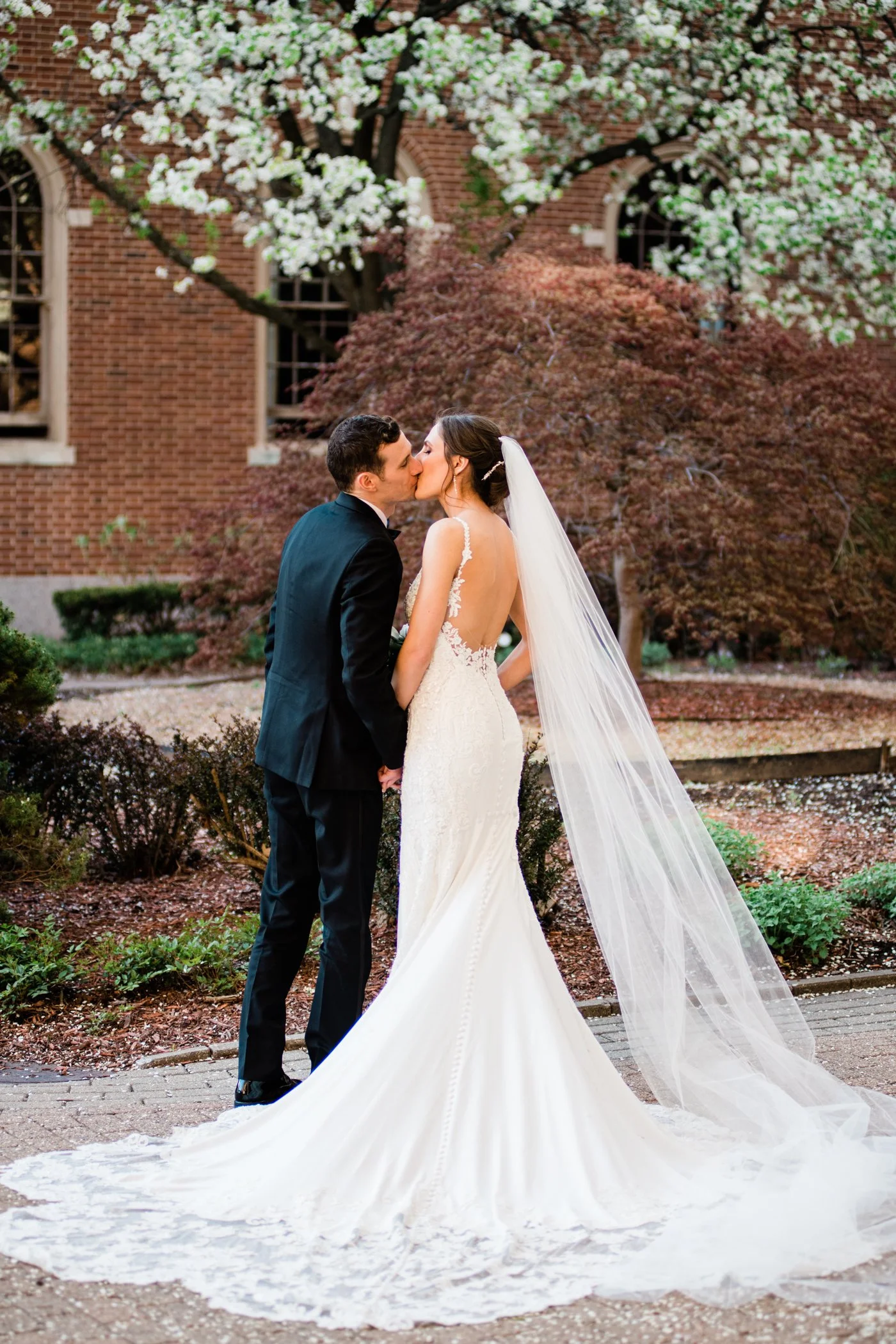Megan and Brad were originally supposed to be married in April 2021, but indoor weddings were still restricted in Michigan at that time, so they decided to postpone until spring of 2022. They ended up with the most gorgeous weather- sunny and no humidity, in the 70s with a light breeze. There were pink and white blooming trees everywhere which really made the portraits look extra beautiful.