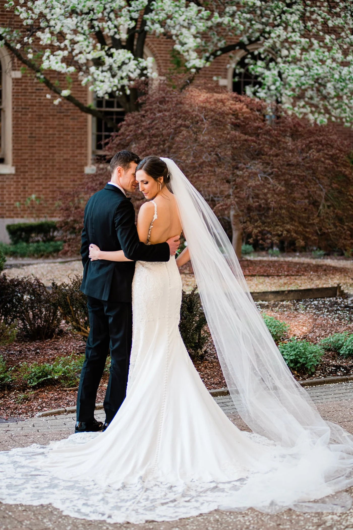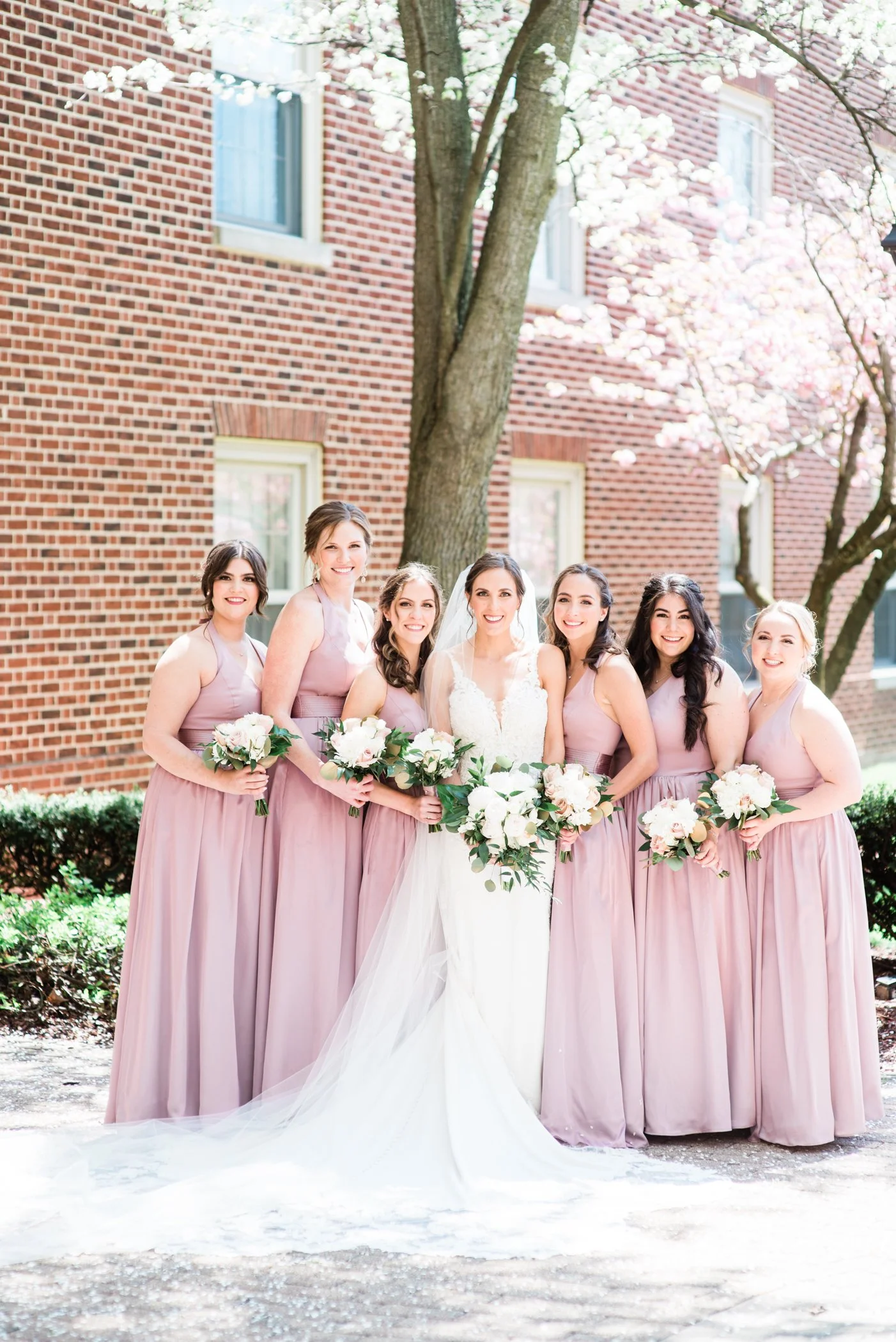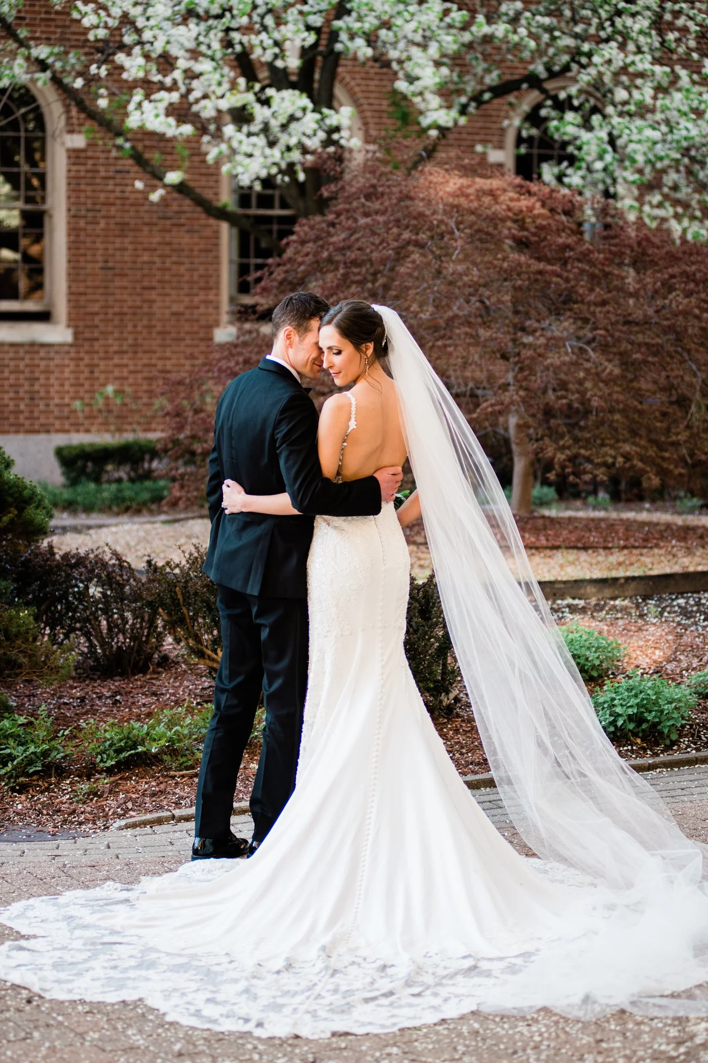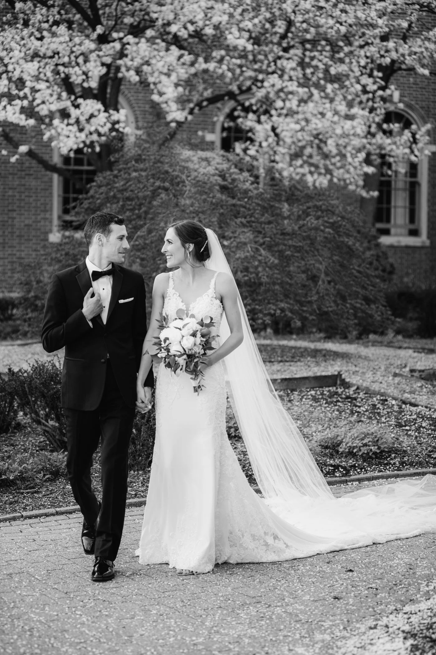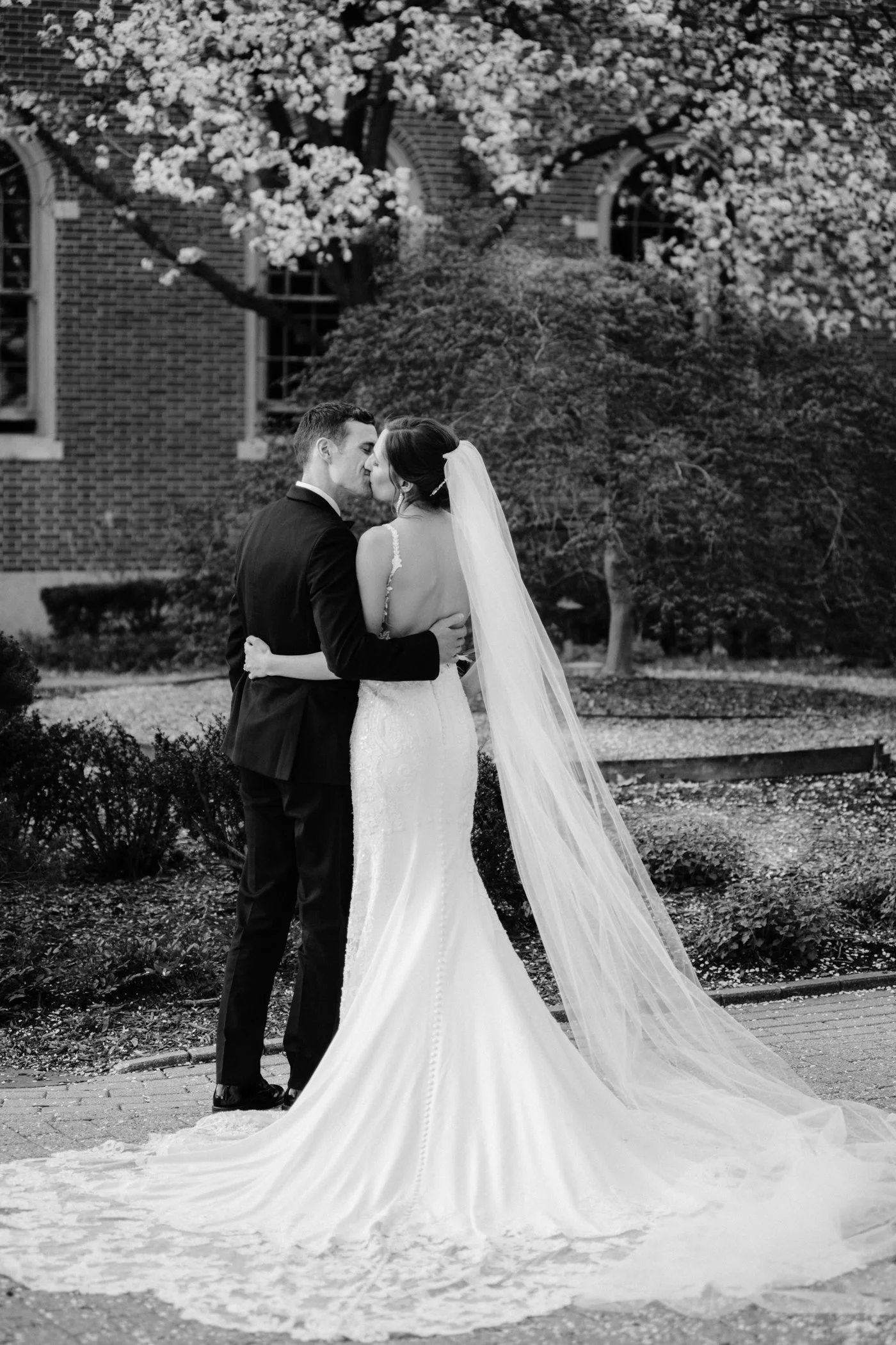 Megan and Brad were originally supposed to be married in April 2021, but indoor weddings were still restricted in Michigan at that time, so they decided to postpone until spring of 2022. They ended up with the most gorgeous weather- sunny and no humidity, in the 70s with a light breeze. There were pink and white blooming trees everywhere which really made the portraits look extra beautiful.